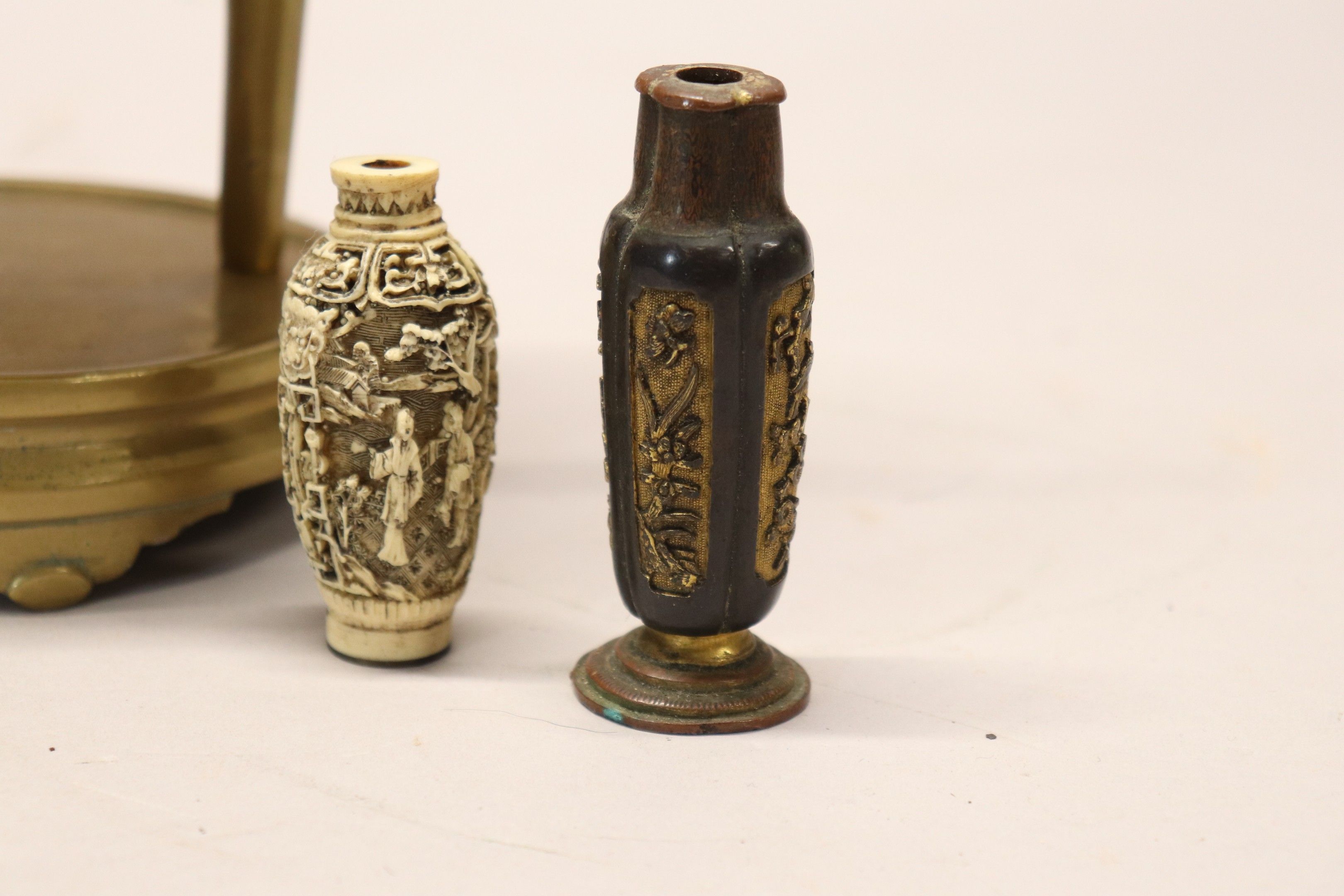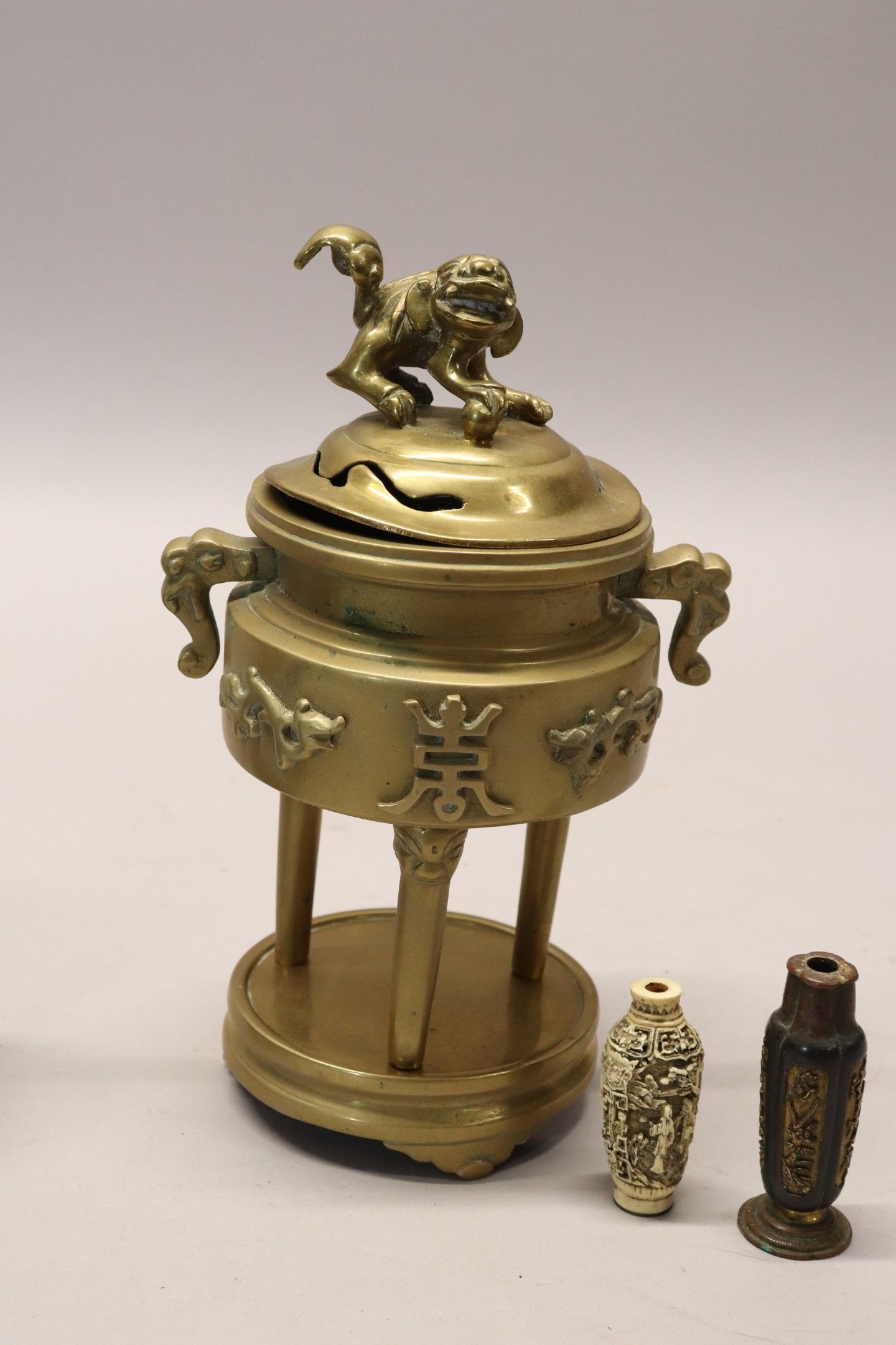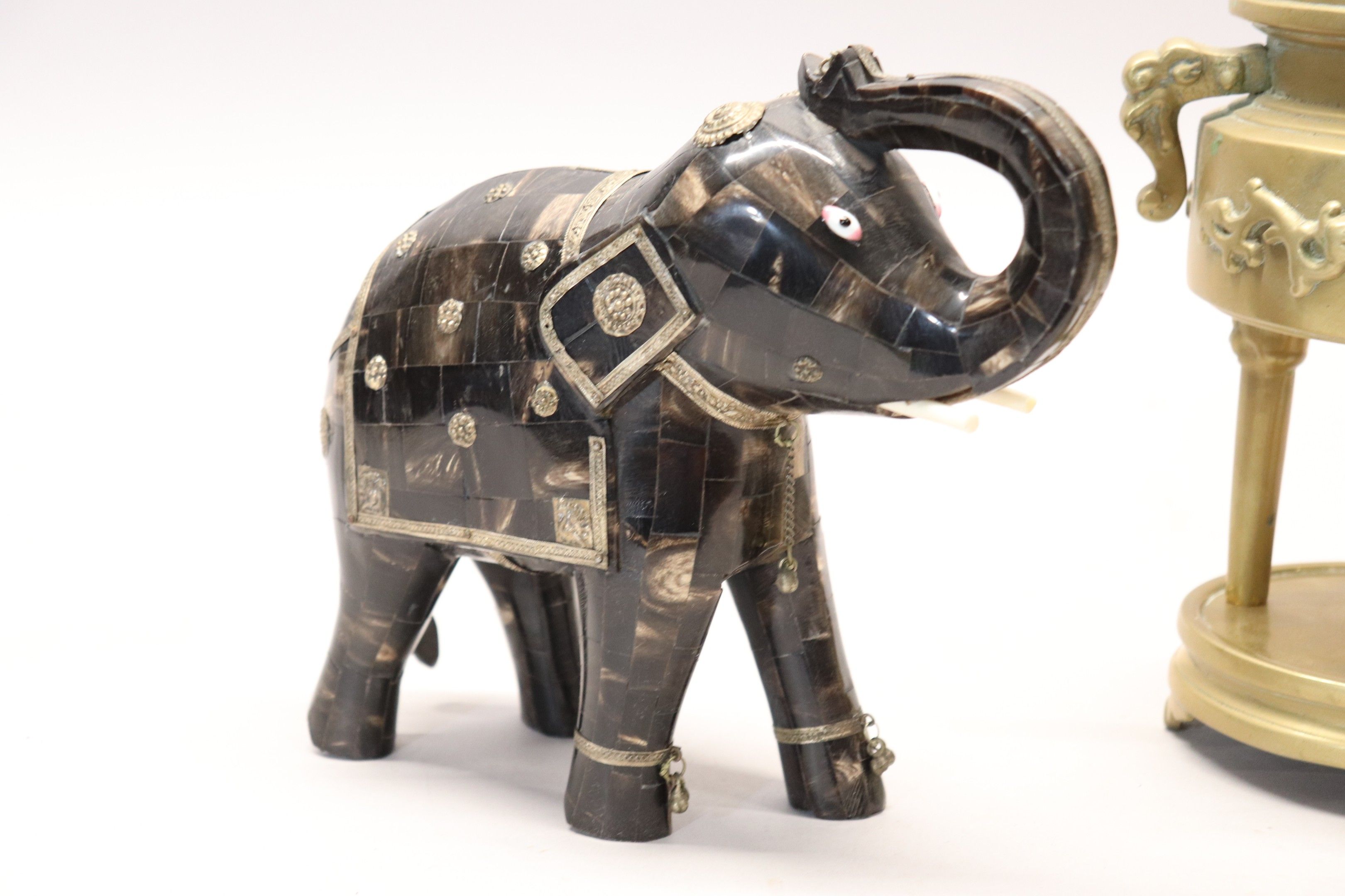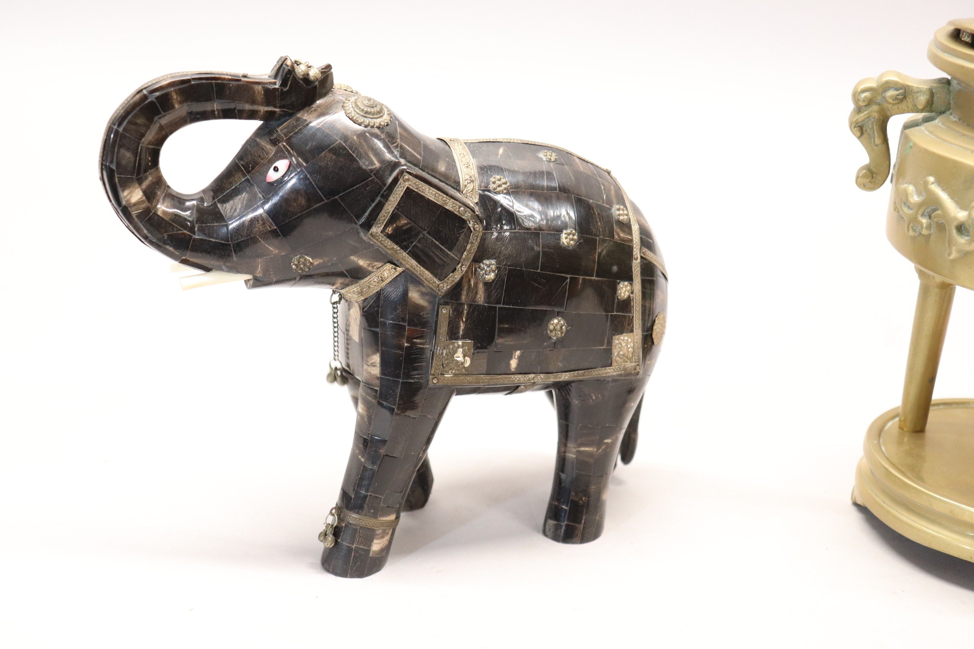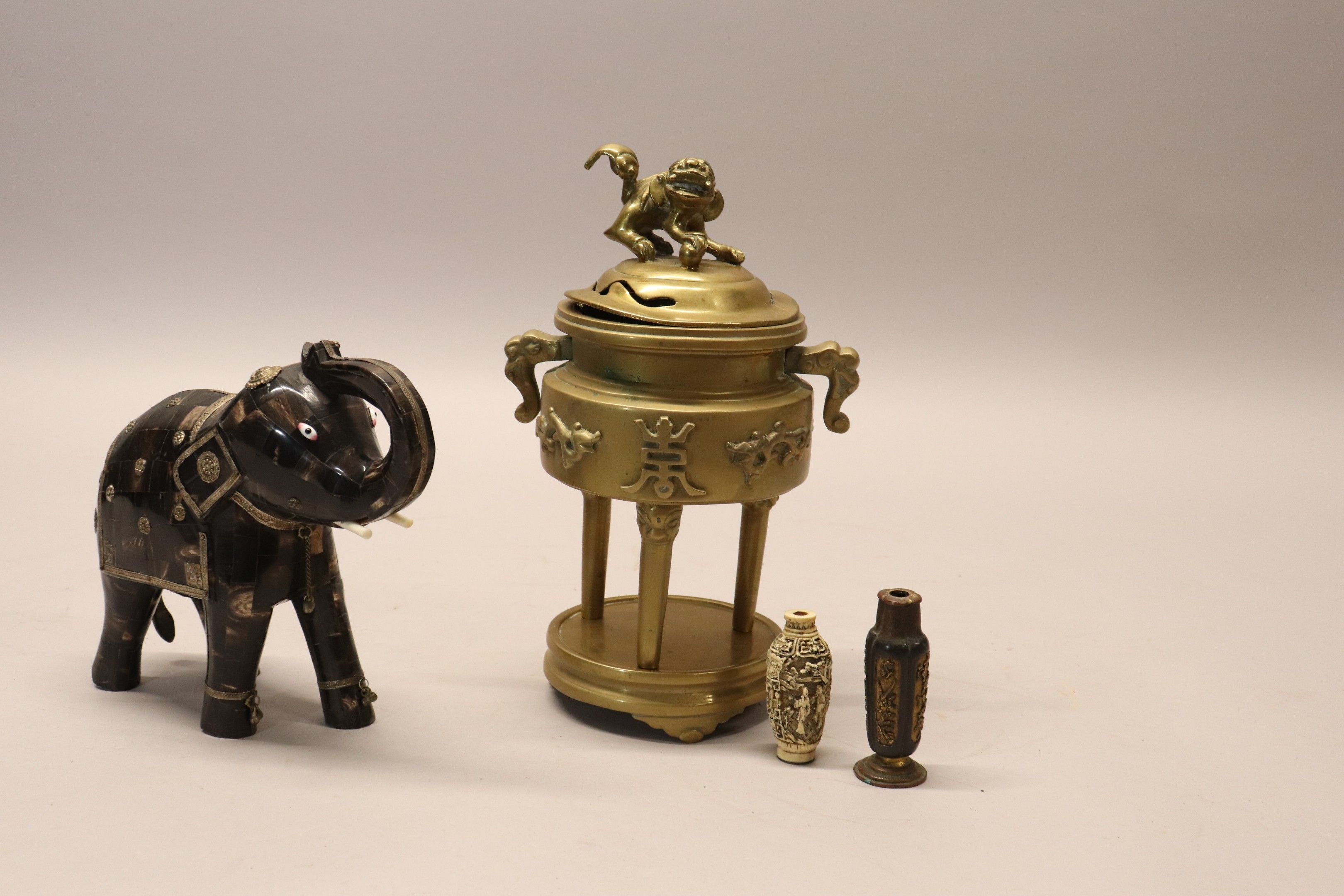Asia - travel souvenirs: a gilt bronze perfume burner, China (ht 28 cm), a resin snuffbox and another in patinated bronze (lids missing. ht 7.5 and 9 cm), an elephant in hardwood marquetry and silvered metal cabochons and fillets, India (ht 19 cm).