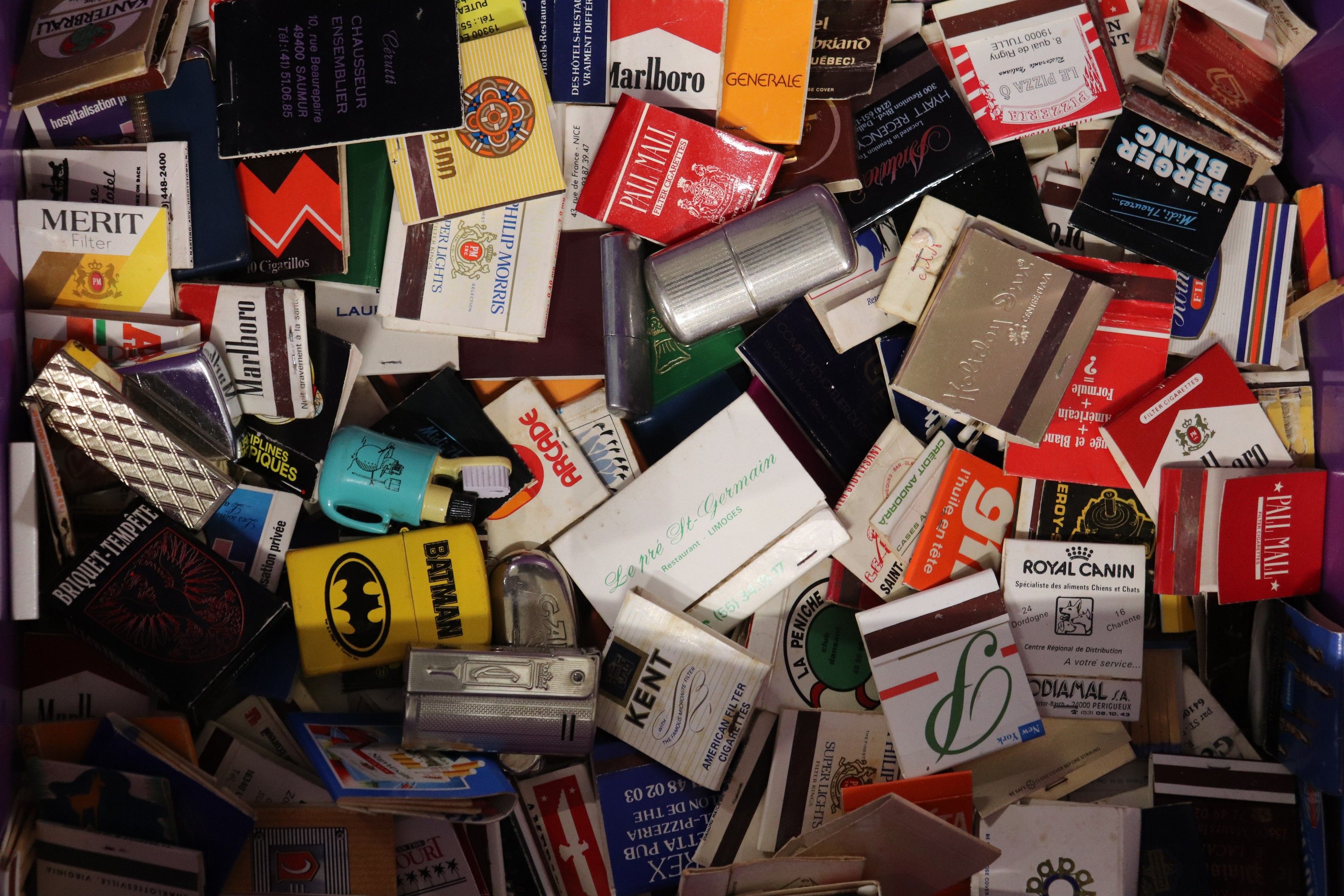 Collections: large collection of advertising matchboxes, lighters, collection of fèvres, collection of pins (approx. 300), collection of key rings.