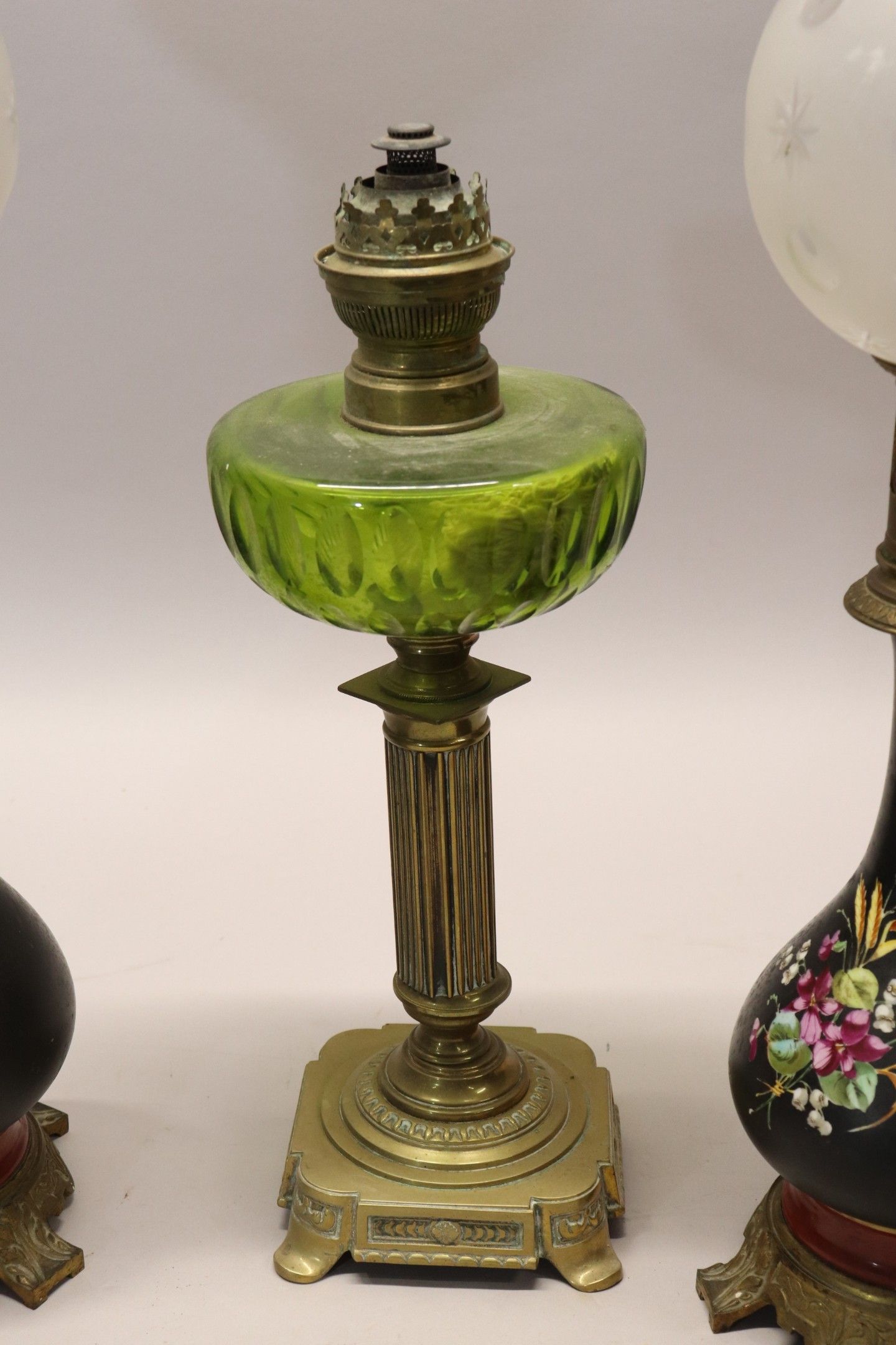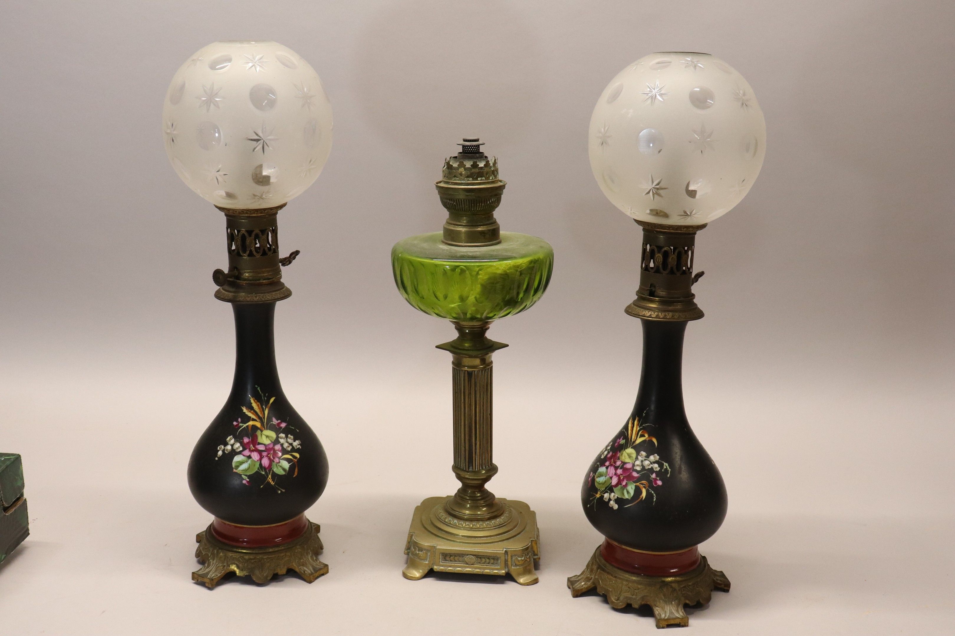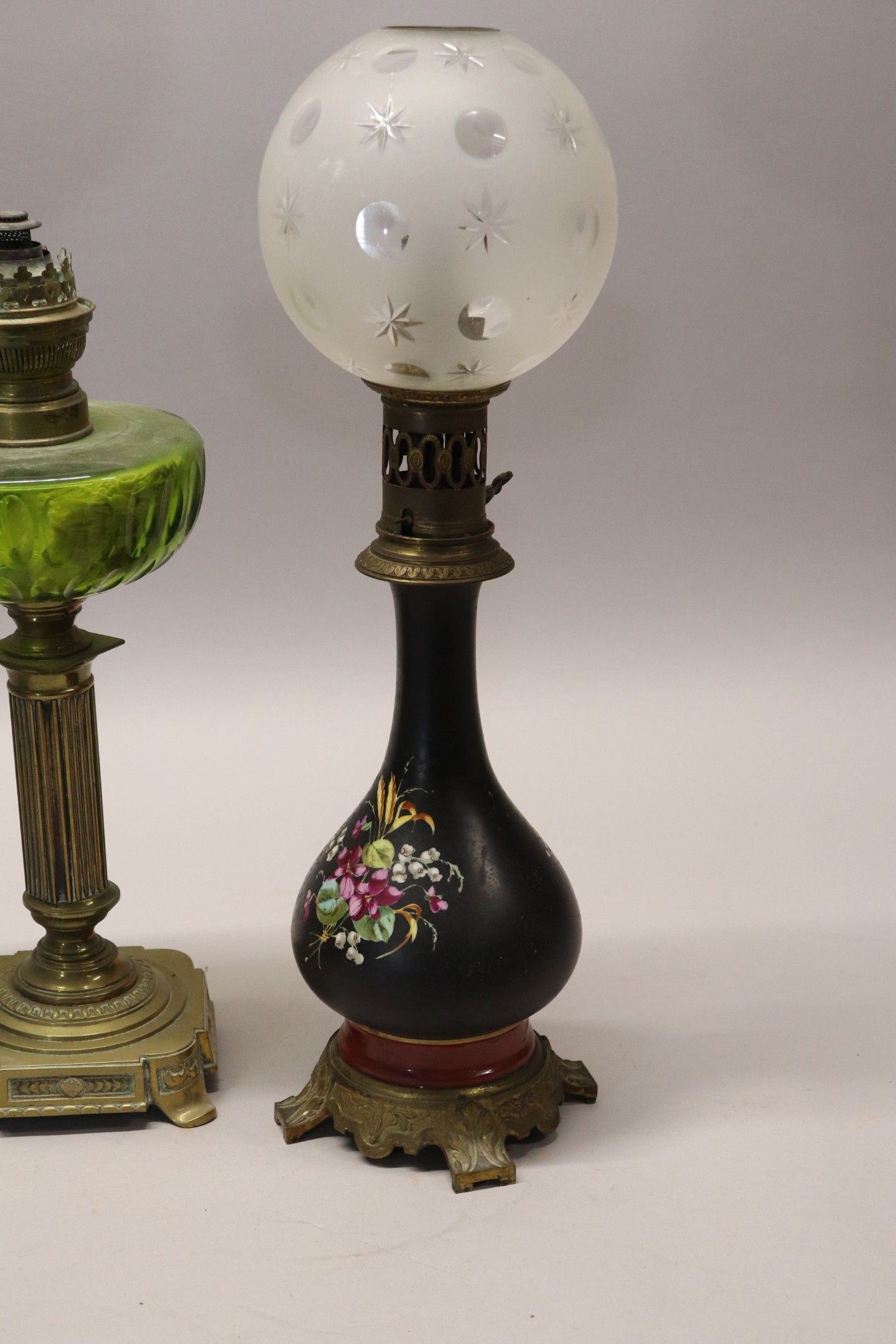A pair of painted porcelain paraffin lamps with flower motifs, Napoleon III gilt bronze mounts, one with a metal shaft, green glass reservoir. Max height 46 cm