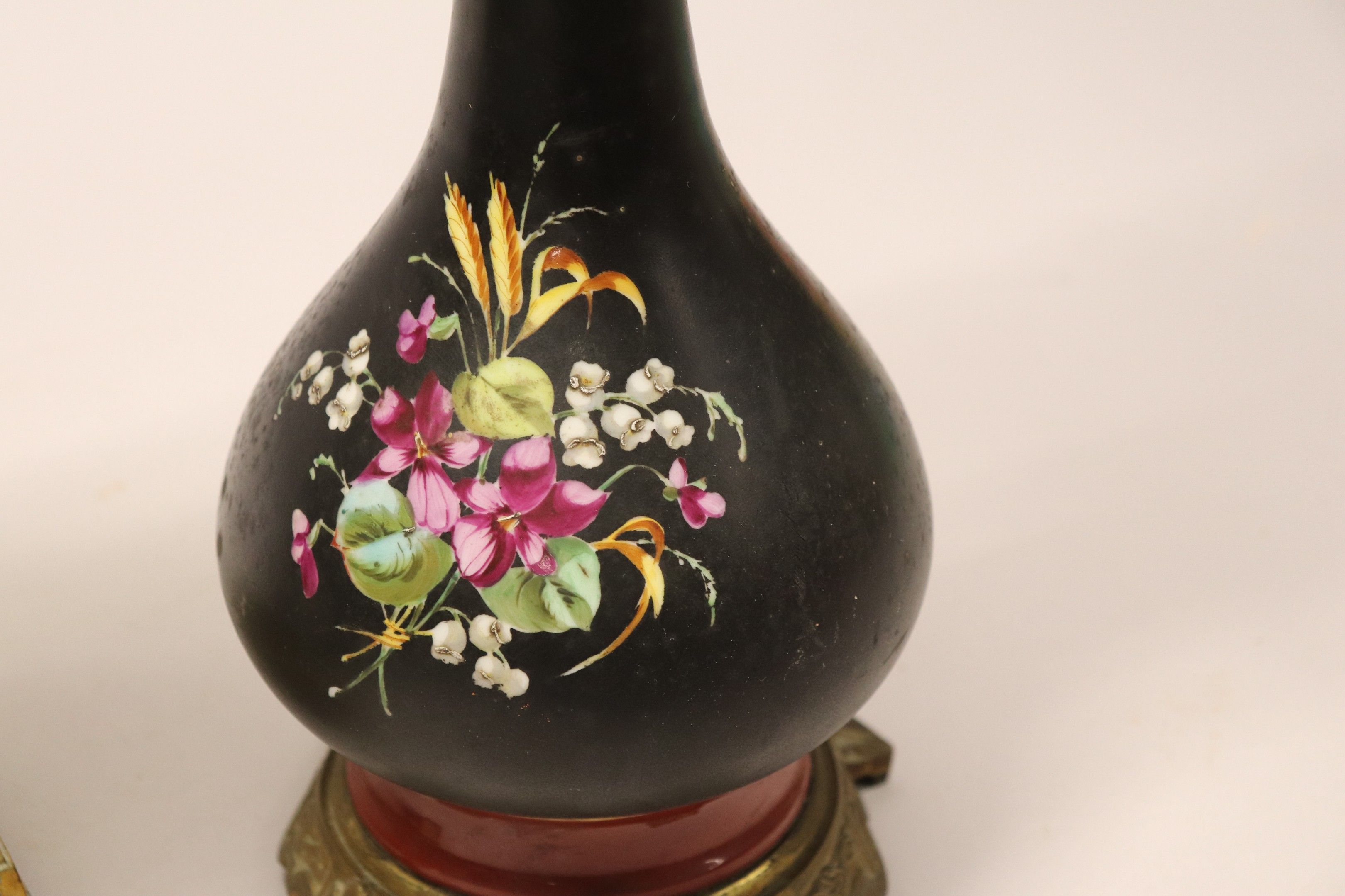 A pair of painted porcelain paraffin lamps with flower motif…