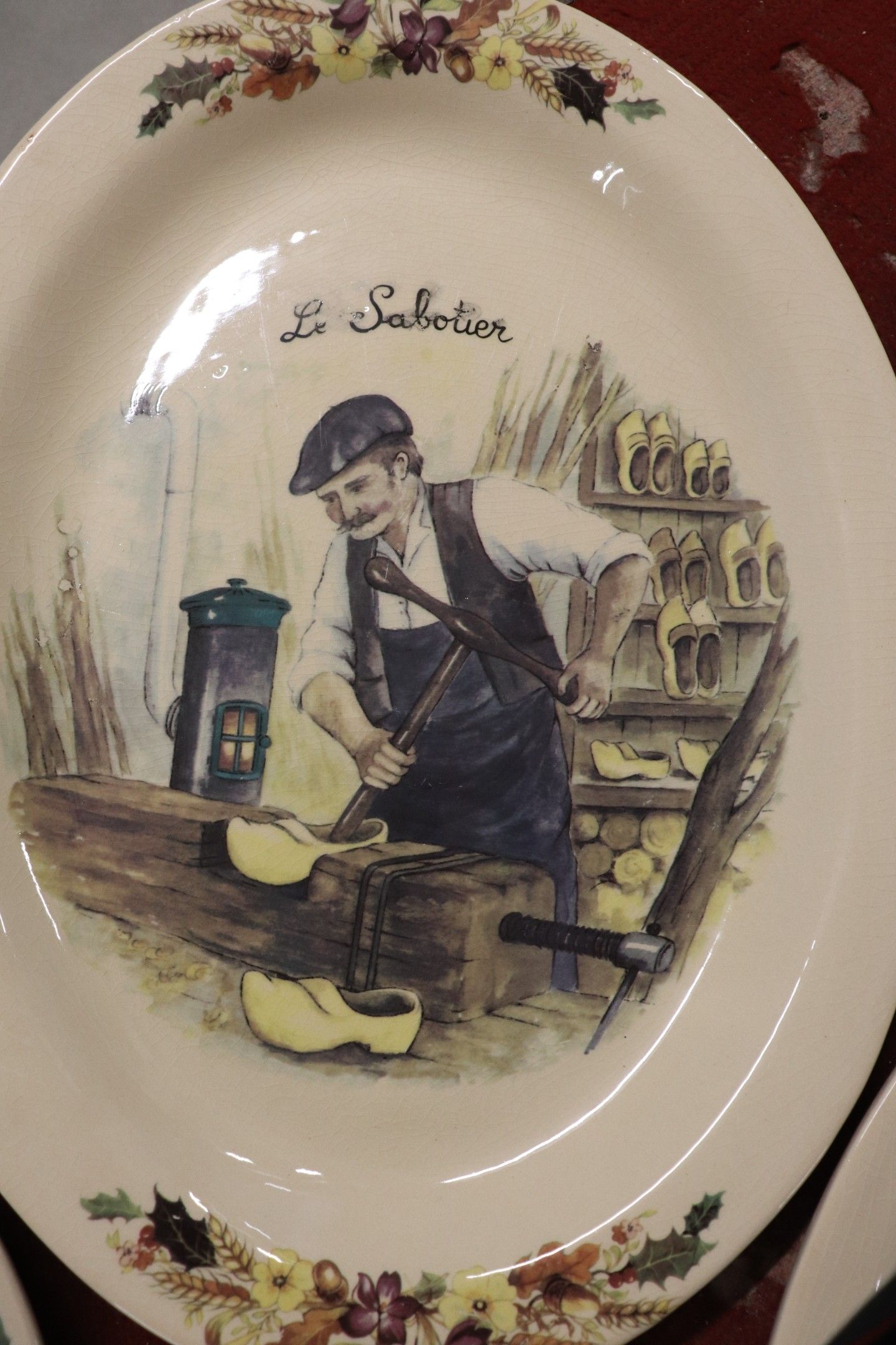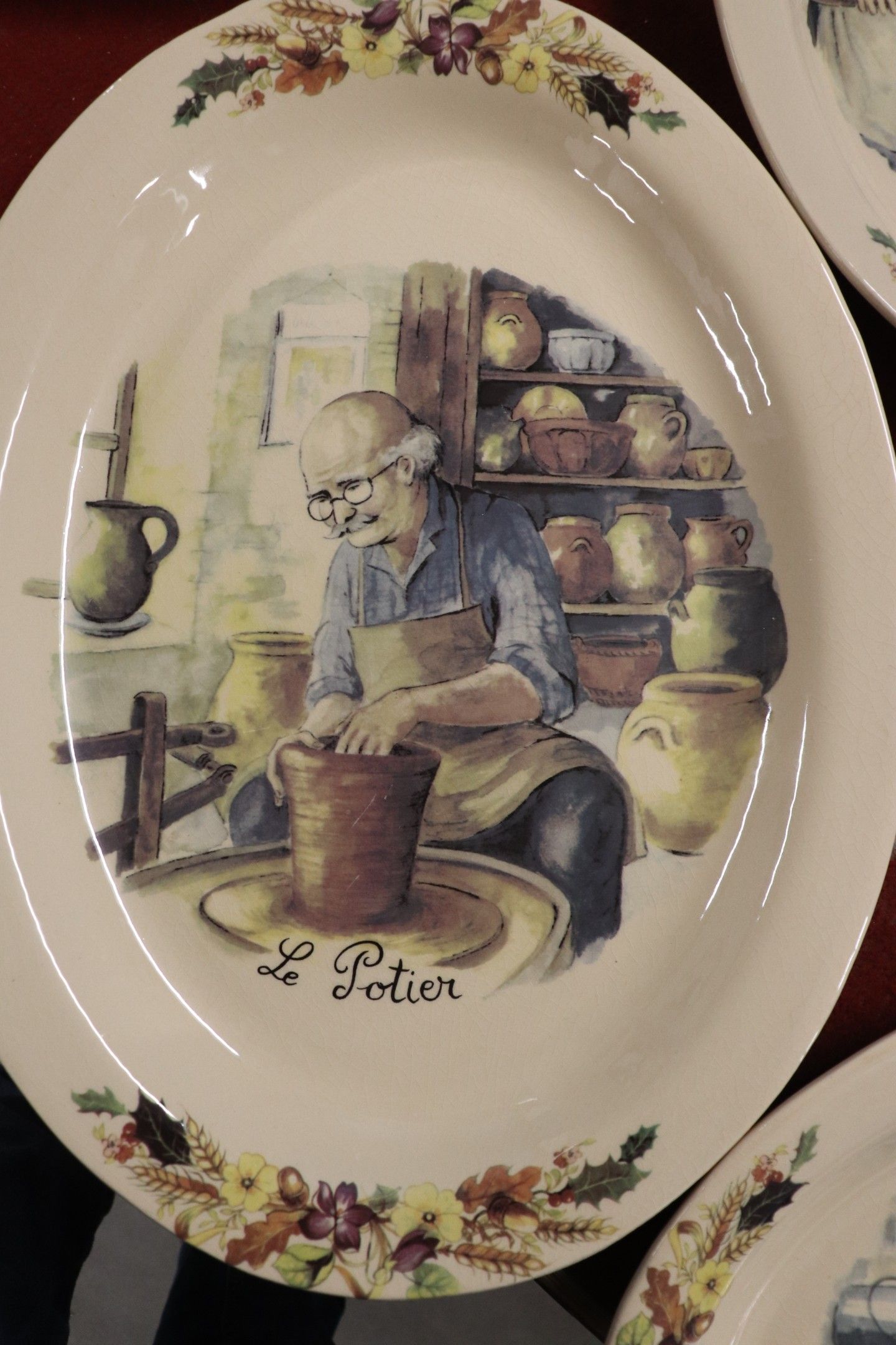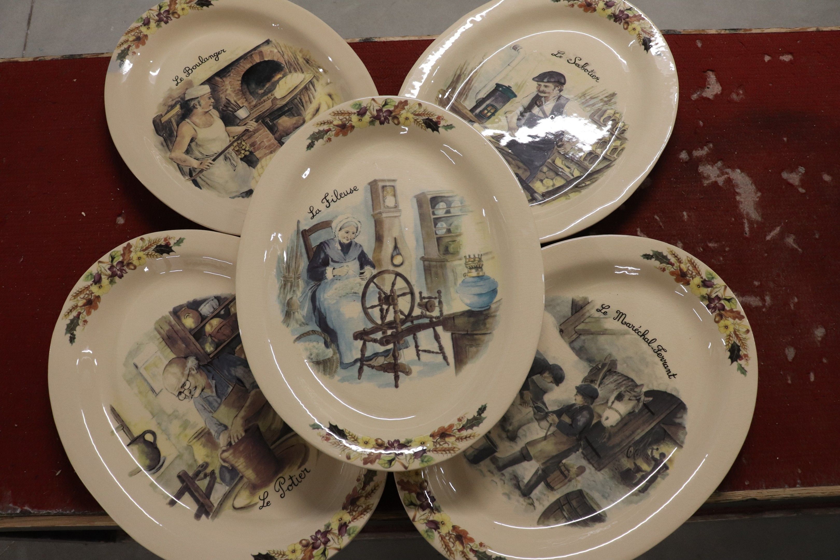 Five glazed ceramic oval serving dishes decorated with trades: blacksmith, clog maker, baker, spinner, potter. 47 x 36 cm