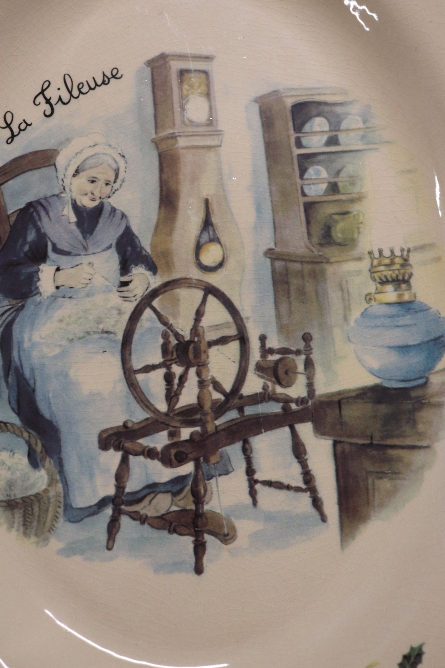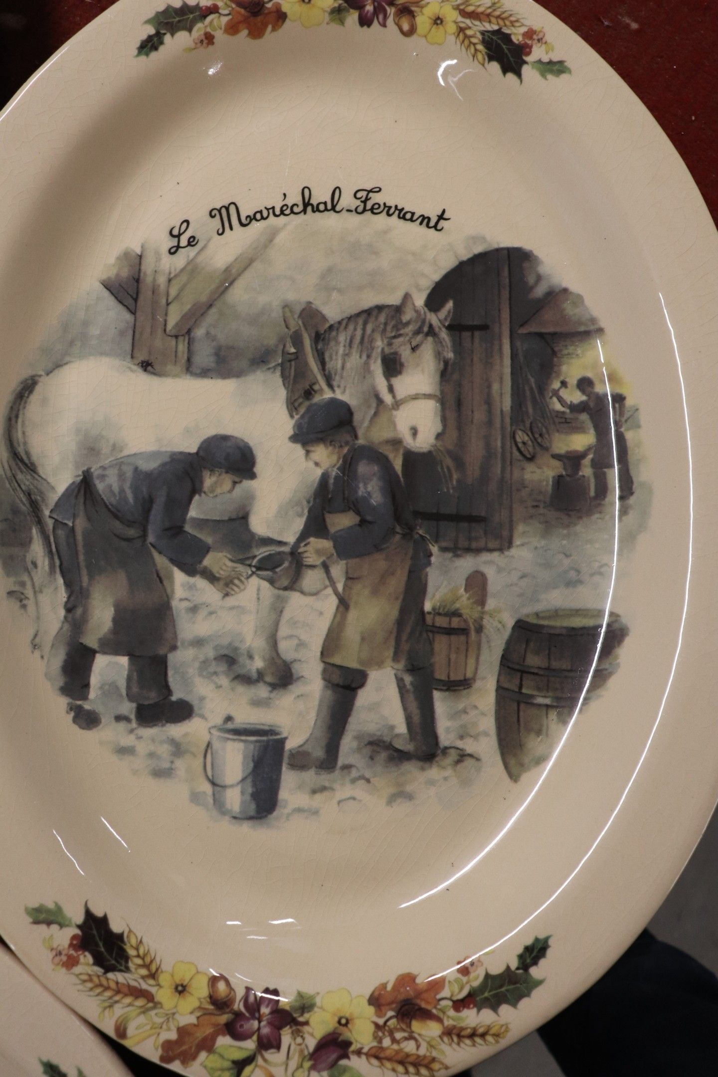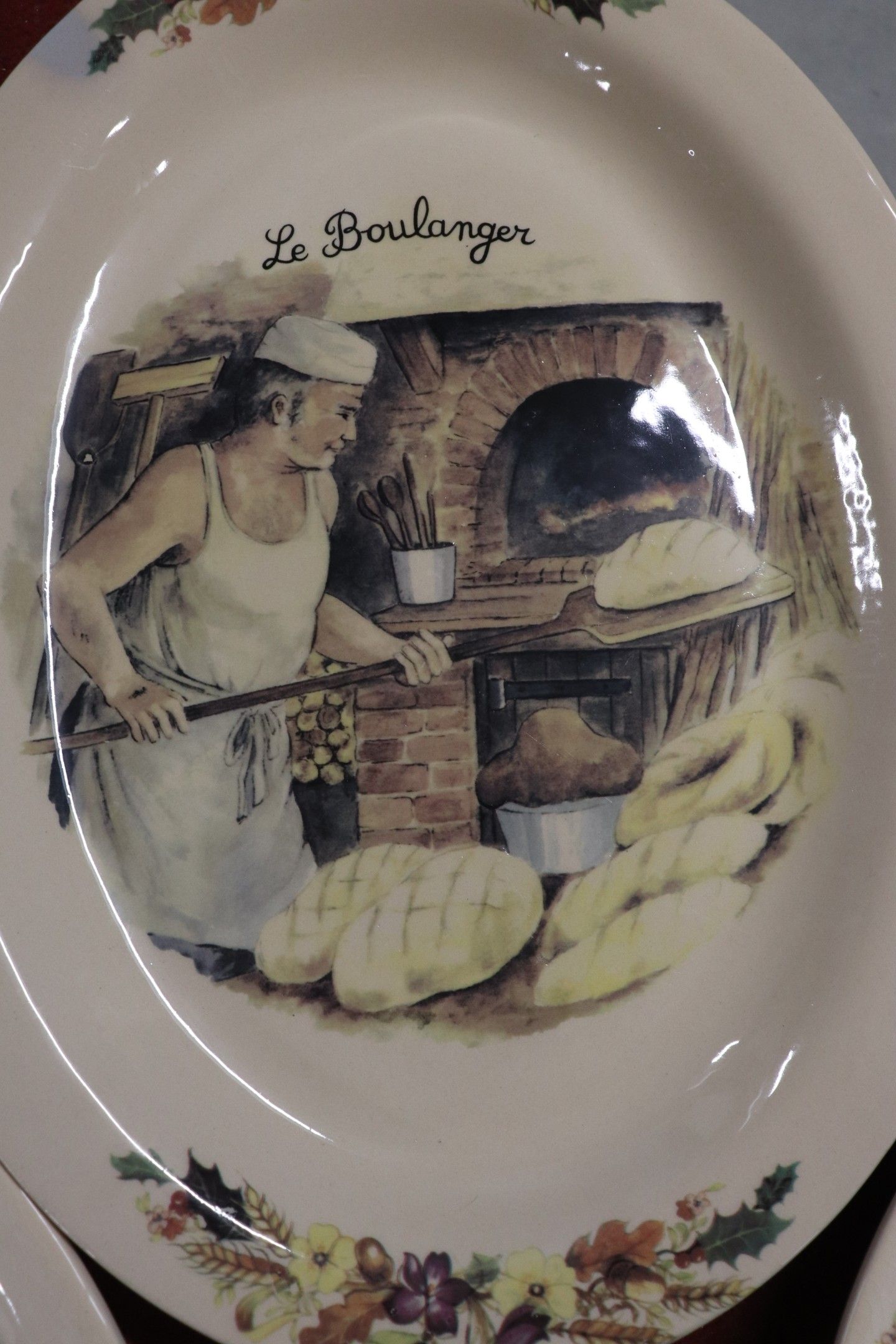 Five glazed ceramic oval serving dishes decorated with trades: blacksmith, clog maker, baker, spinner, potter. 47 x 36 cm