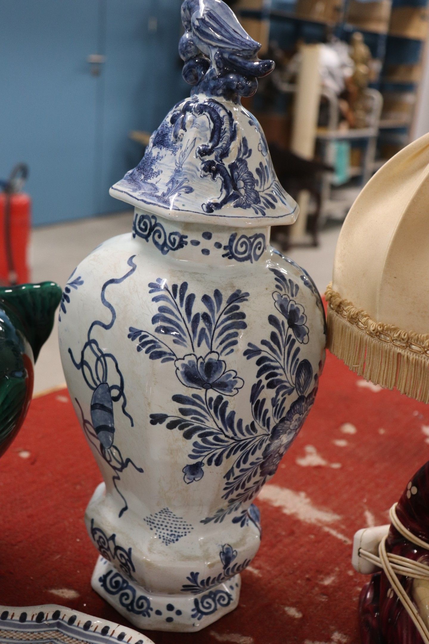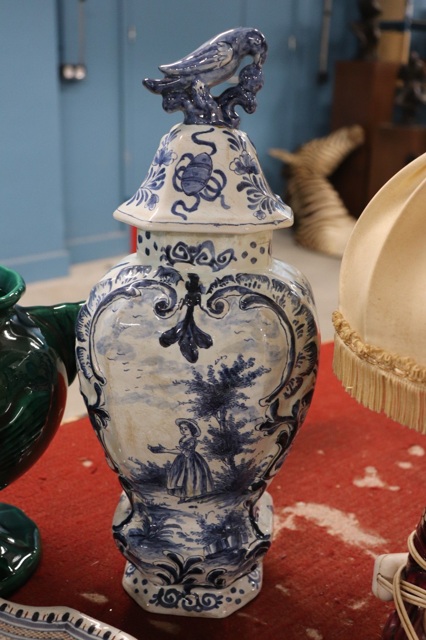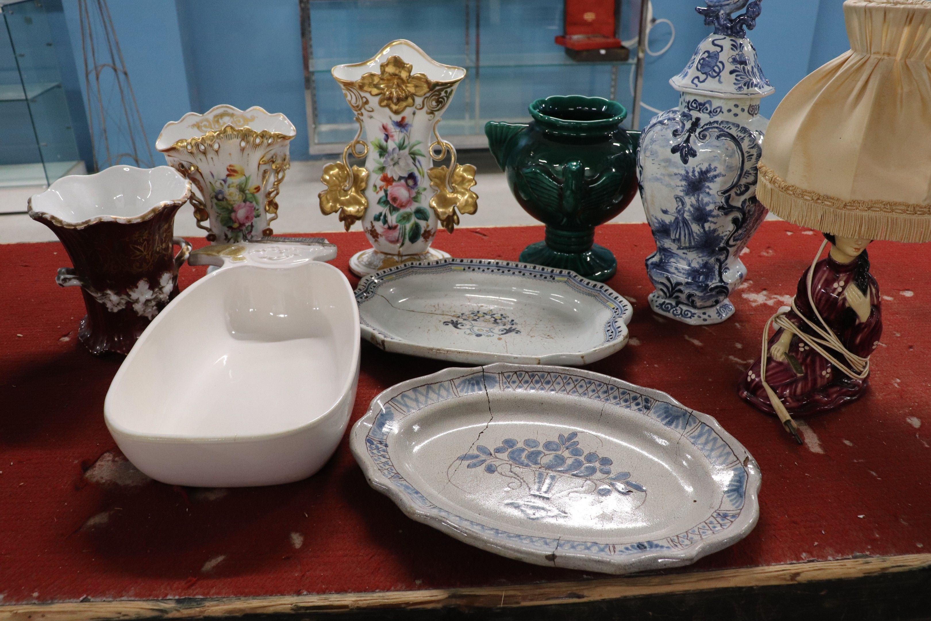 Lot of various ceramics: two Paris porcelain bridal vases, two earthenware dishes (cracked), a 19th century porcelain vase, a contemporary vase, a geisha lamp and a modern Delft earthenware covered vase (ht 38 cm).
