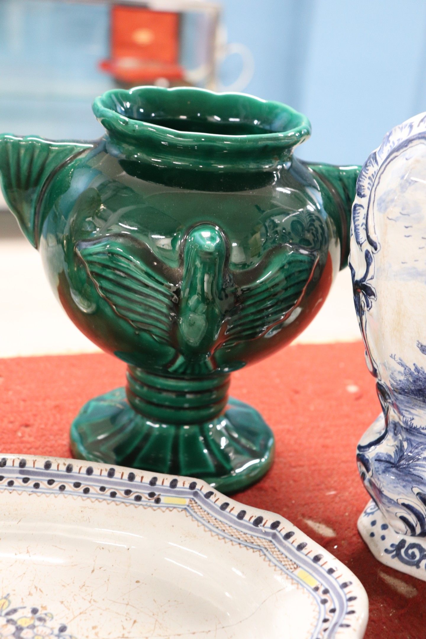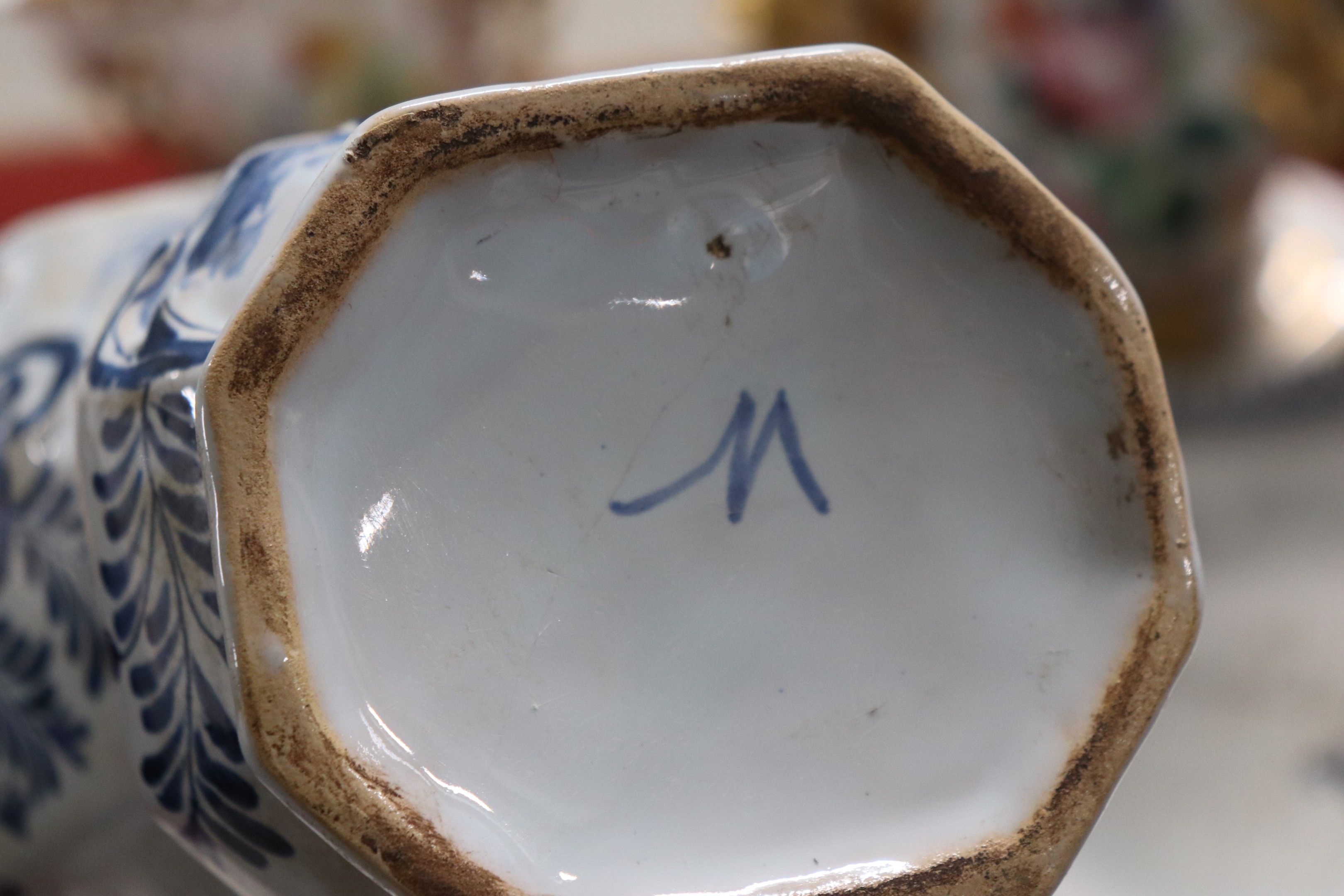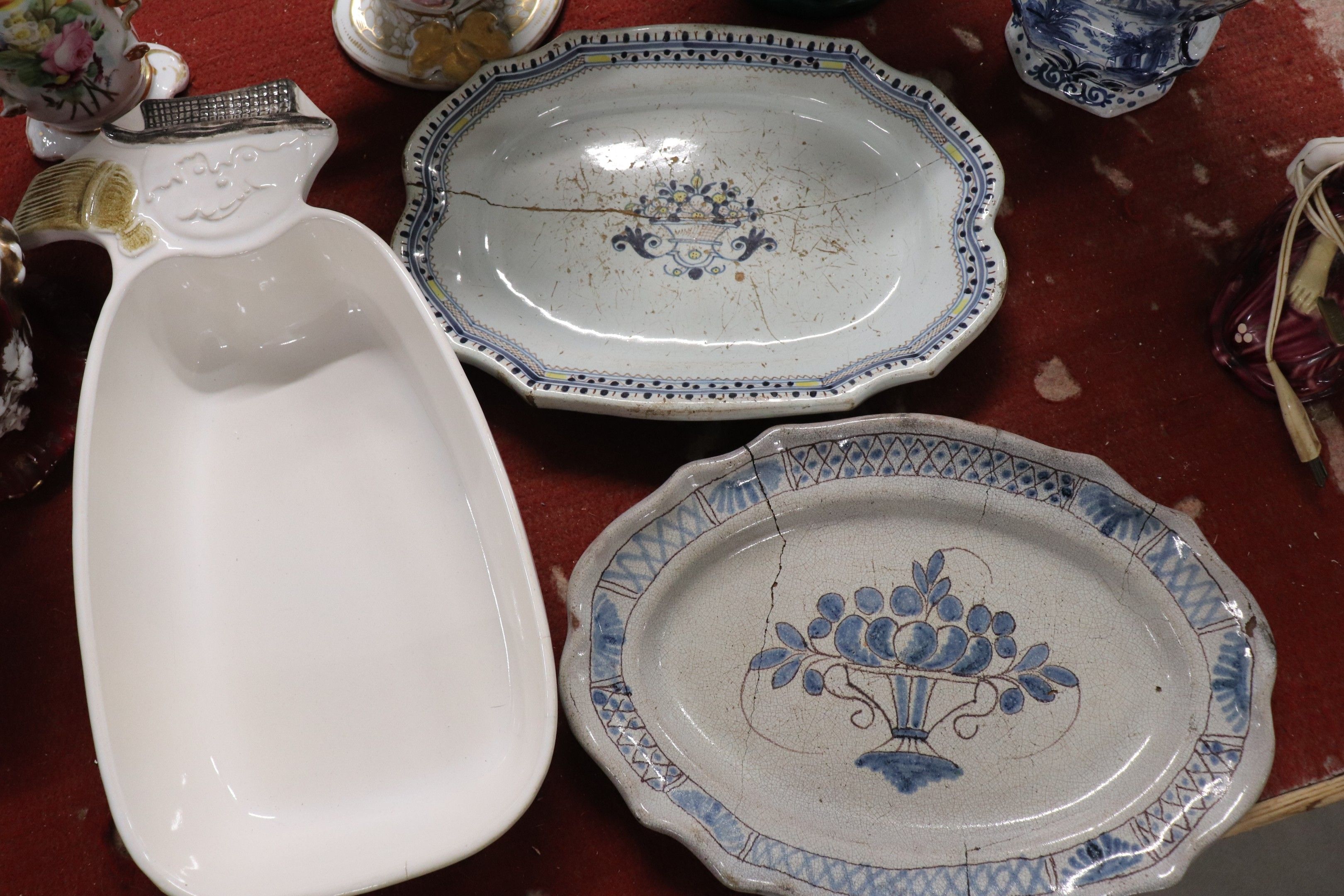 Lot of various ceramics: two Paris porcelain bridal vases, two earthenware dishes (cracked), a 19th century porcelain vase, a contemporary vase, a geisha lamp and a modern Delft earthenware covered vase (ht 38 cm).