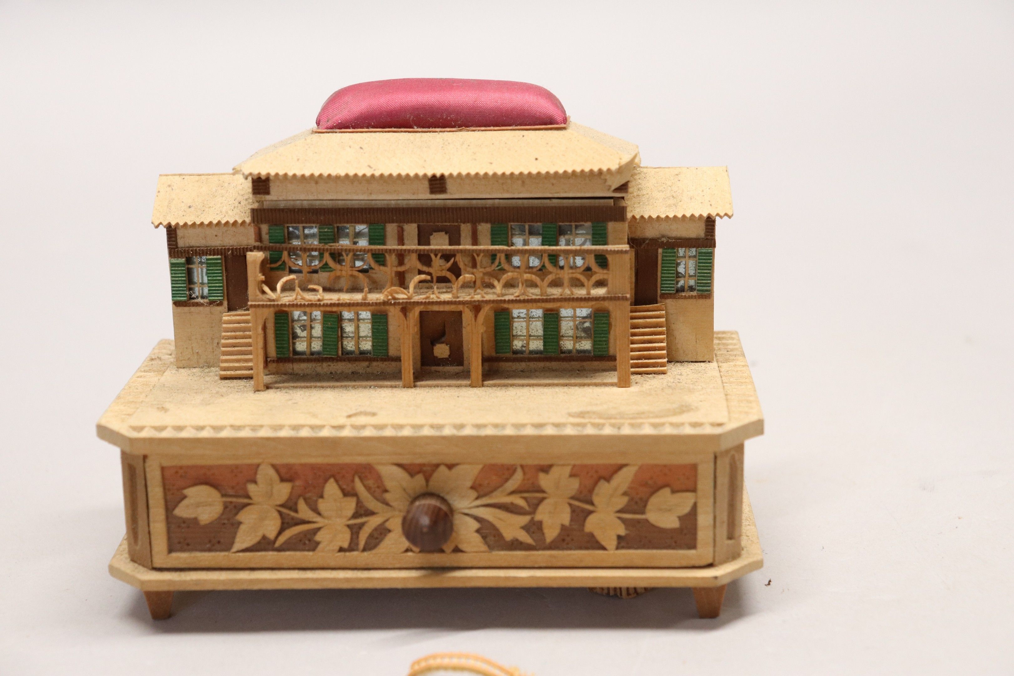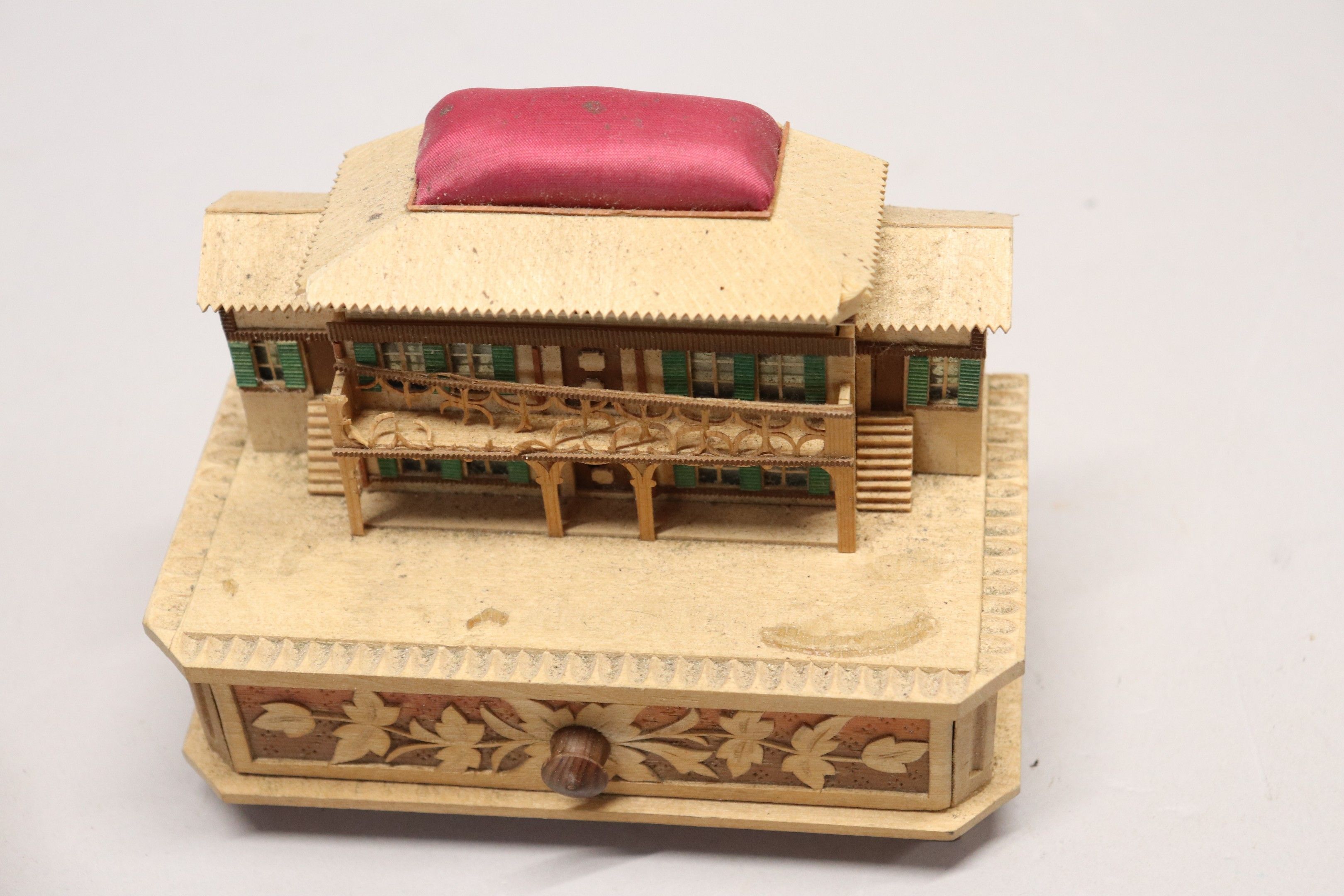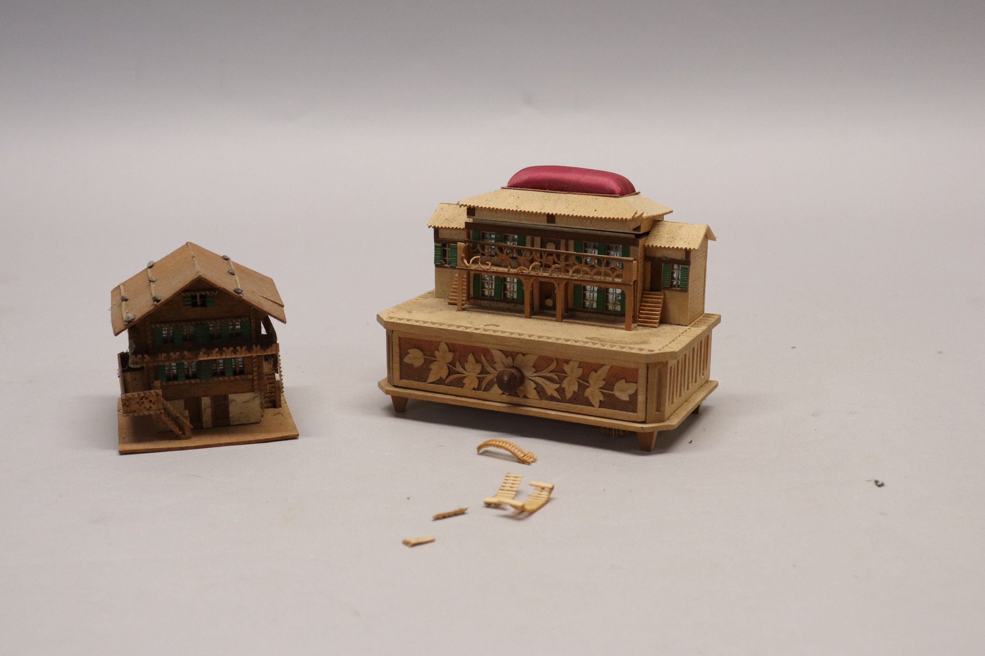 Two light wood boxes reminiscent of straw marquetry, one of which is a sewing box and needle holder. Max 9 x 13 x 7 cm