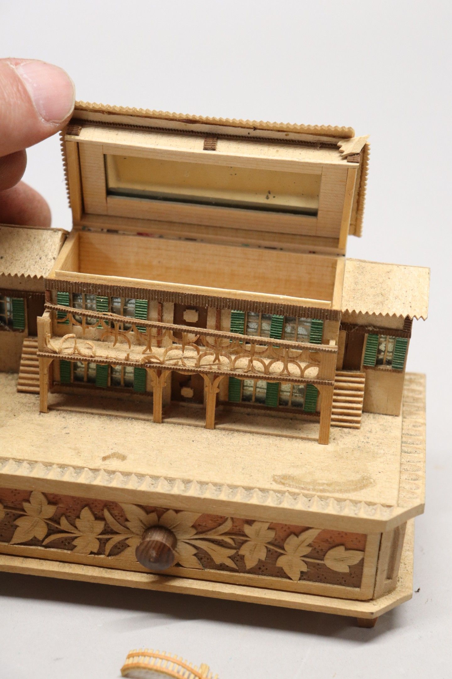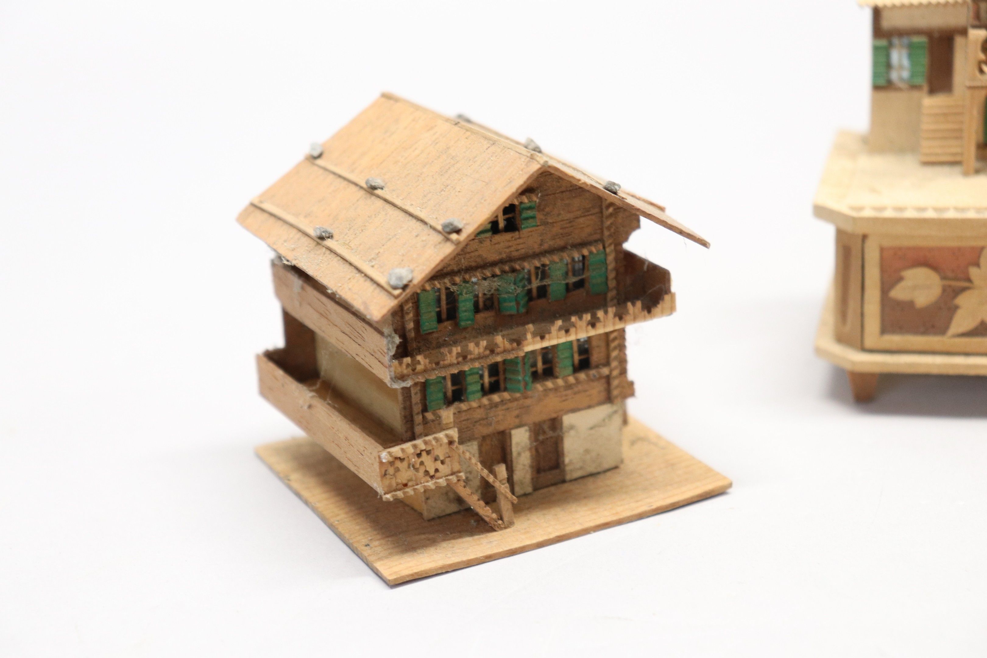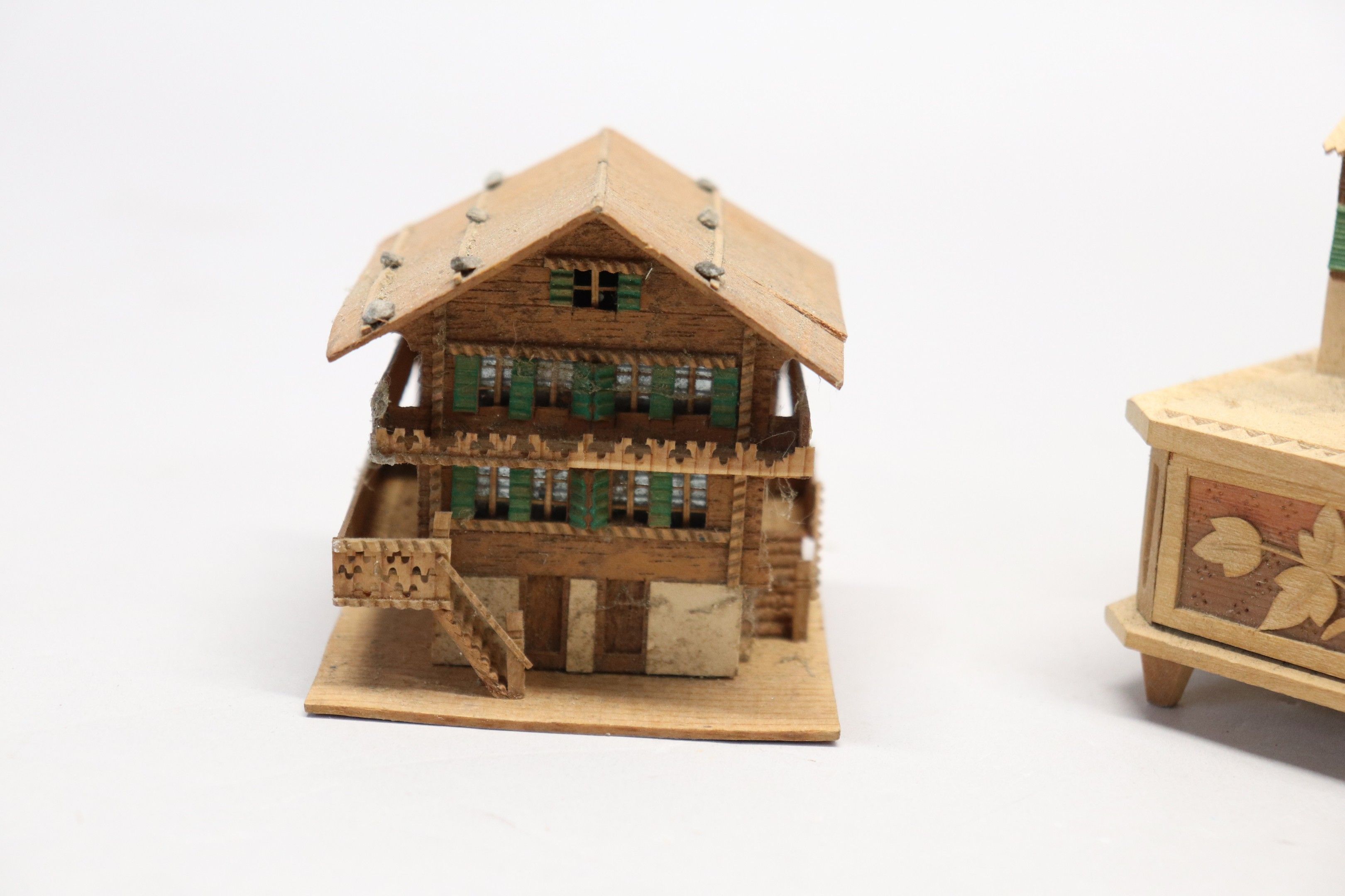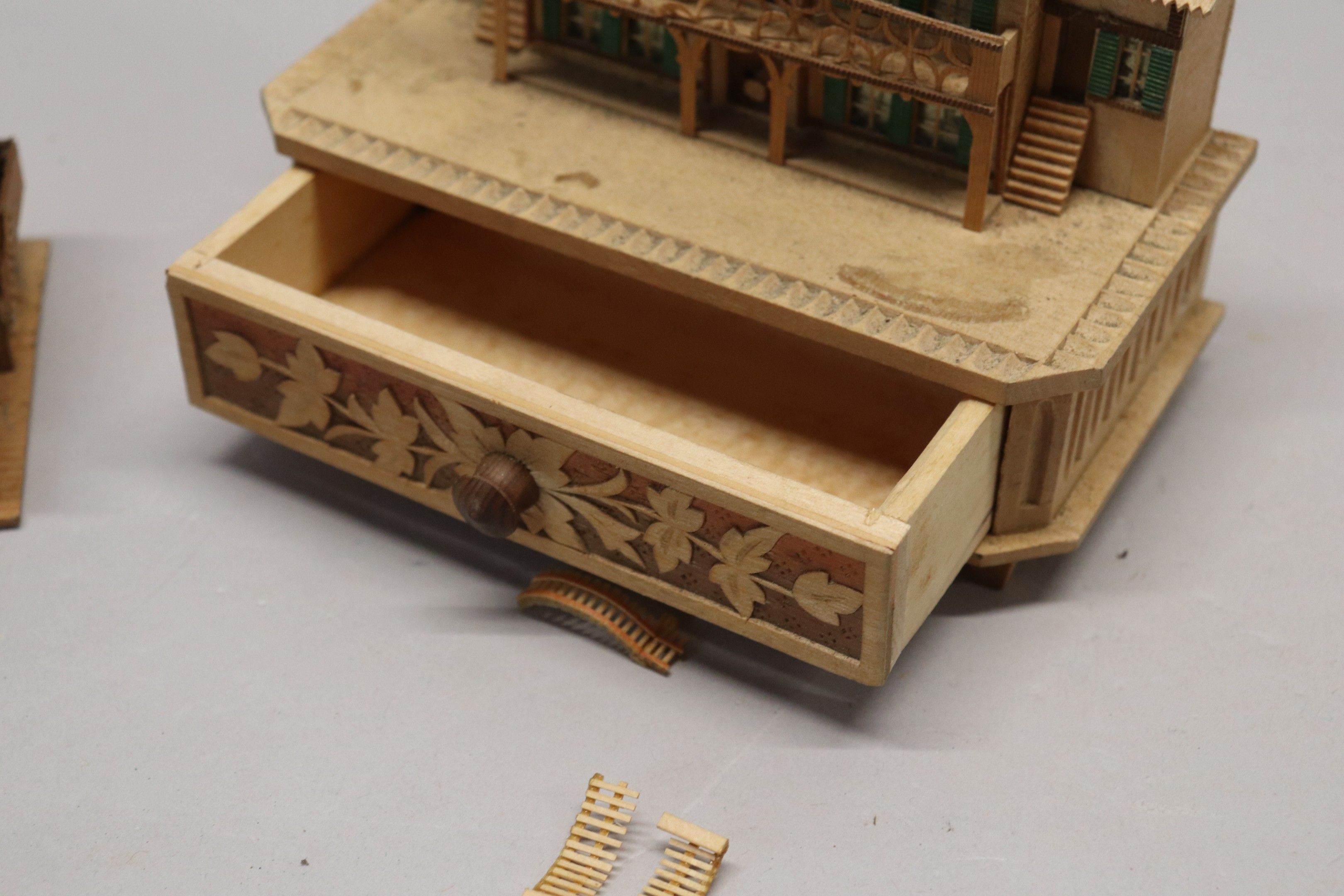 Two light wood boxes reminiscent of straw marquetry, one of which is a sewing box and needle holder. Max 9 x 13 x 7 cm