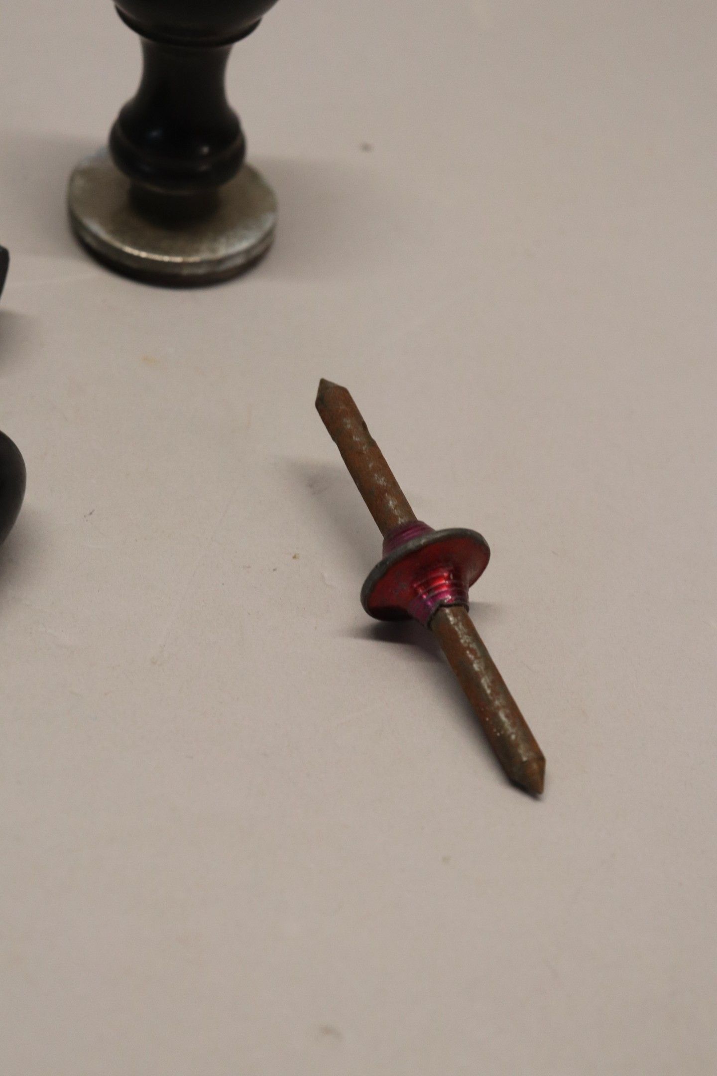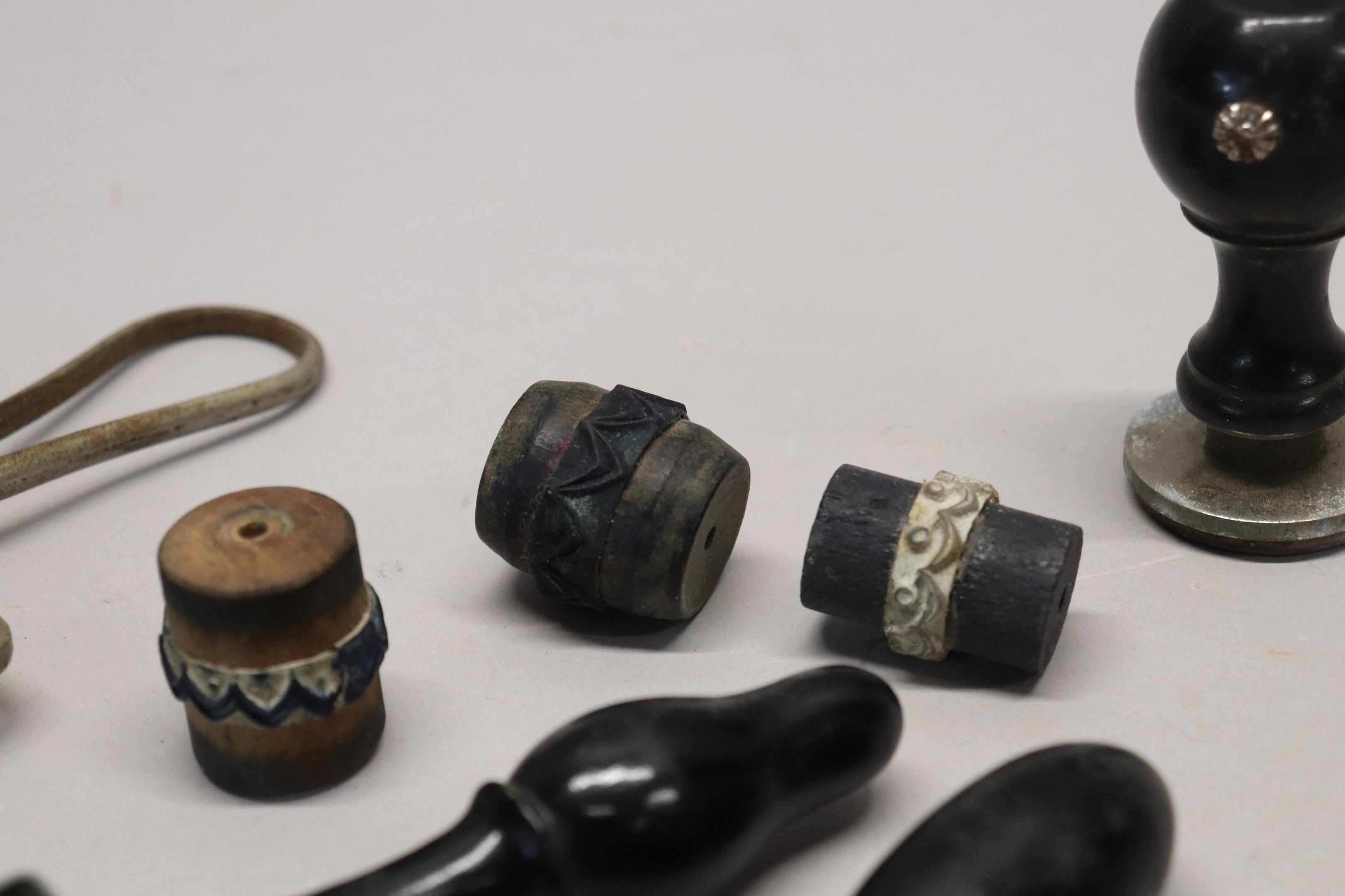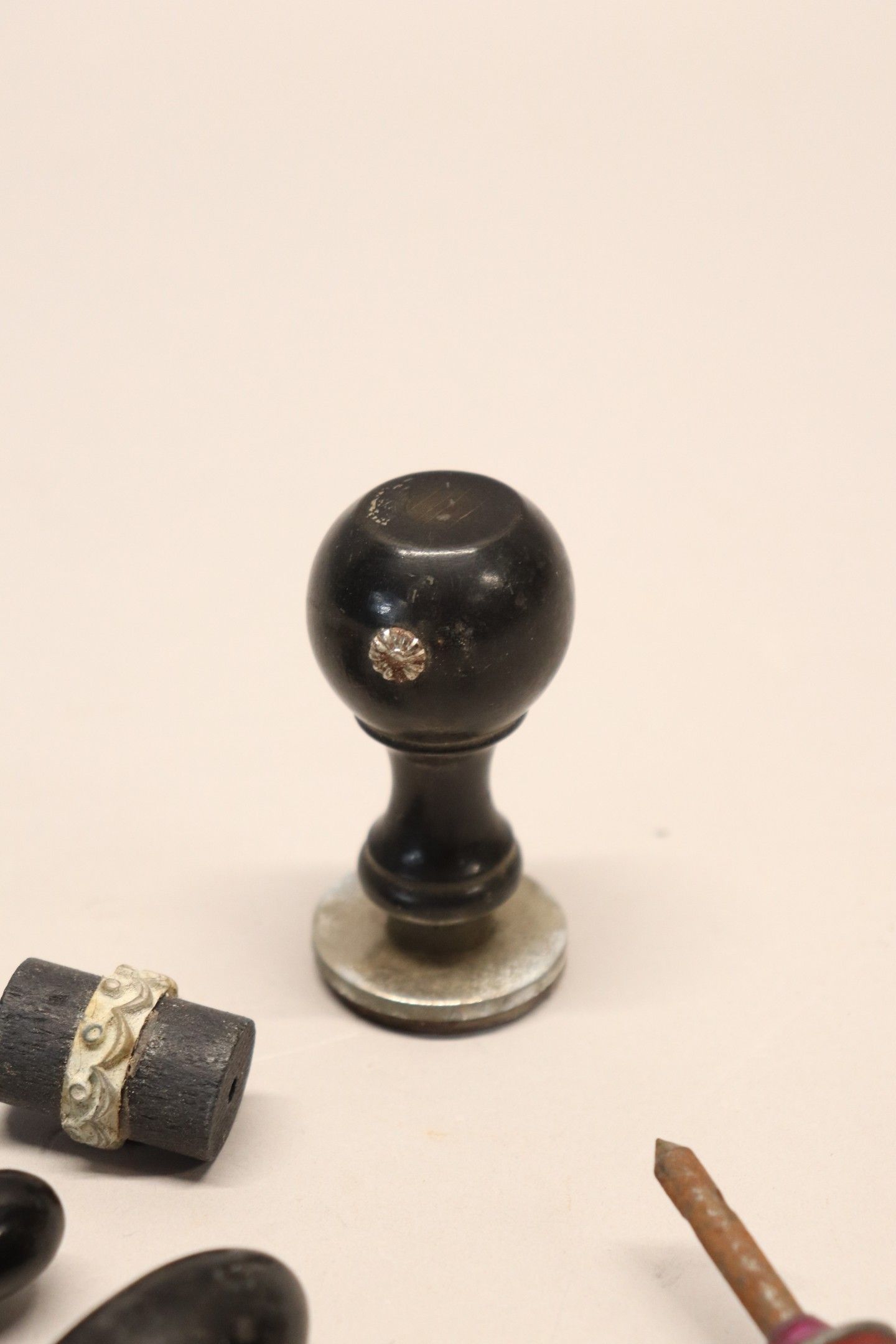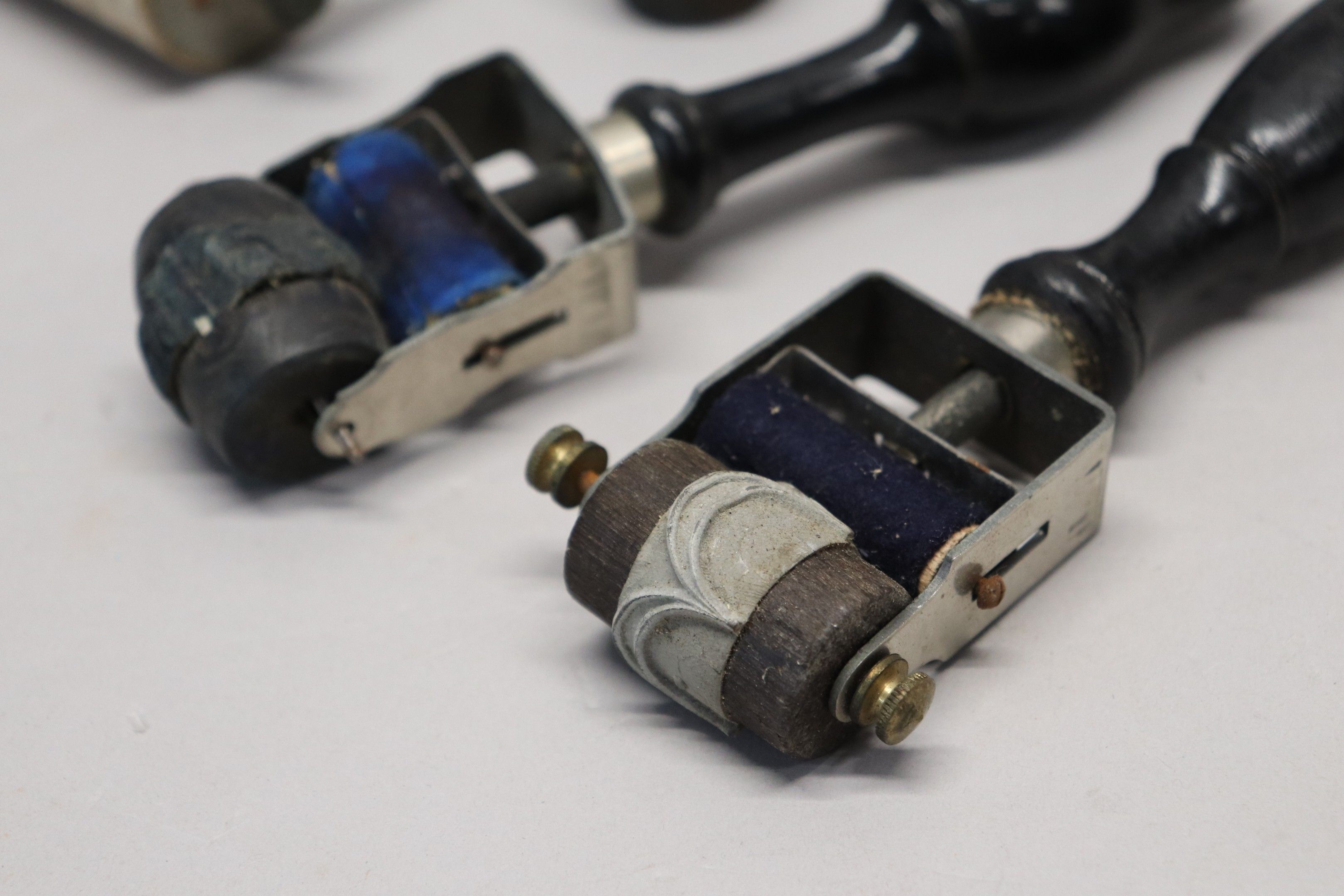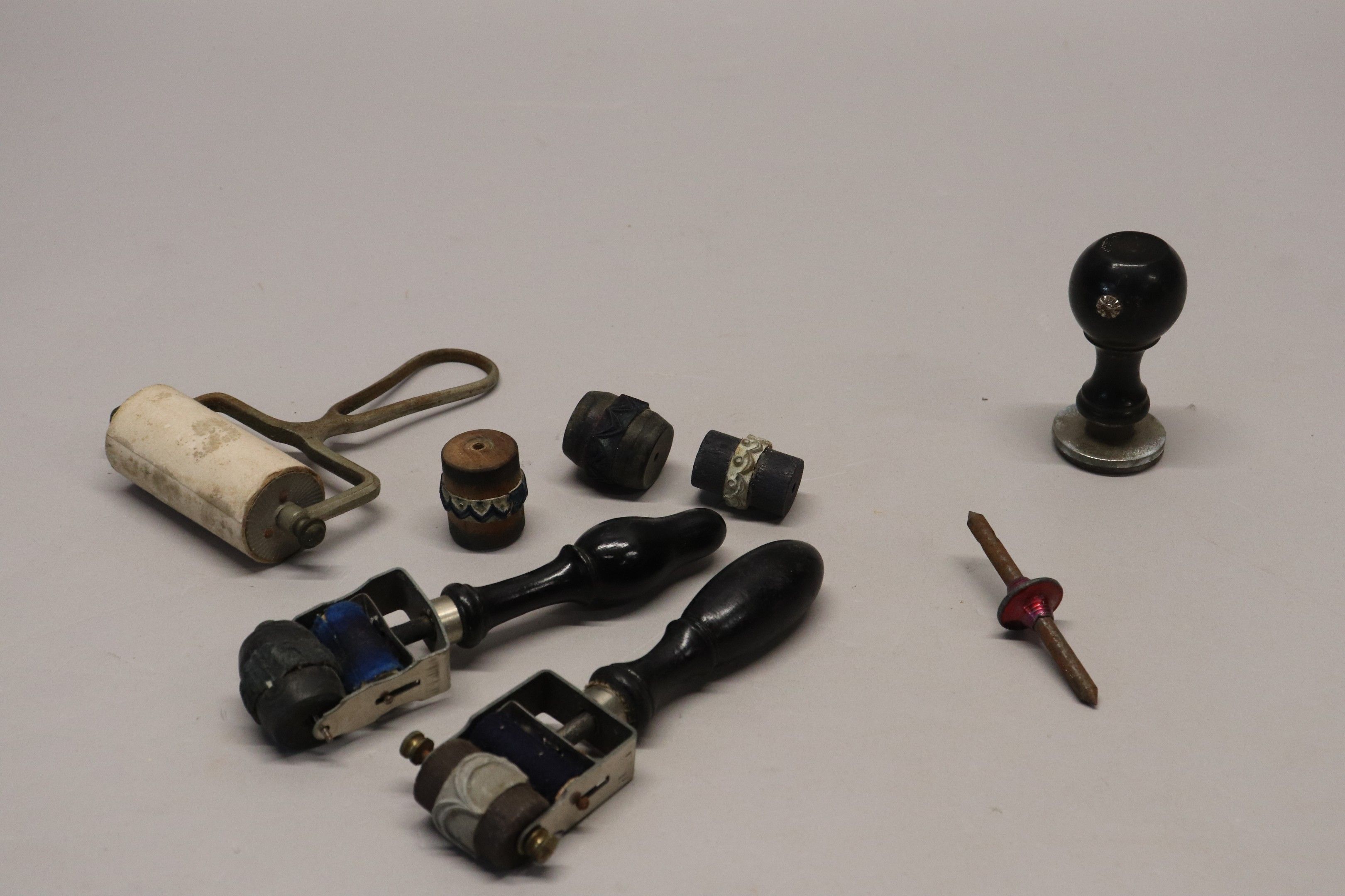Two rolls of blackened wood-handled scallop (14 cm long) with three spare rolls, a round stamp, an iron-handled blotter and a spool.