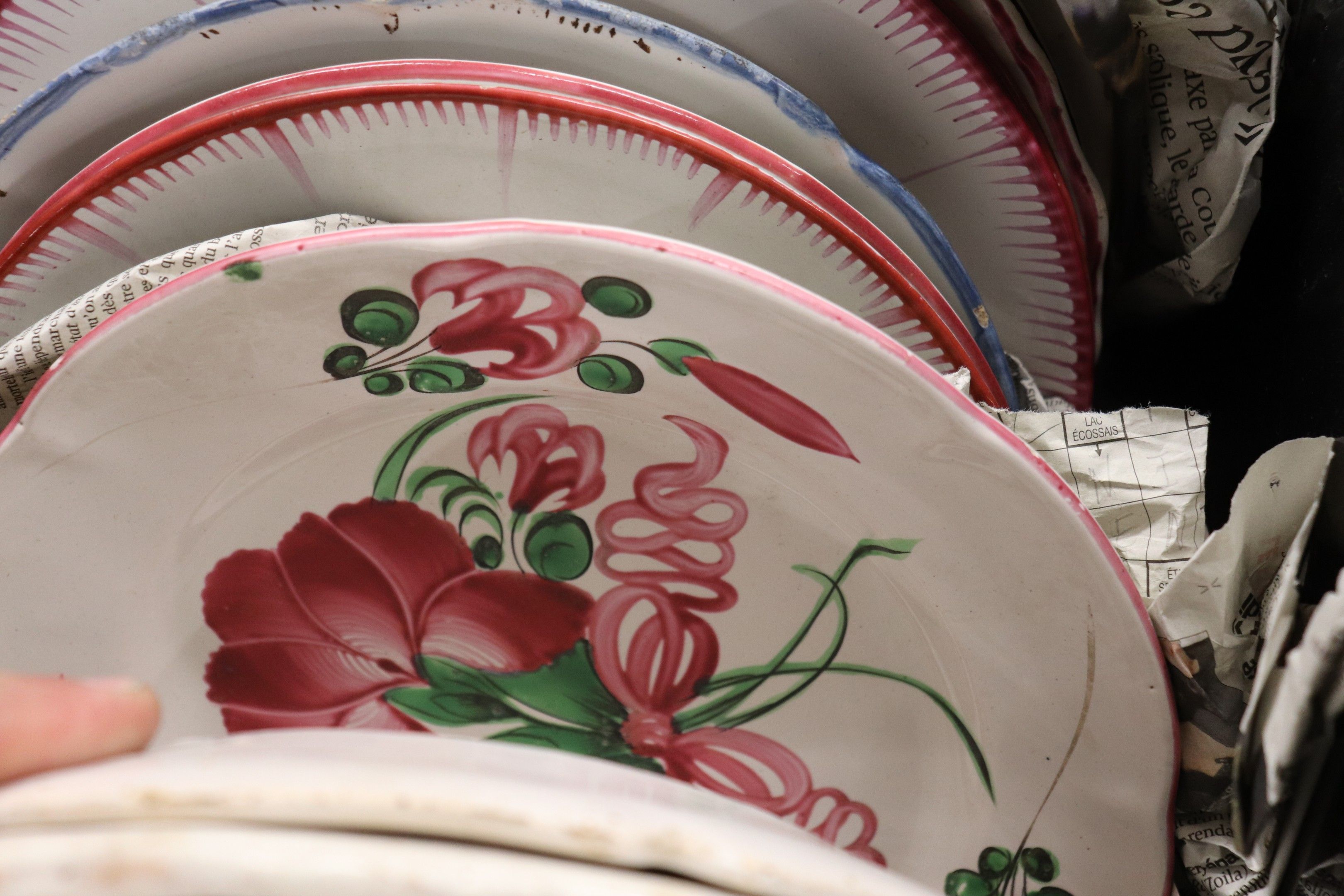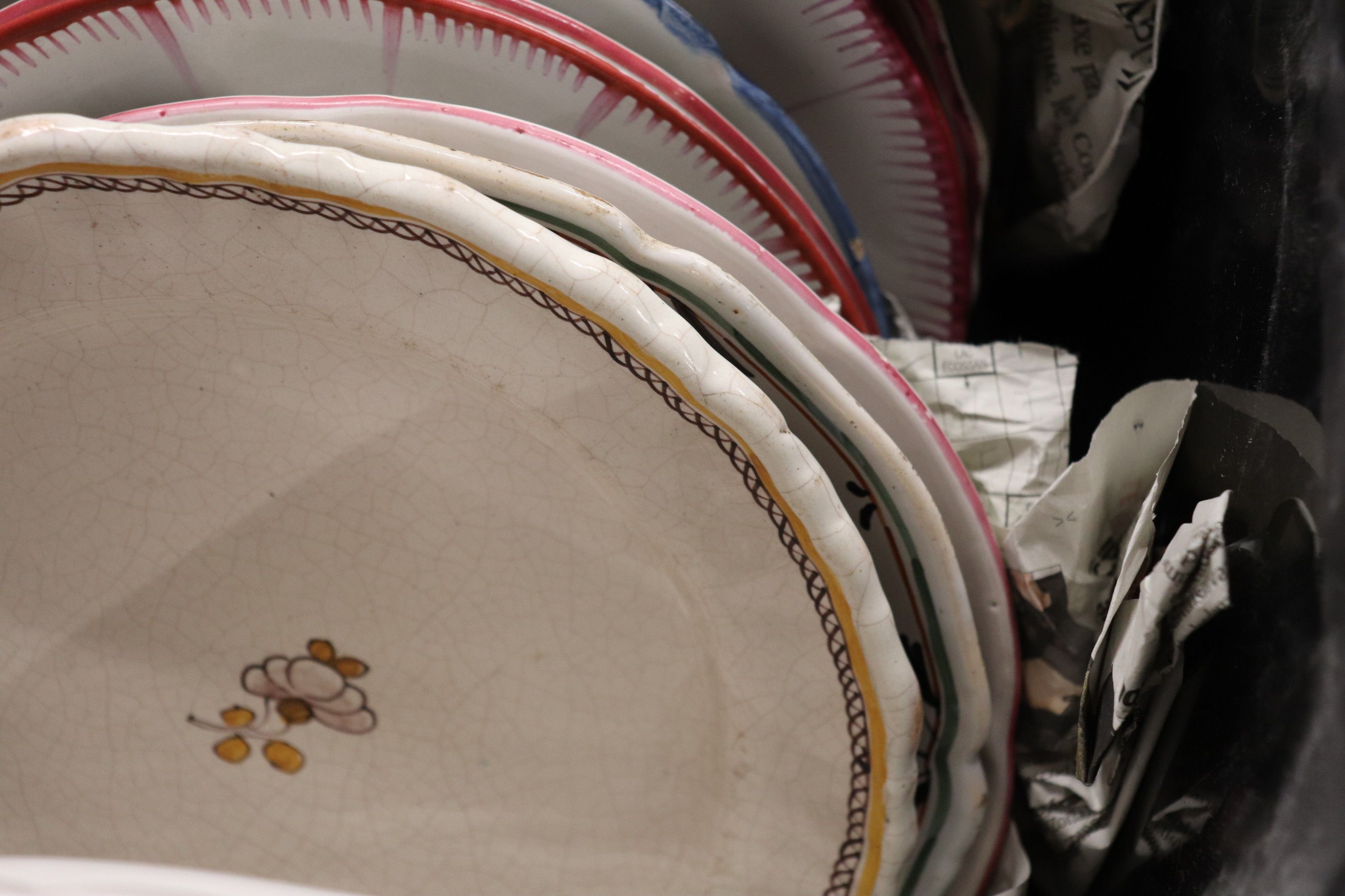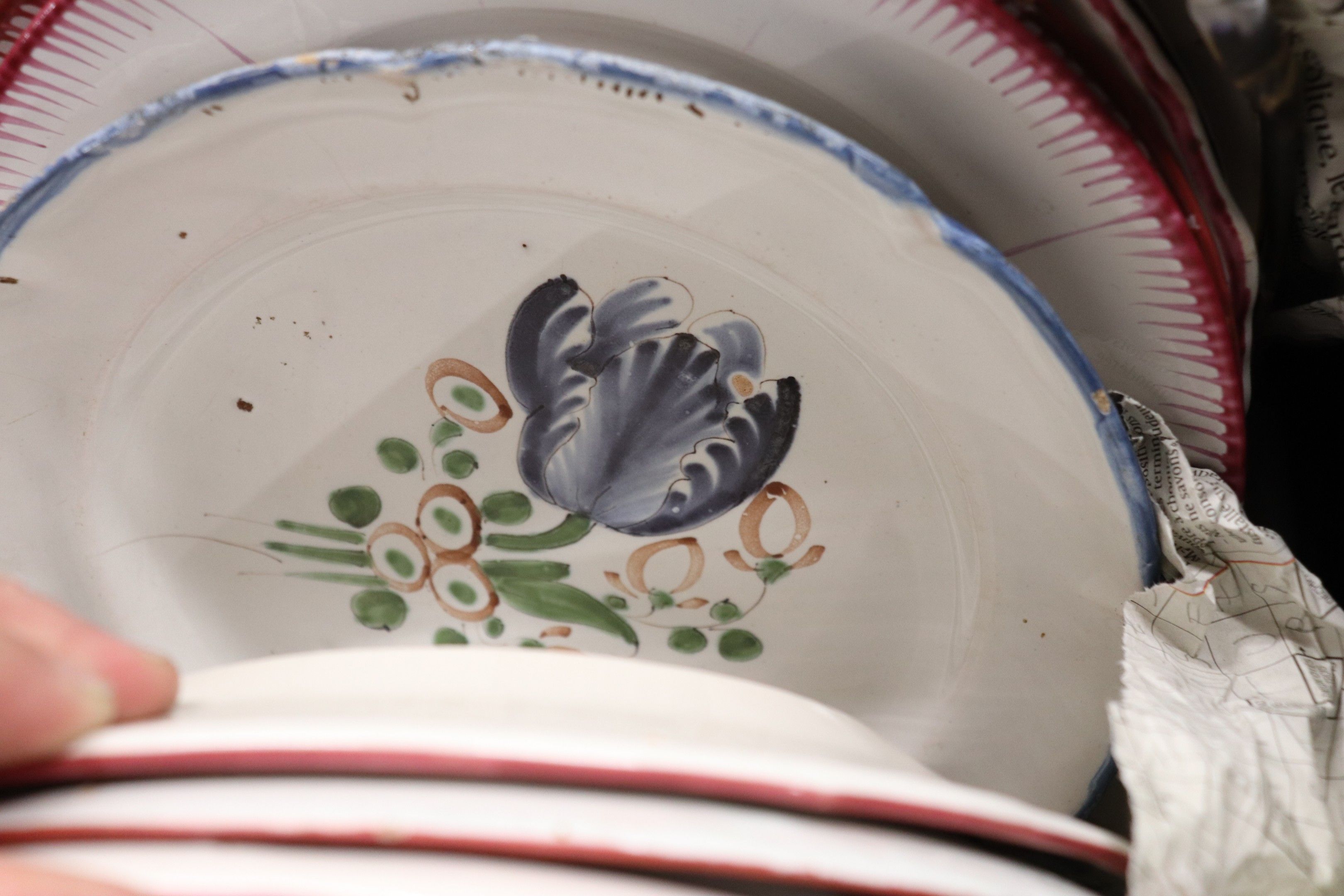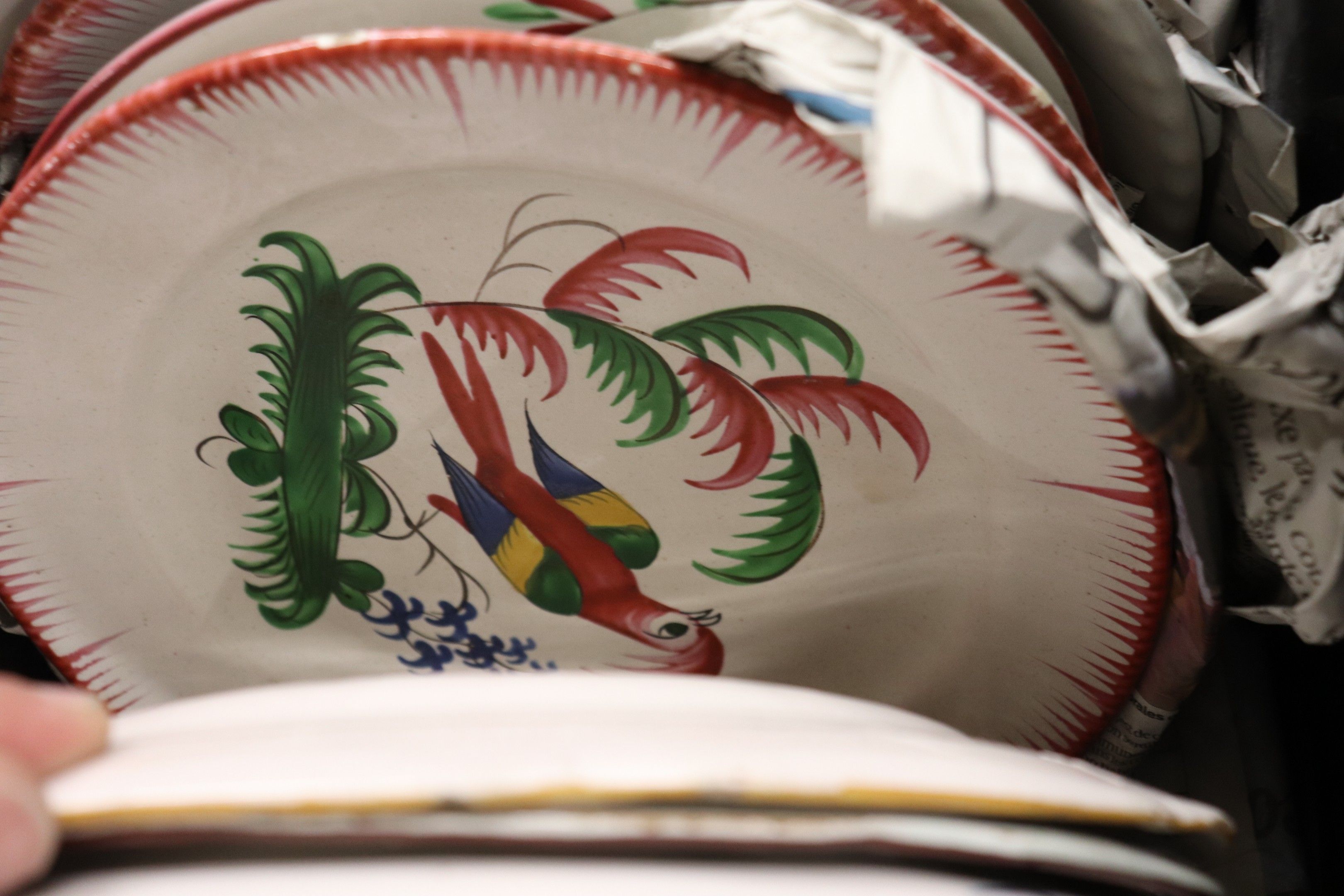 In a handle, set of glazed earthenware plates.