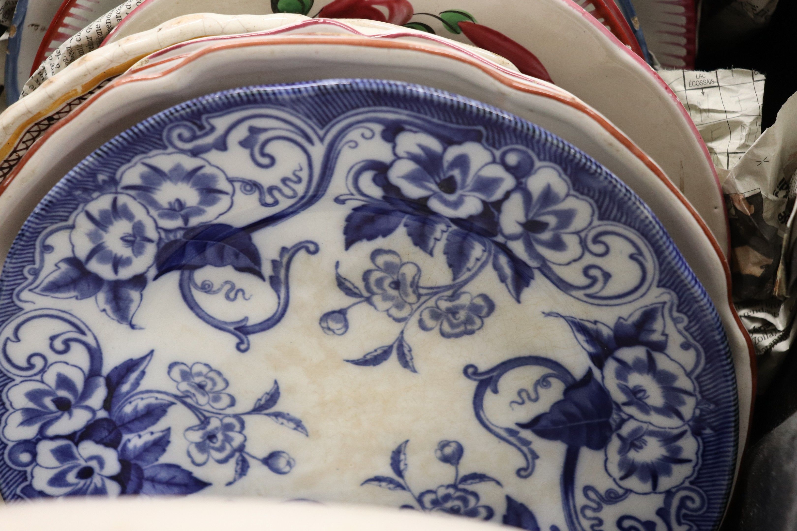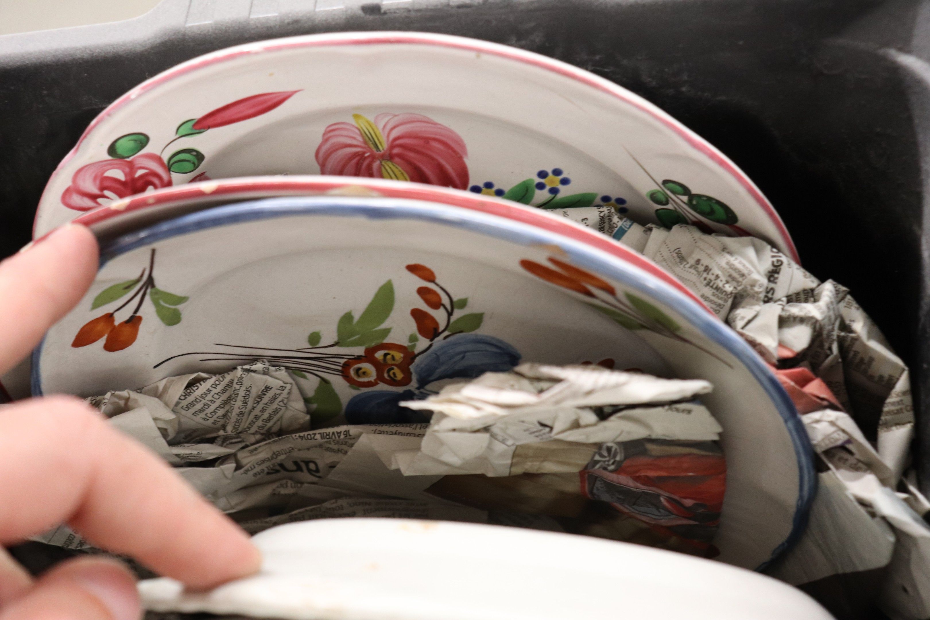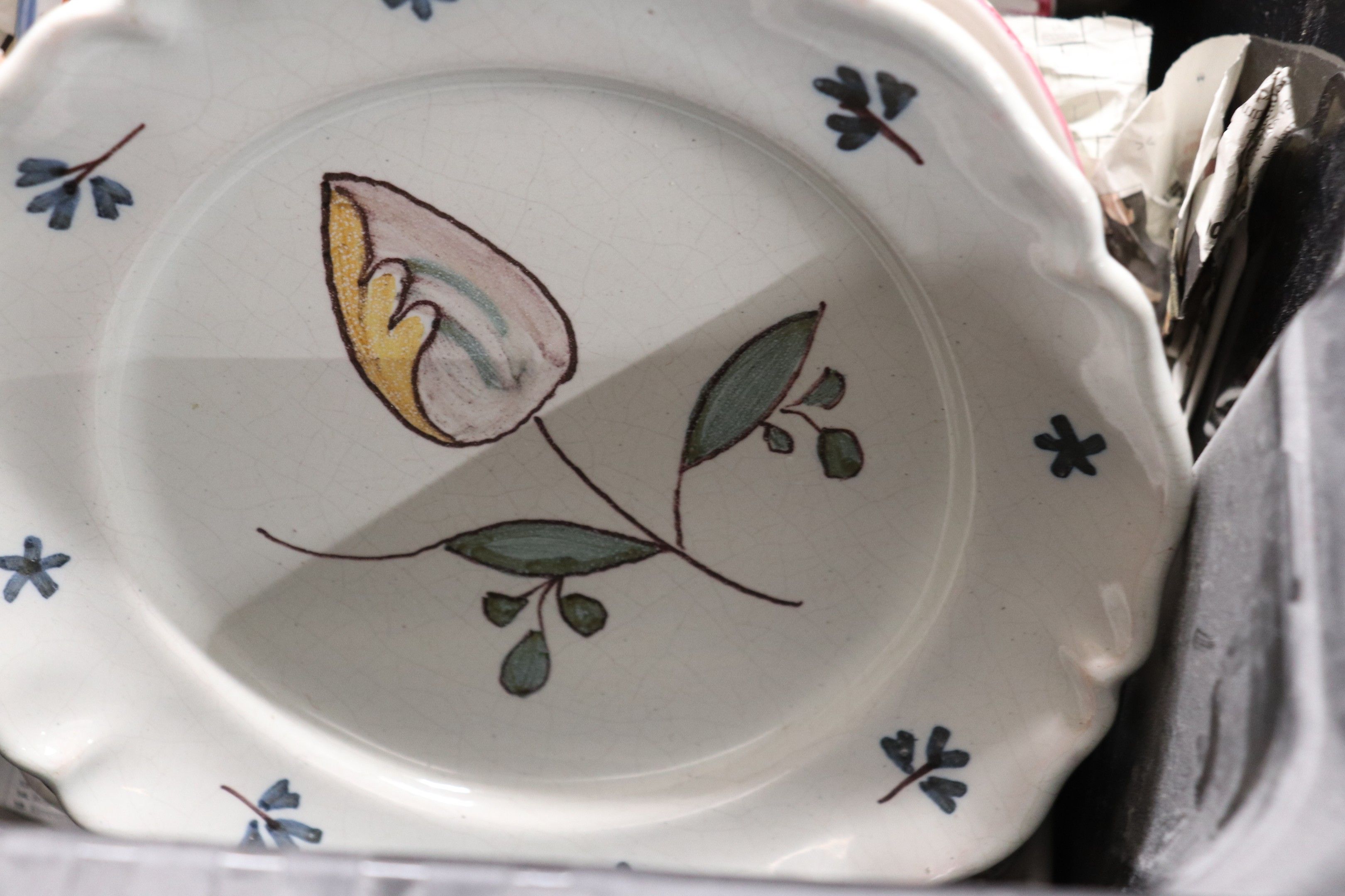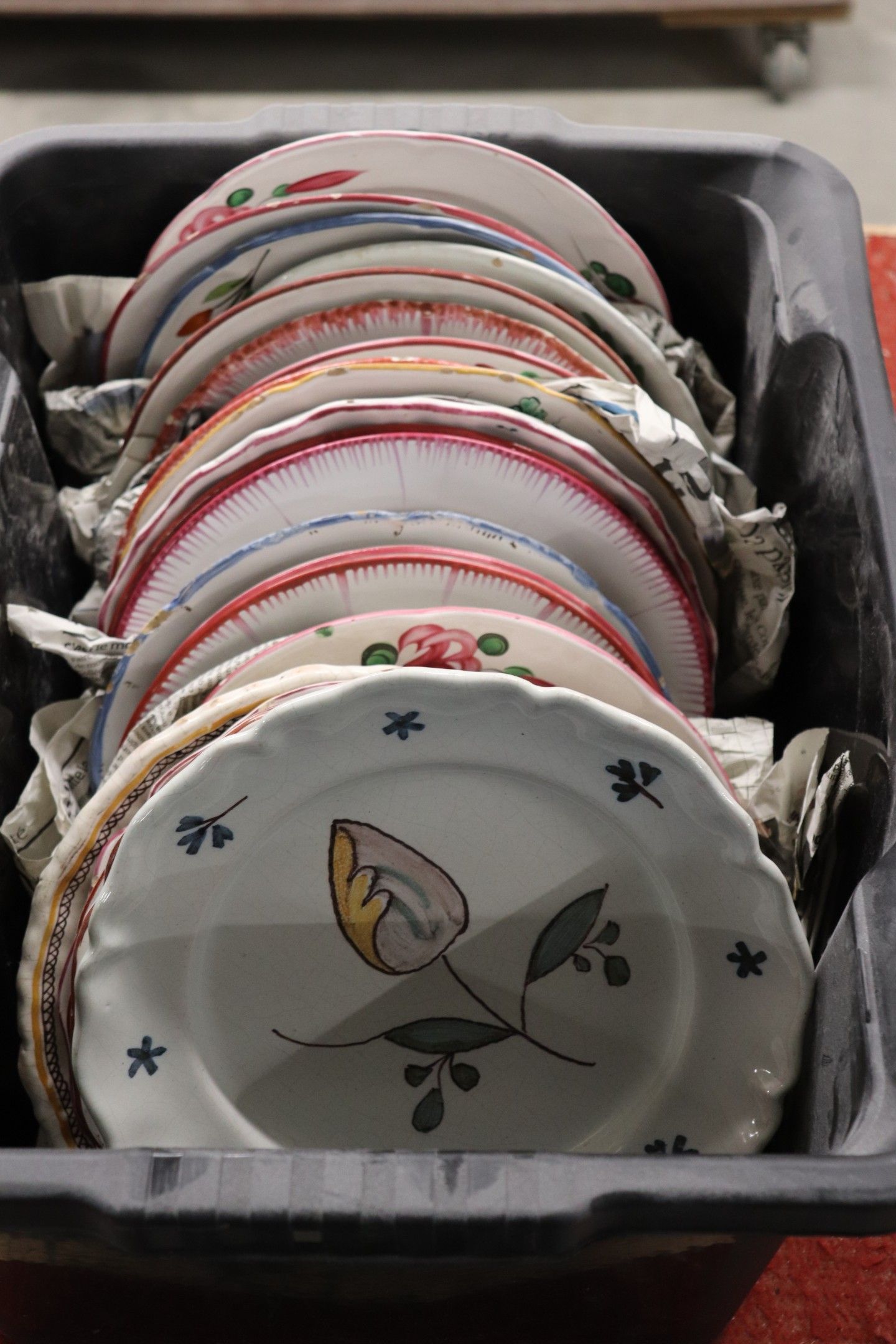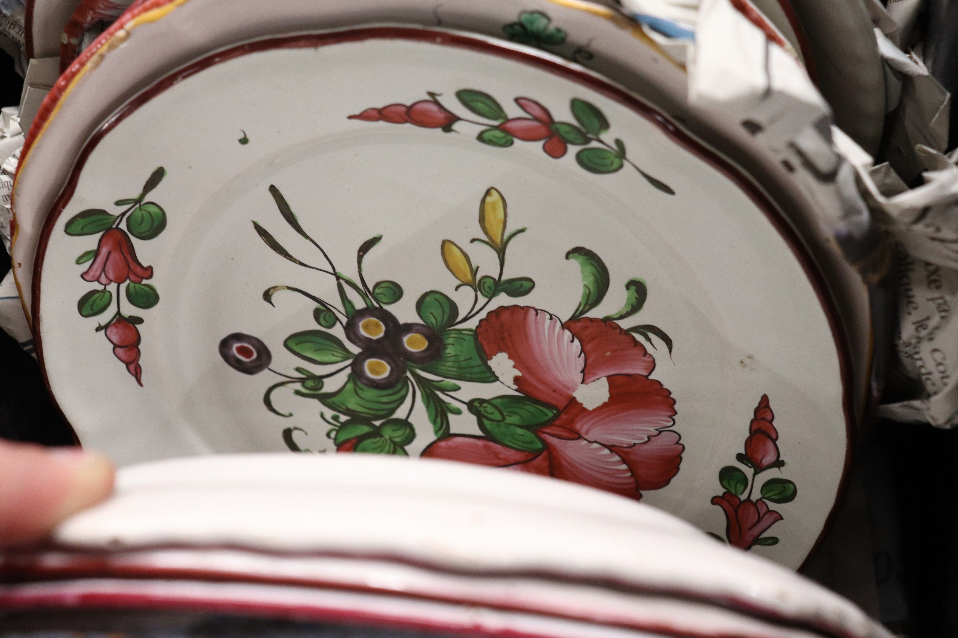 In a handle, set of glazed earthenware plates.