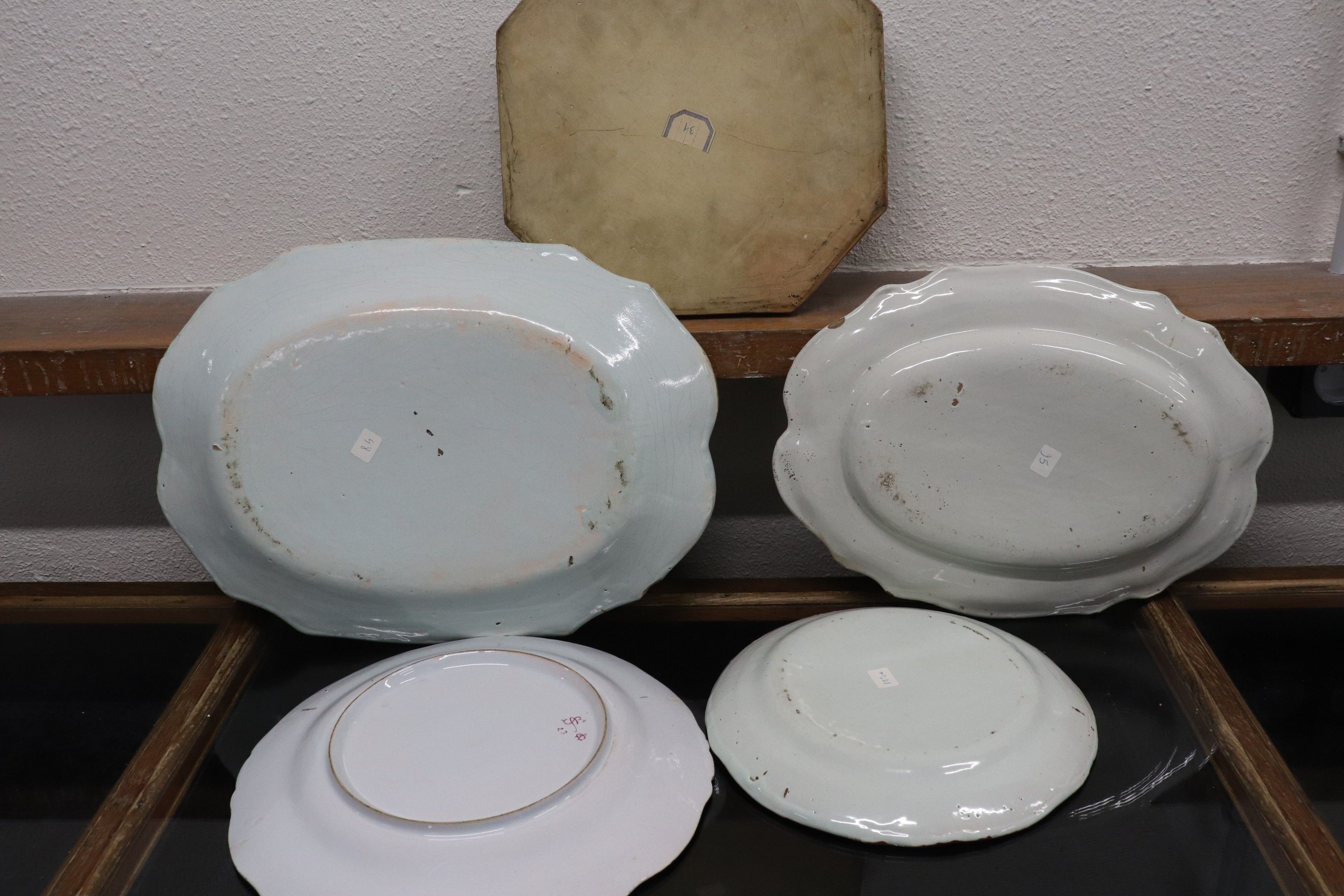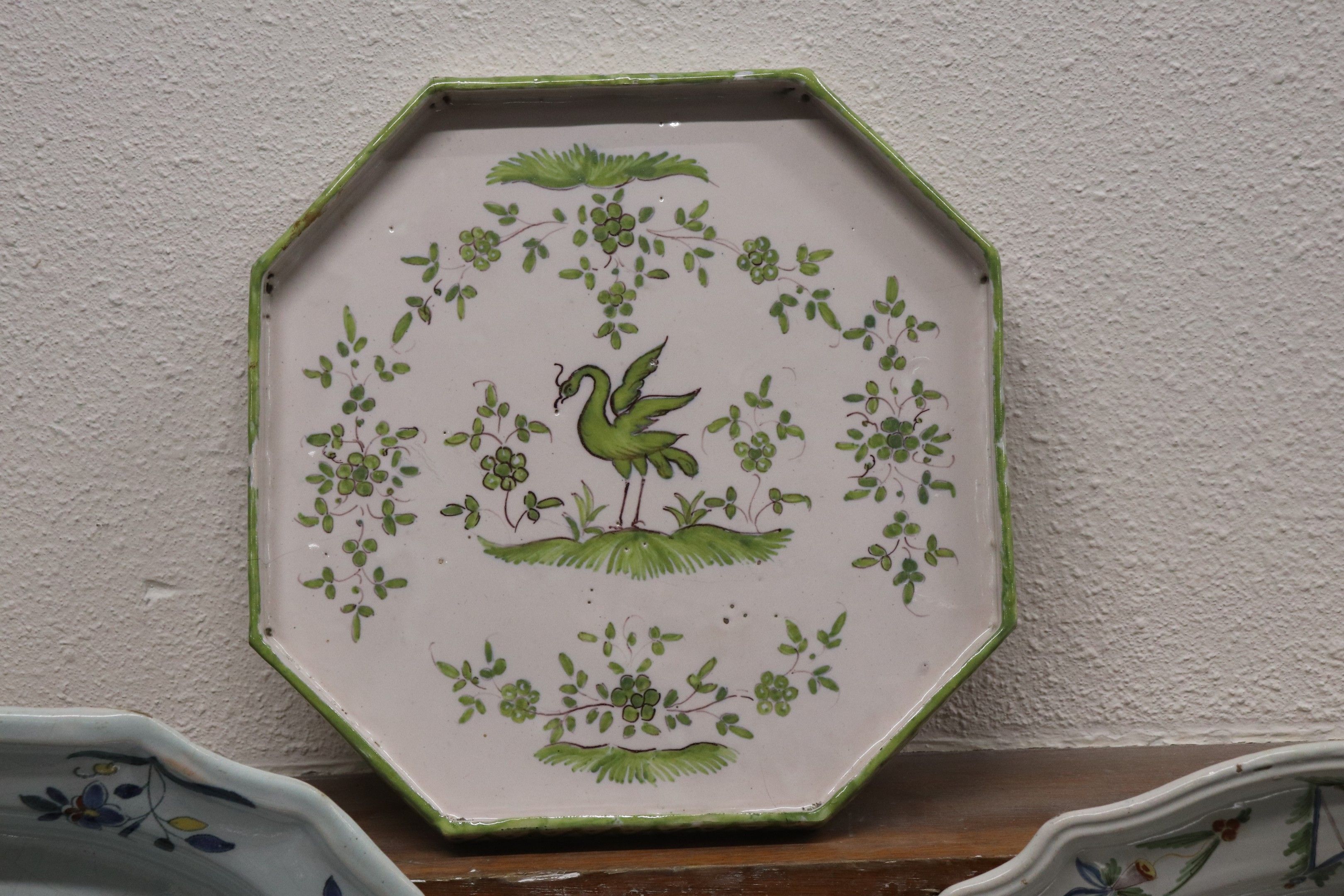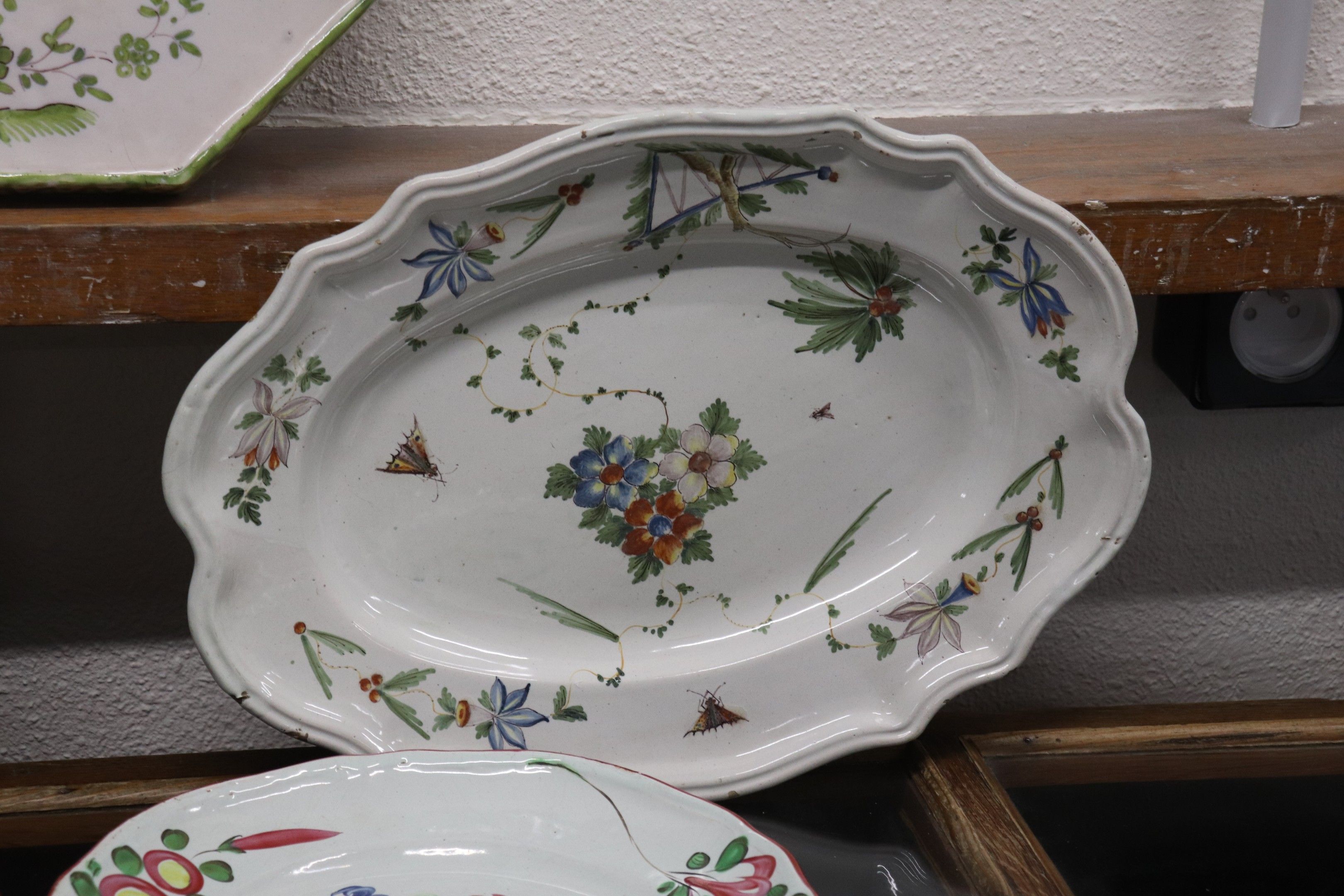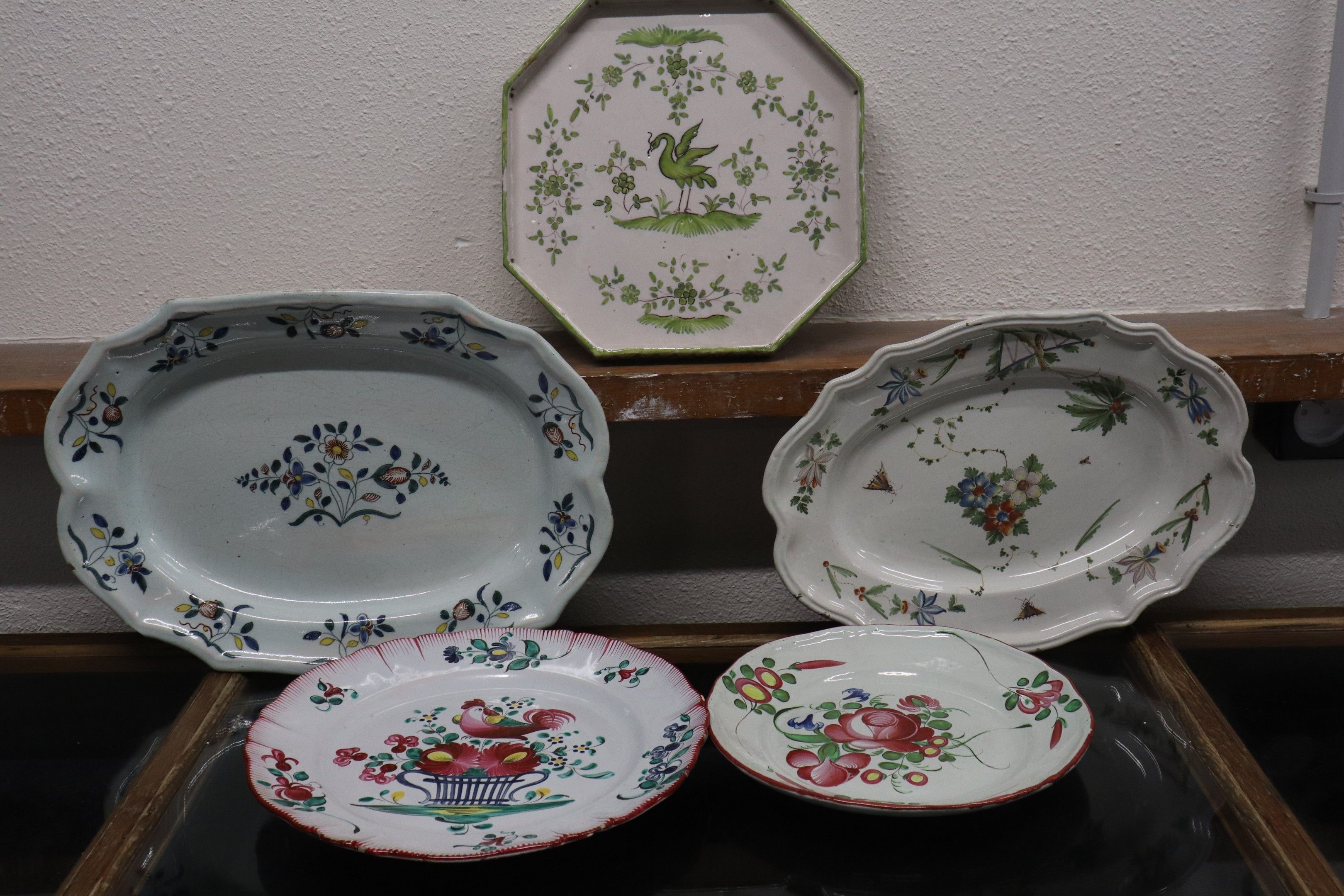 Set of five polychrome earthenware dishes: two round Les Islettes or St Clément dishes, two oval shaped dishes and an octagonal Moustiers manganese green dish (29 x 29 cm)