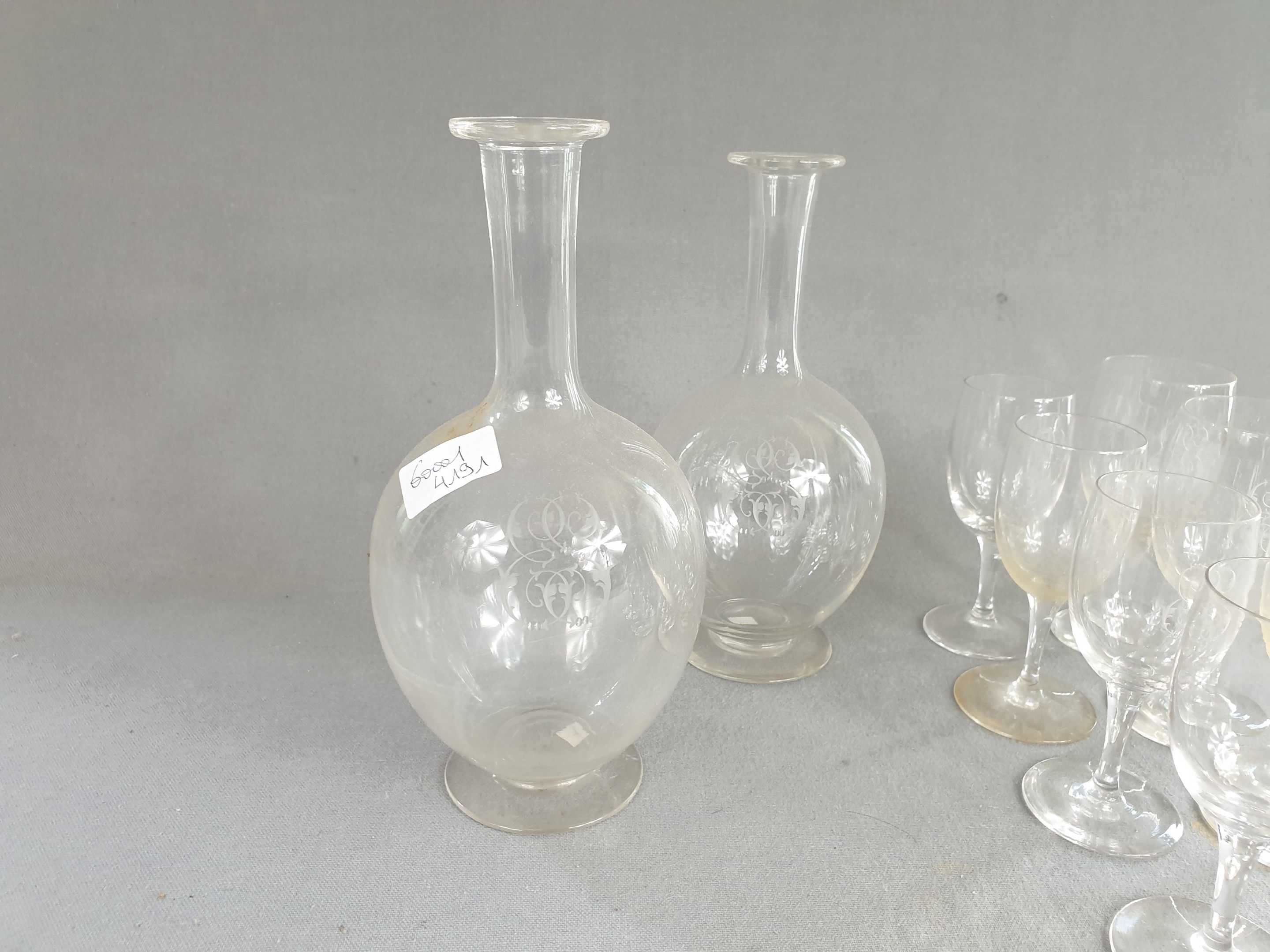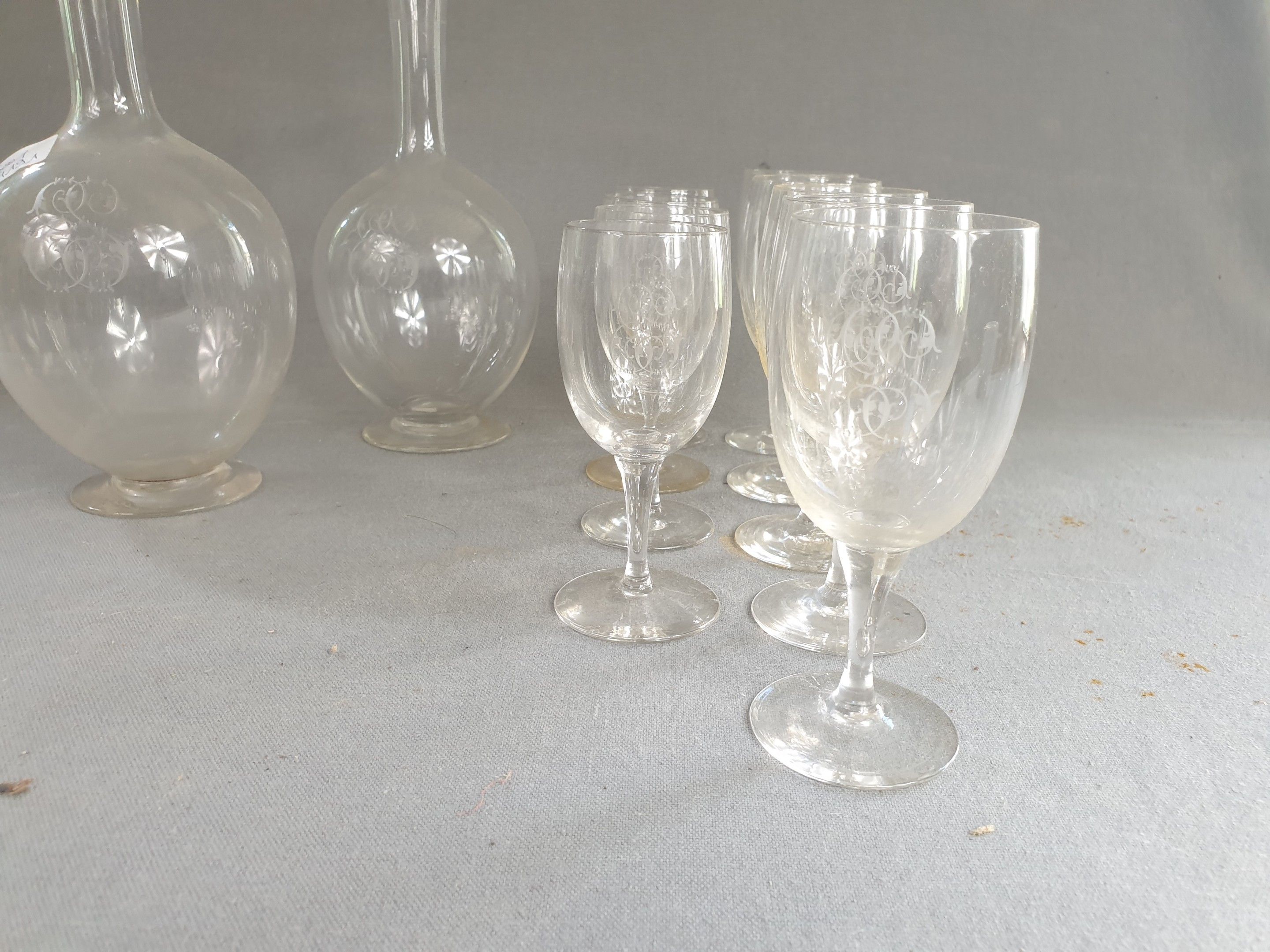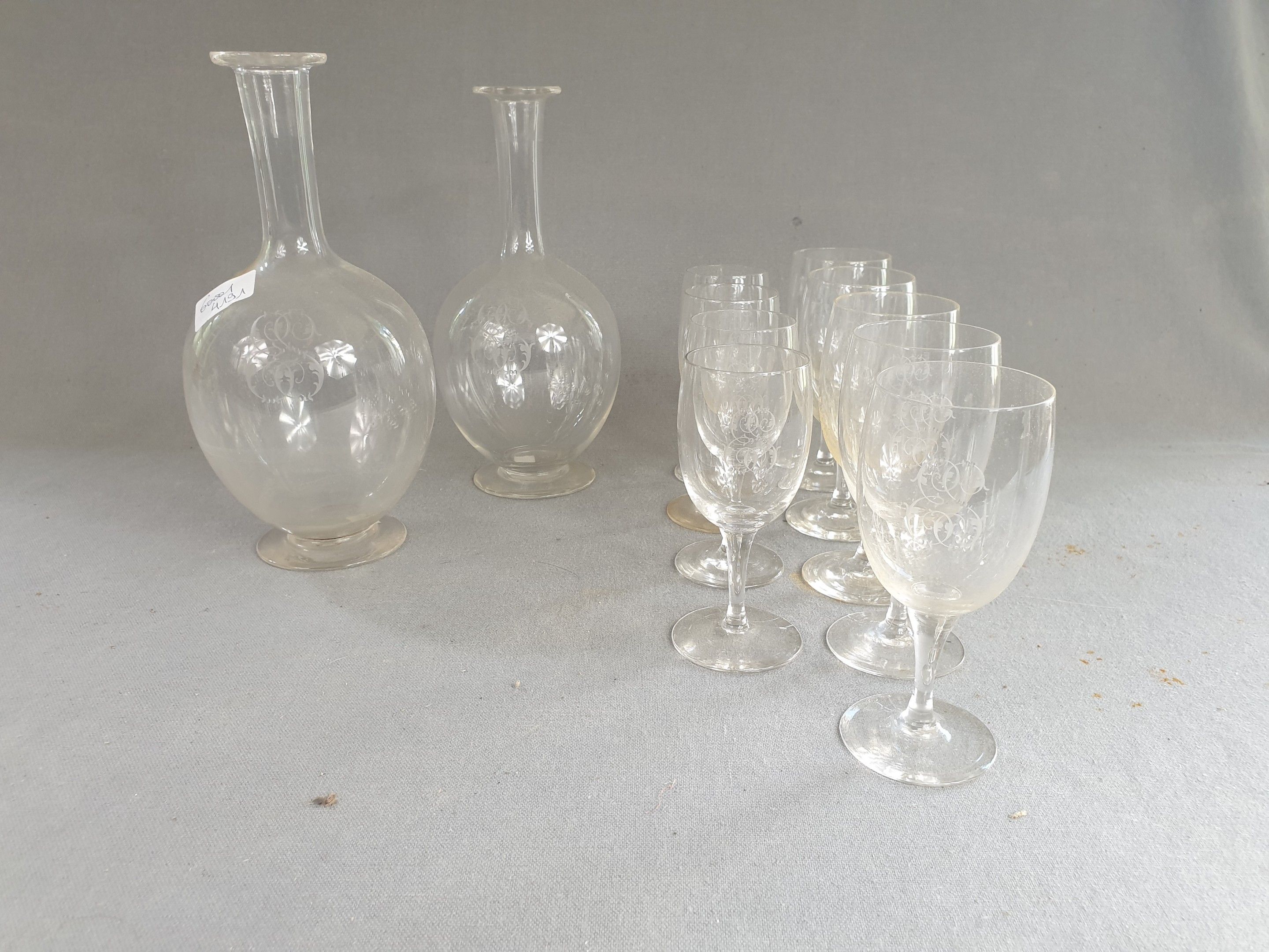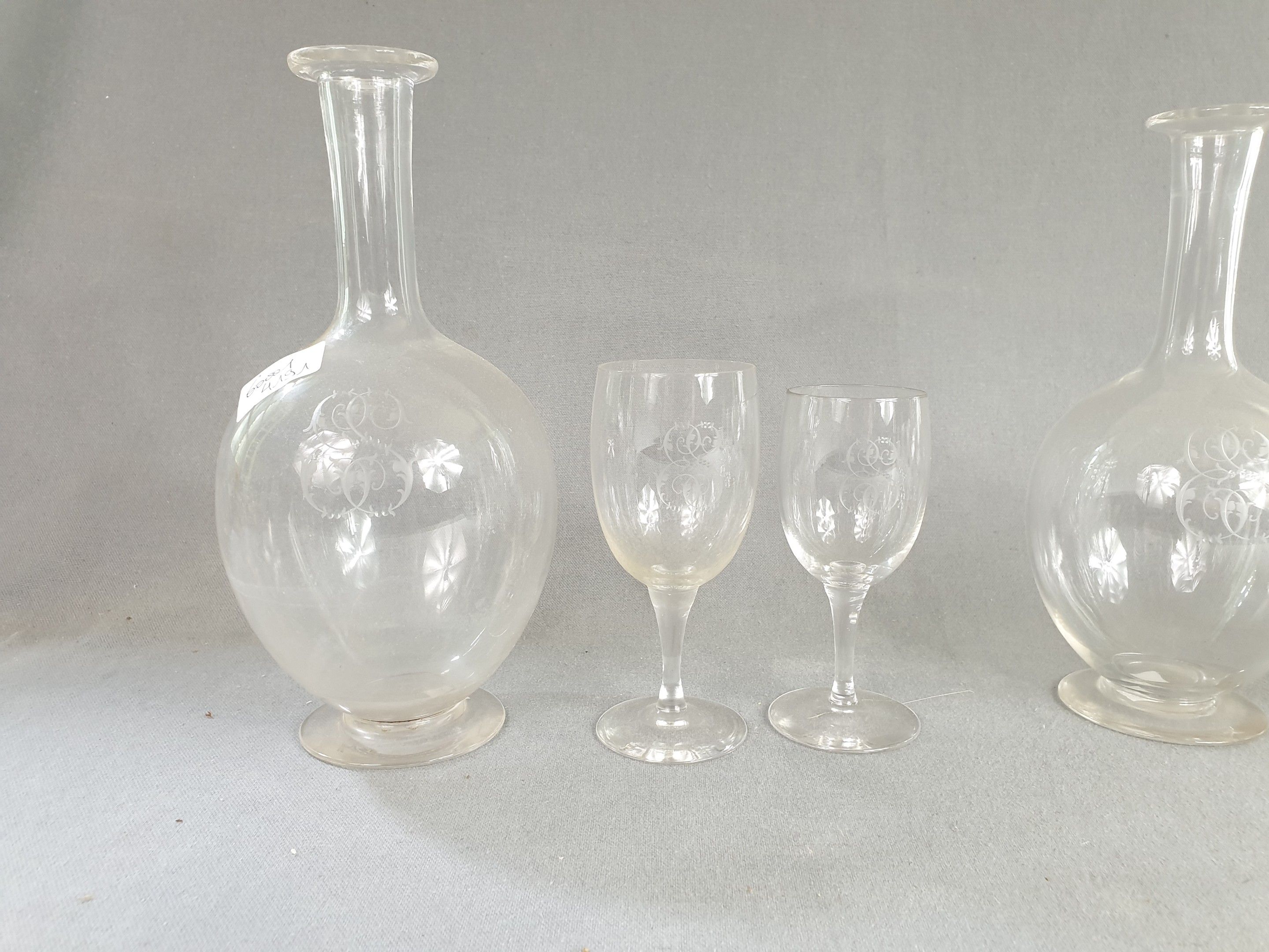Part of a set of crystal glasses, monogrammed ES, comprising 2 decanters and 5 and 4 stemmed glasses (Height: 13.5 and 13cm)