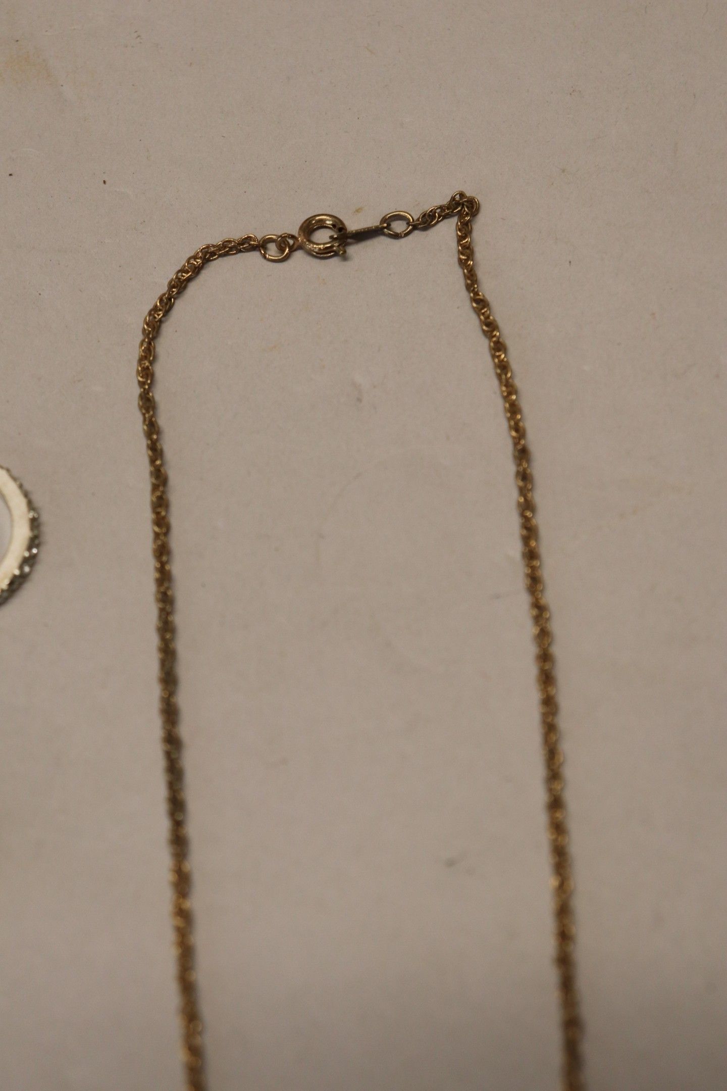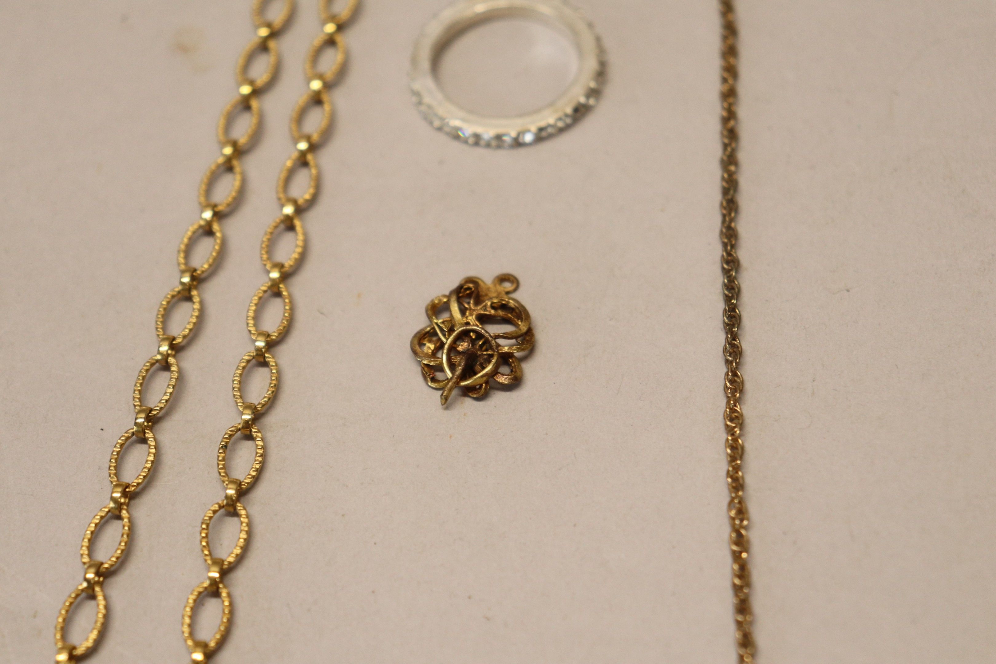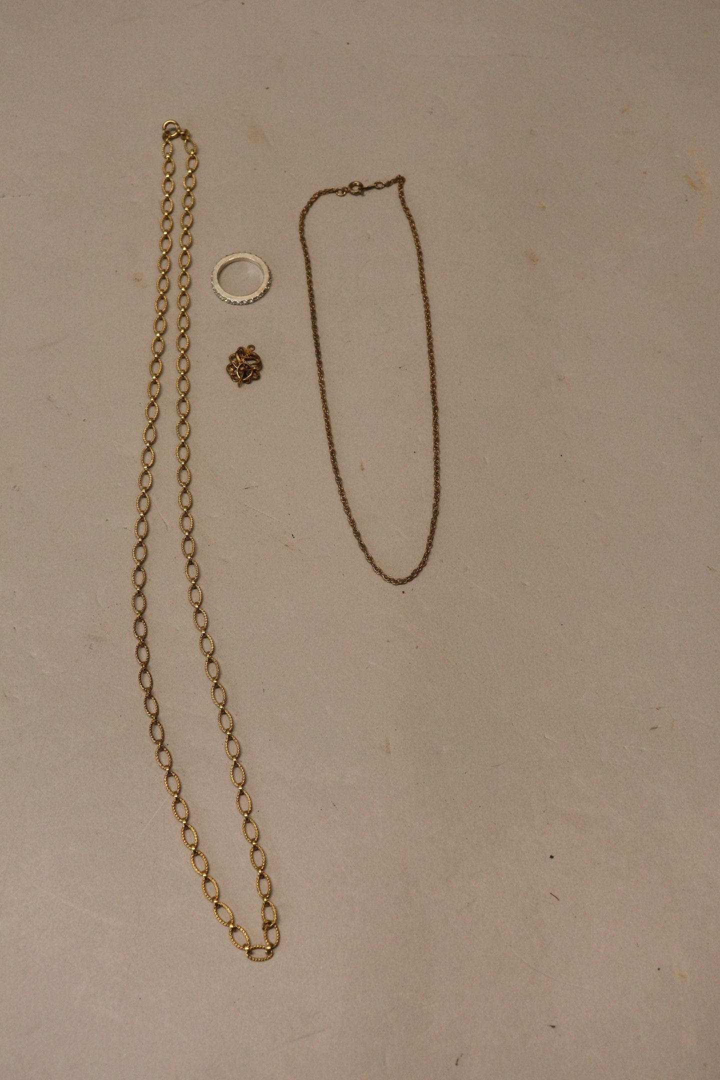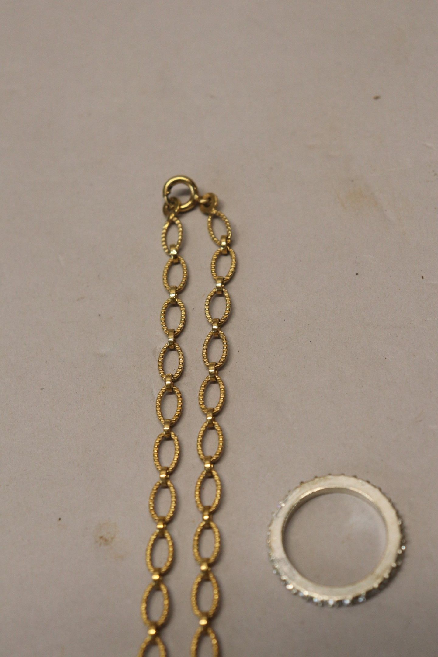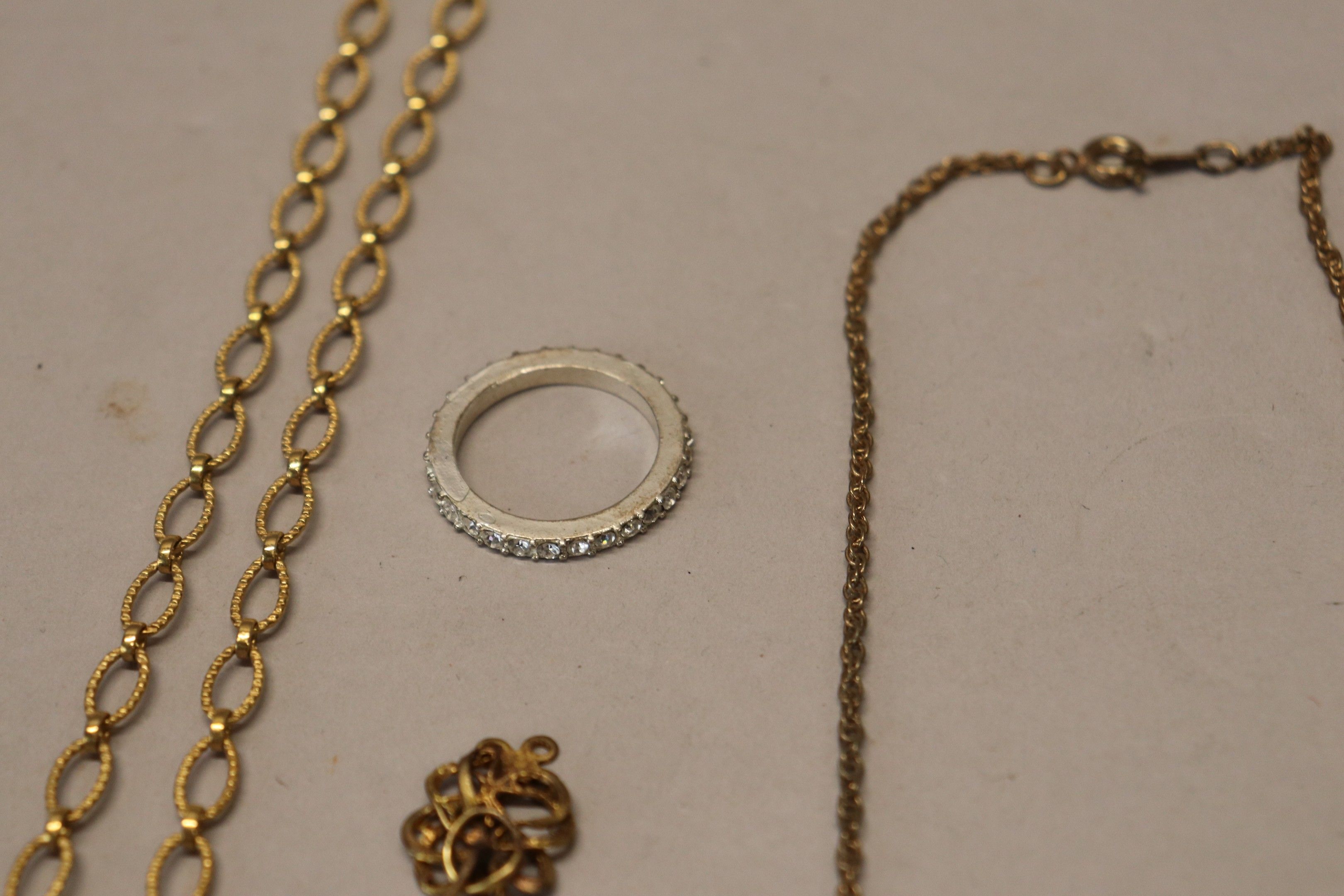 Set of costume jewellery: two gold-plated metal chains, a diamond-studded ring and a gold-plated metal pendant.