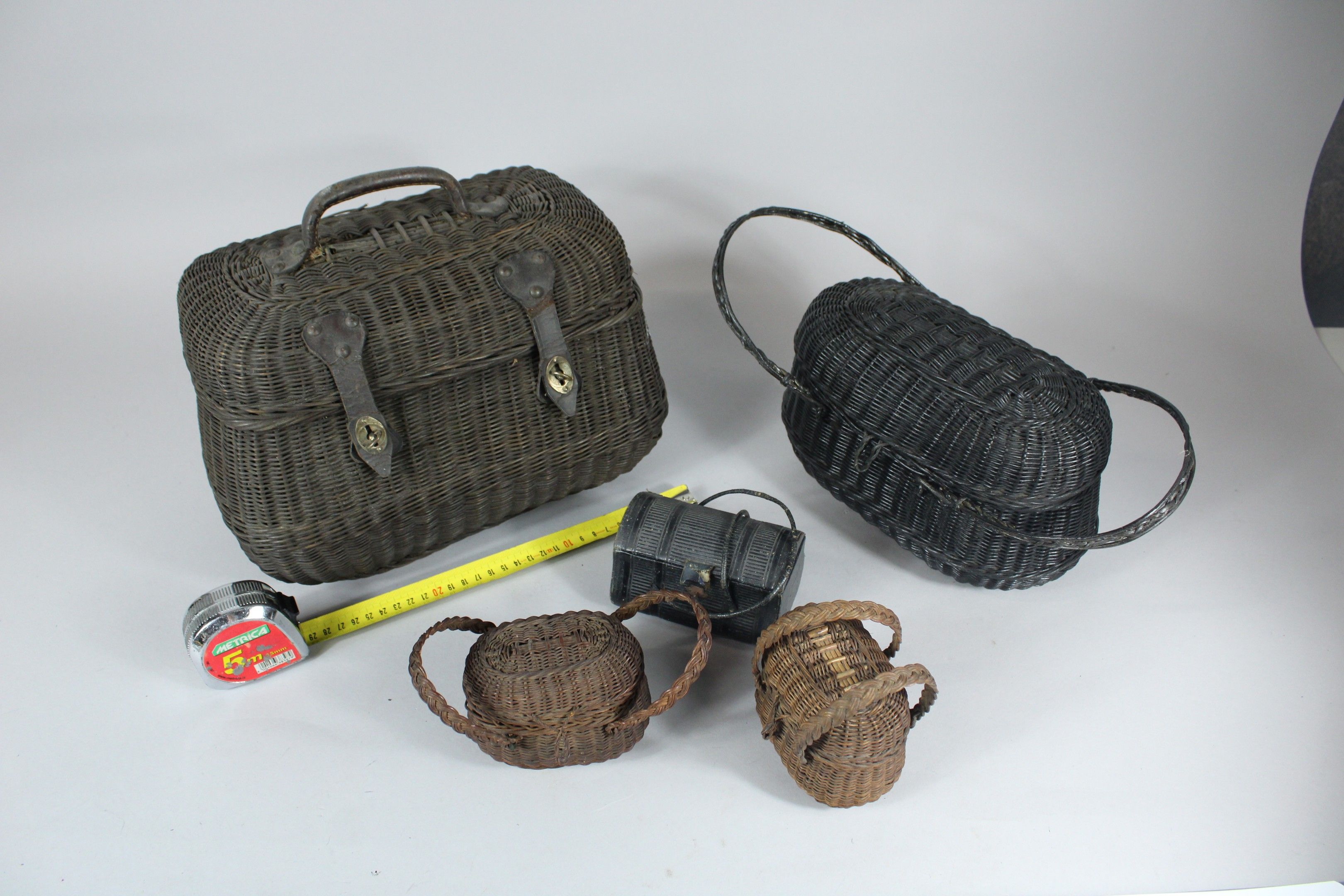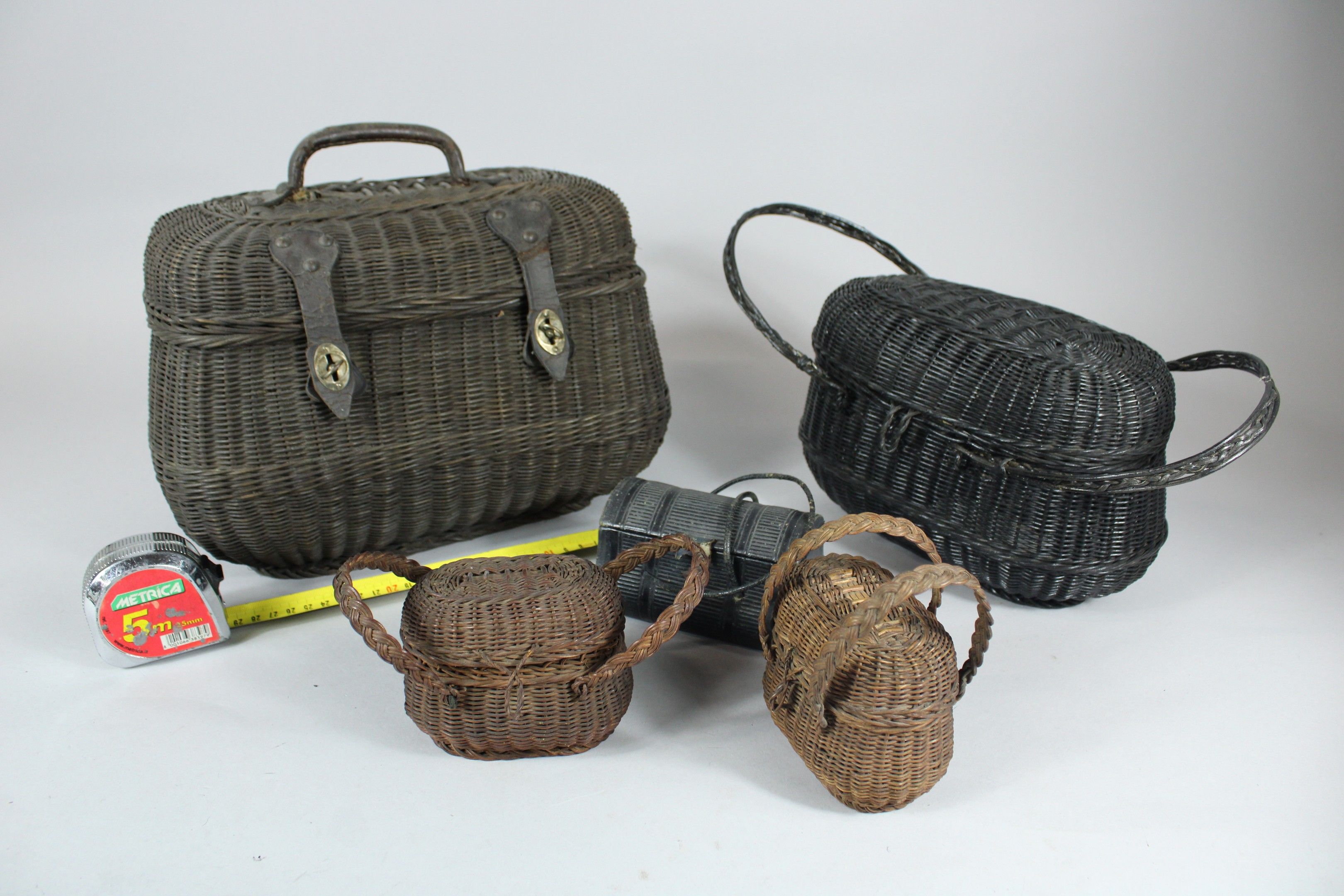 Two rattan wicker egg baskets known as Boutyon (traces of woodworm) 30 cm long, 3 other smaller 19th century baskets are attached.
