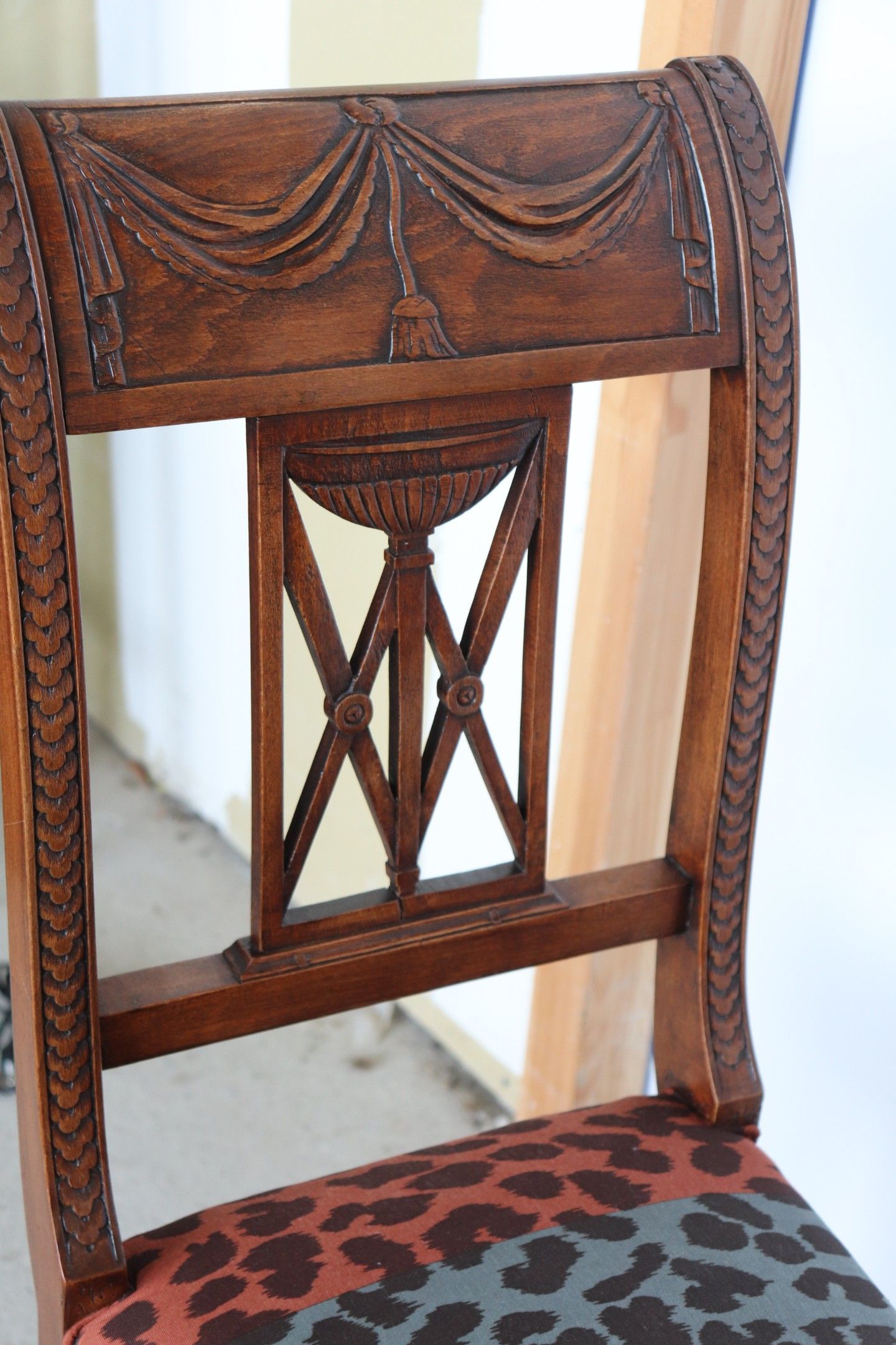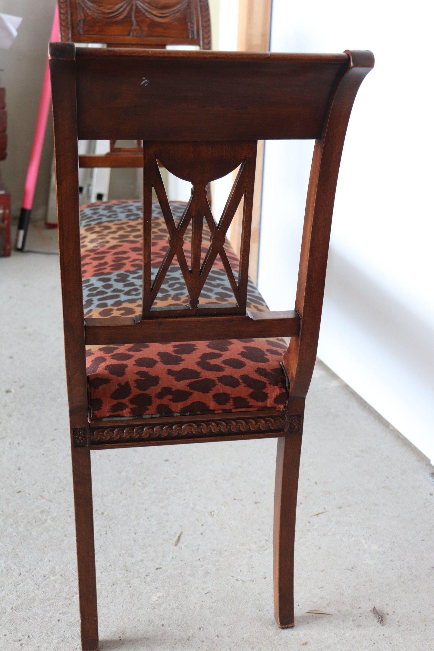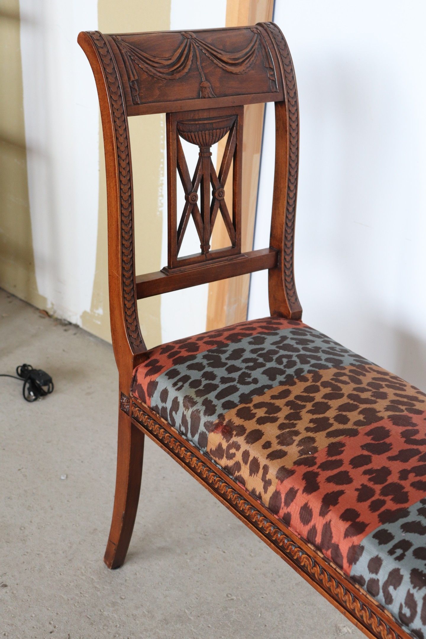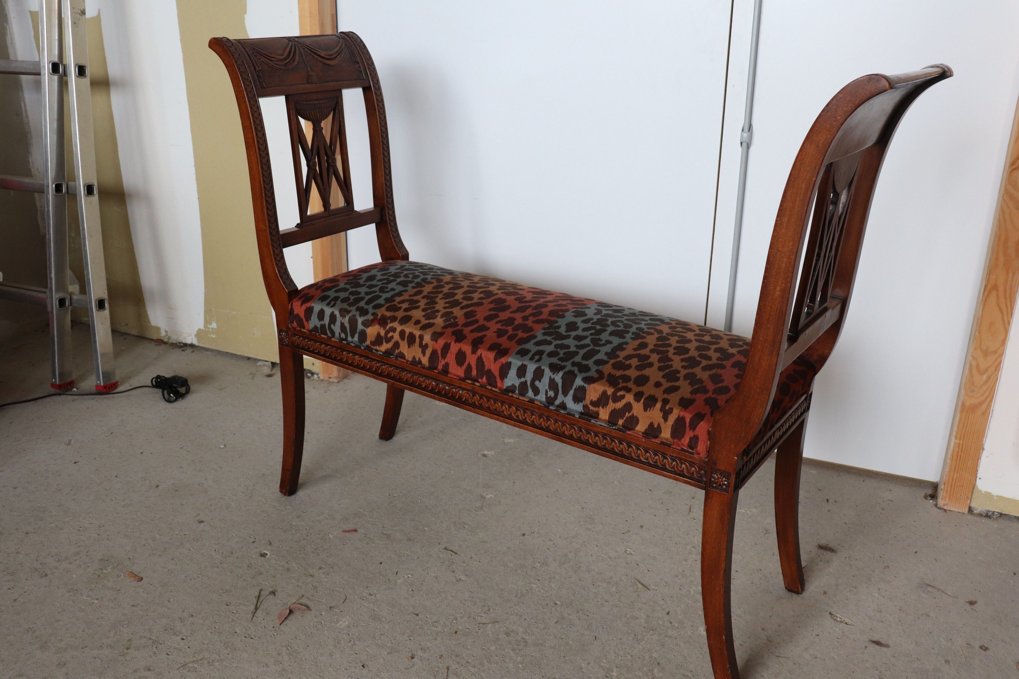 Narrow empire style bench, openwork armrests, modern fabric upholstery. 87 x 112 x 32
