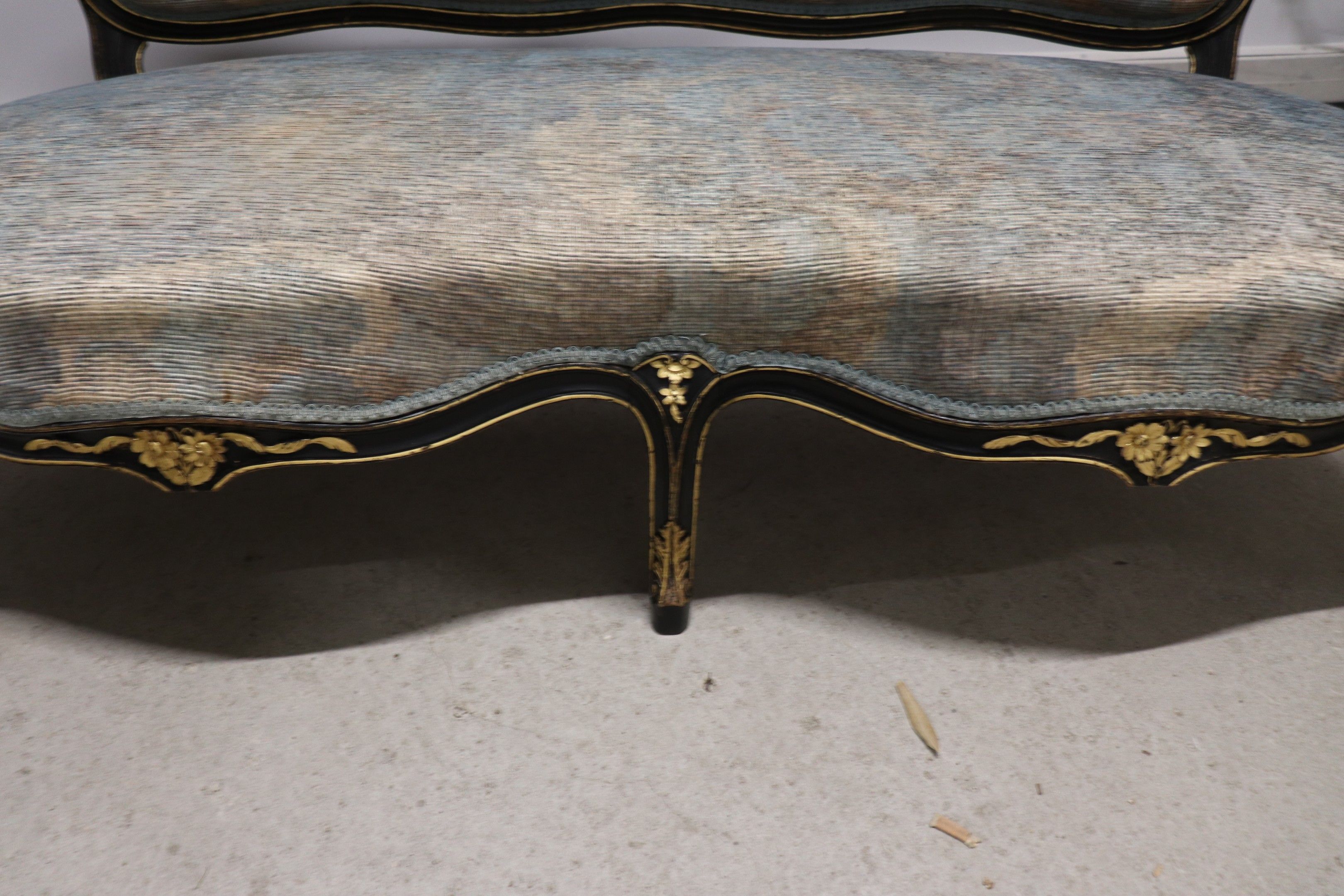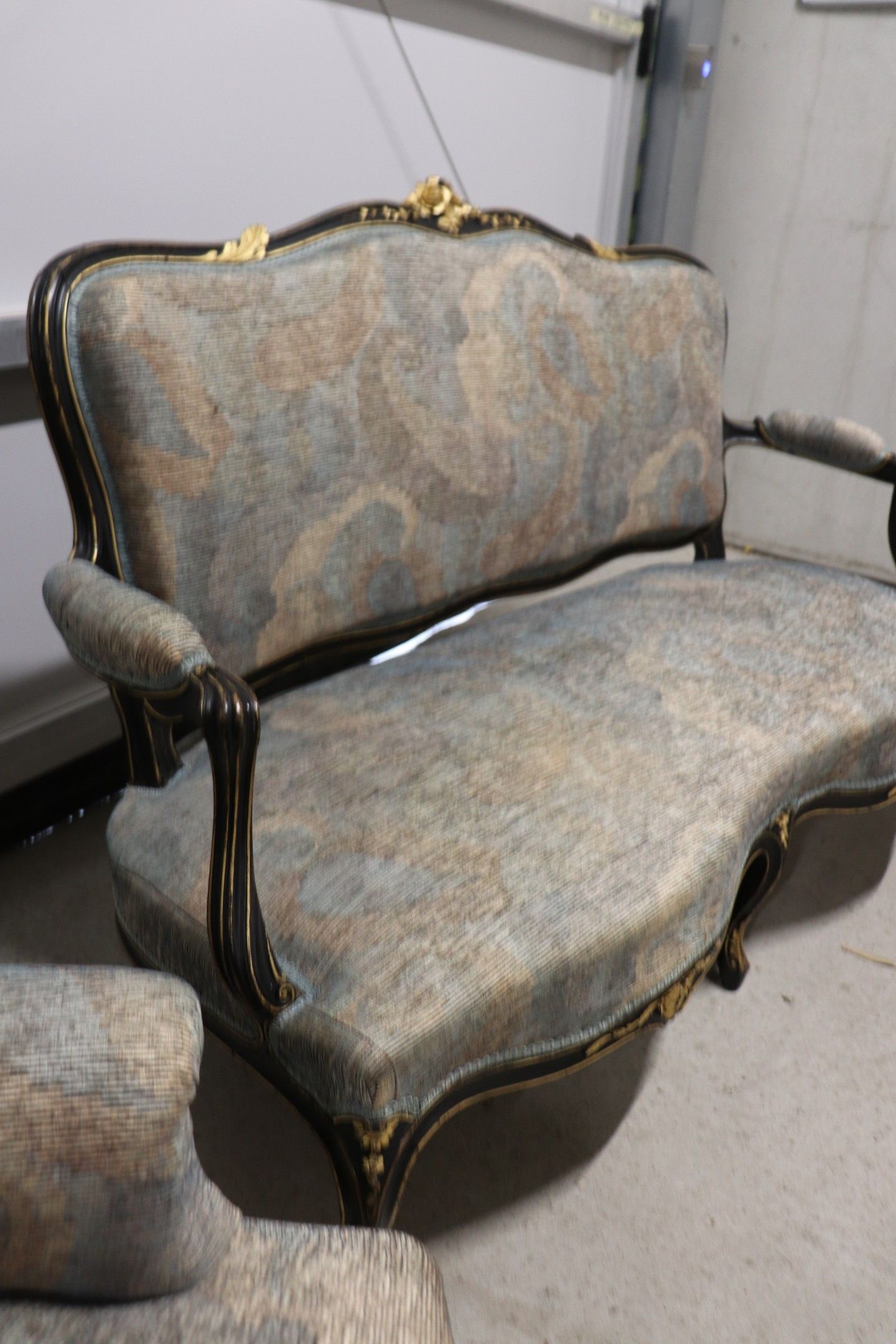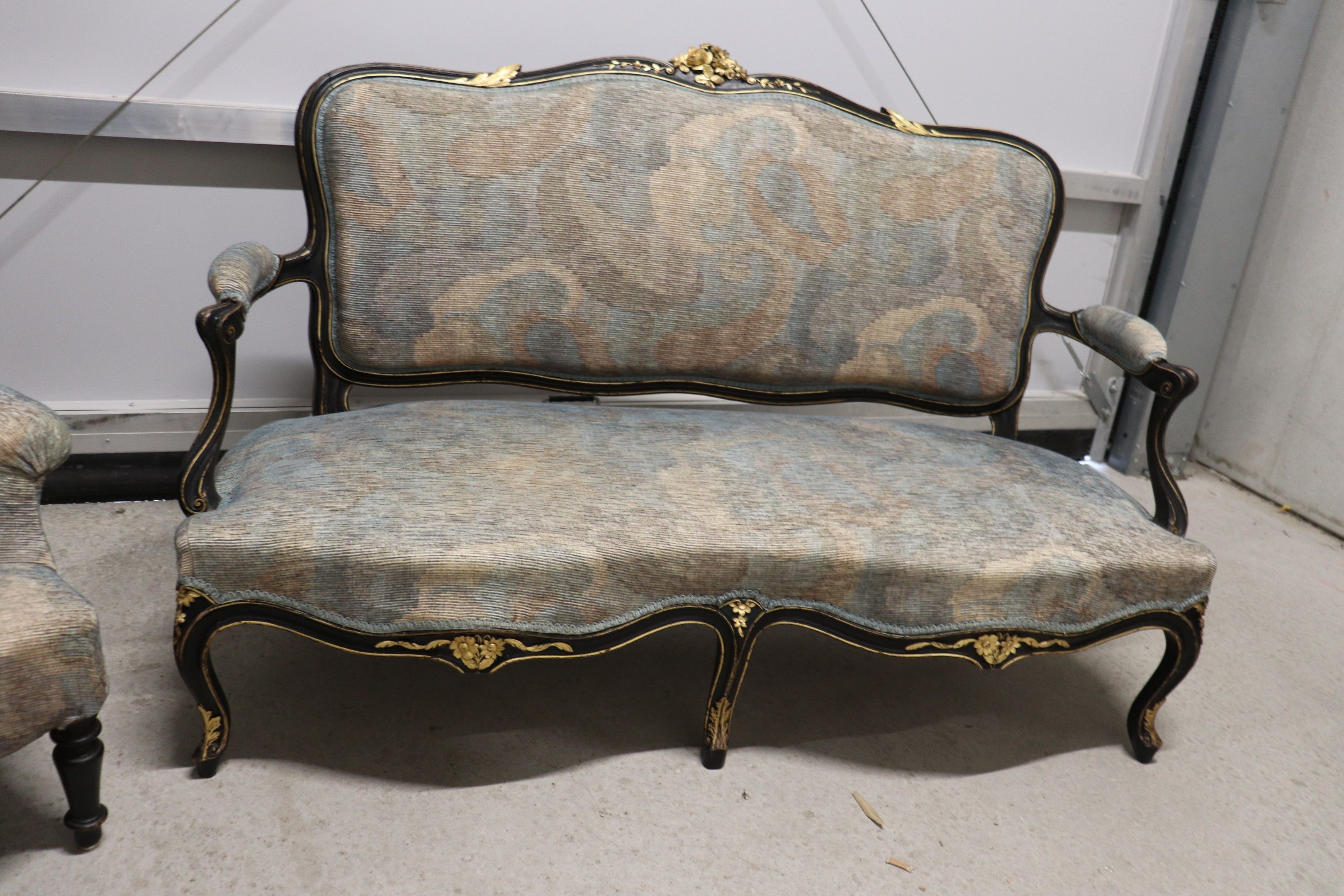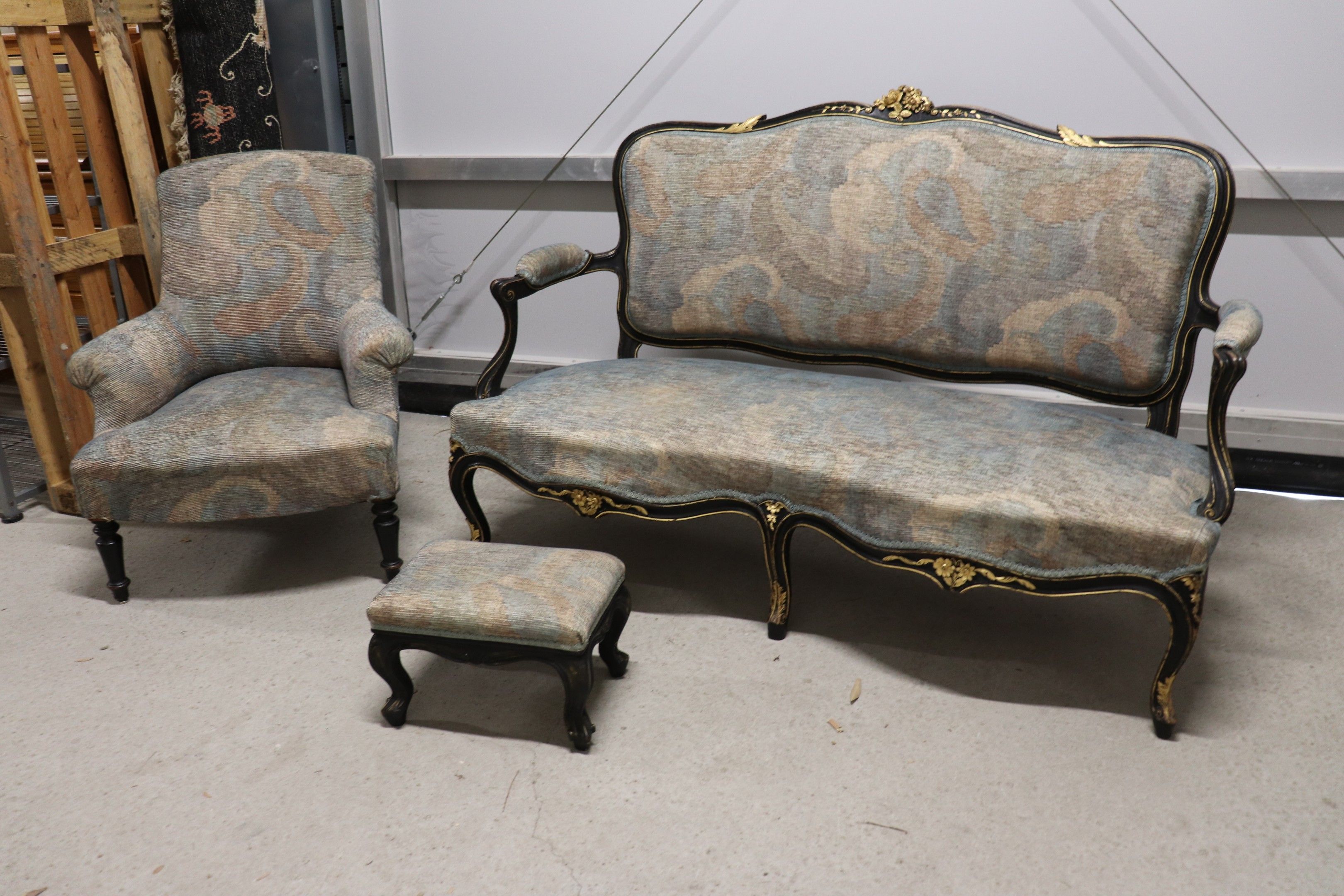 Napoleon III style living room set in blackened and gilded wood, upholstered in modern fabric, comprising a comfortable armchair, a footrest and a bench seat 95 x 140 x 55 cm