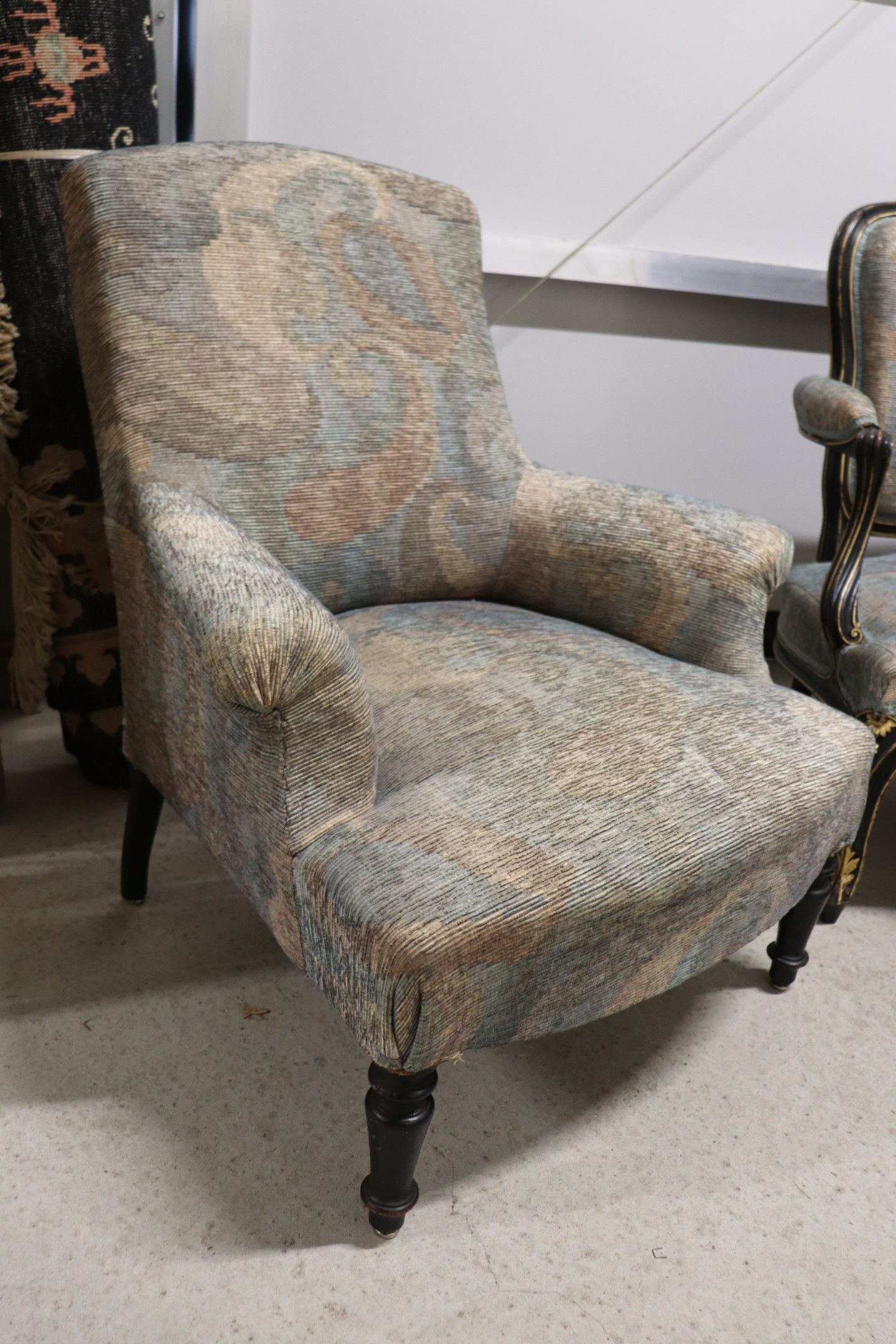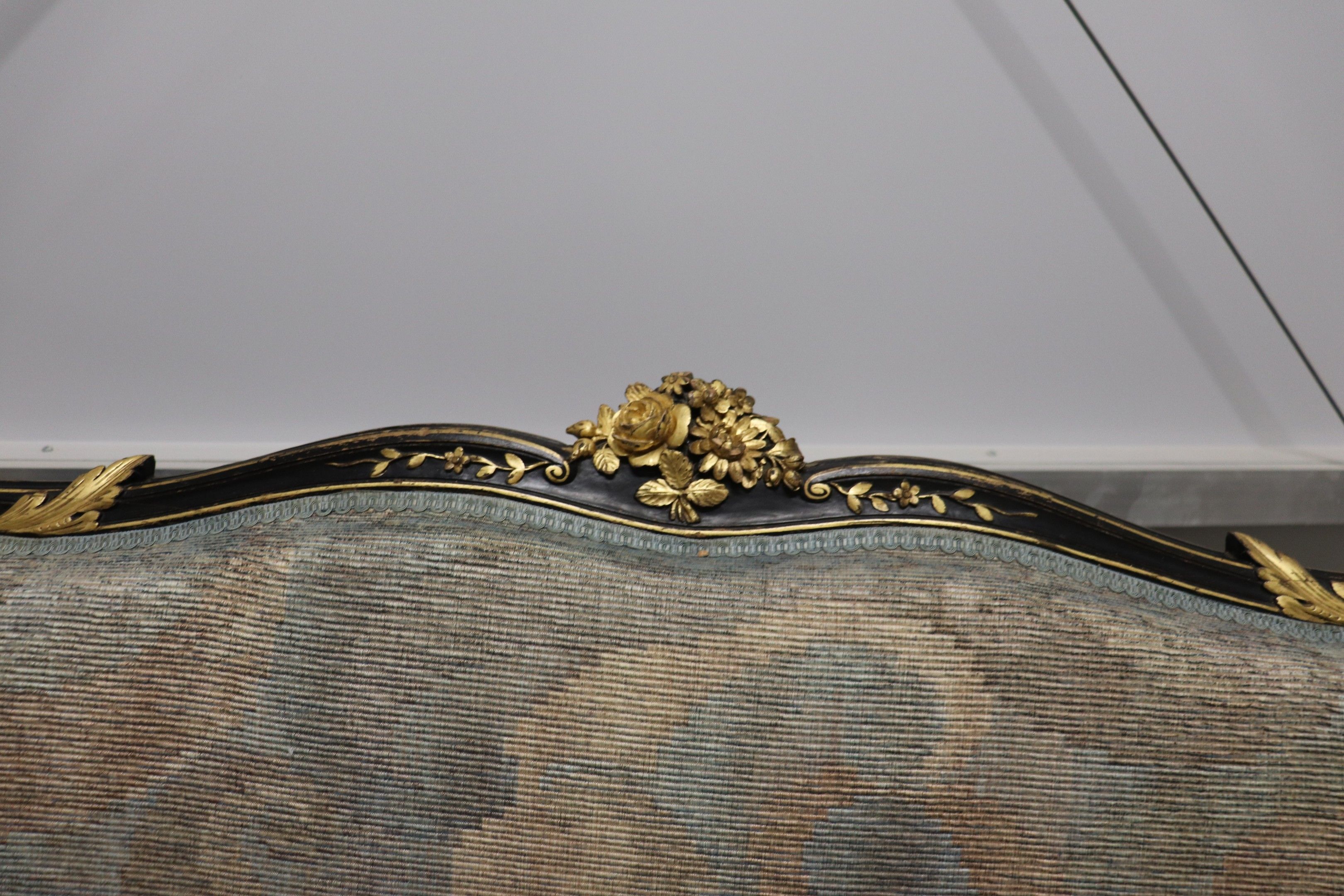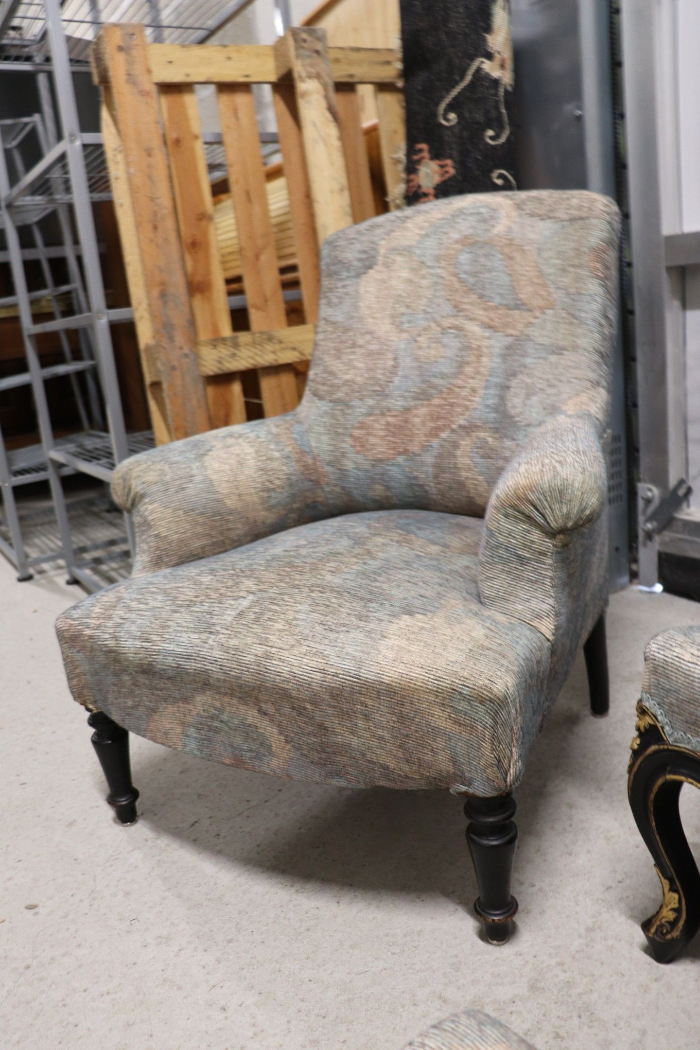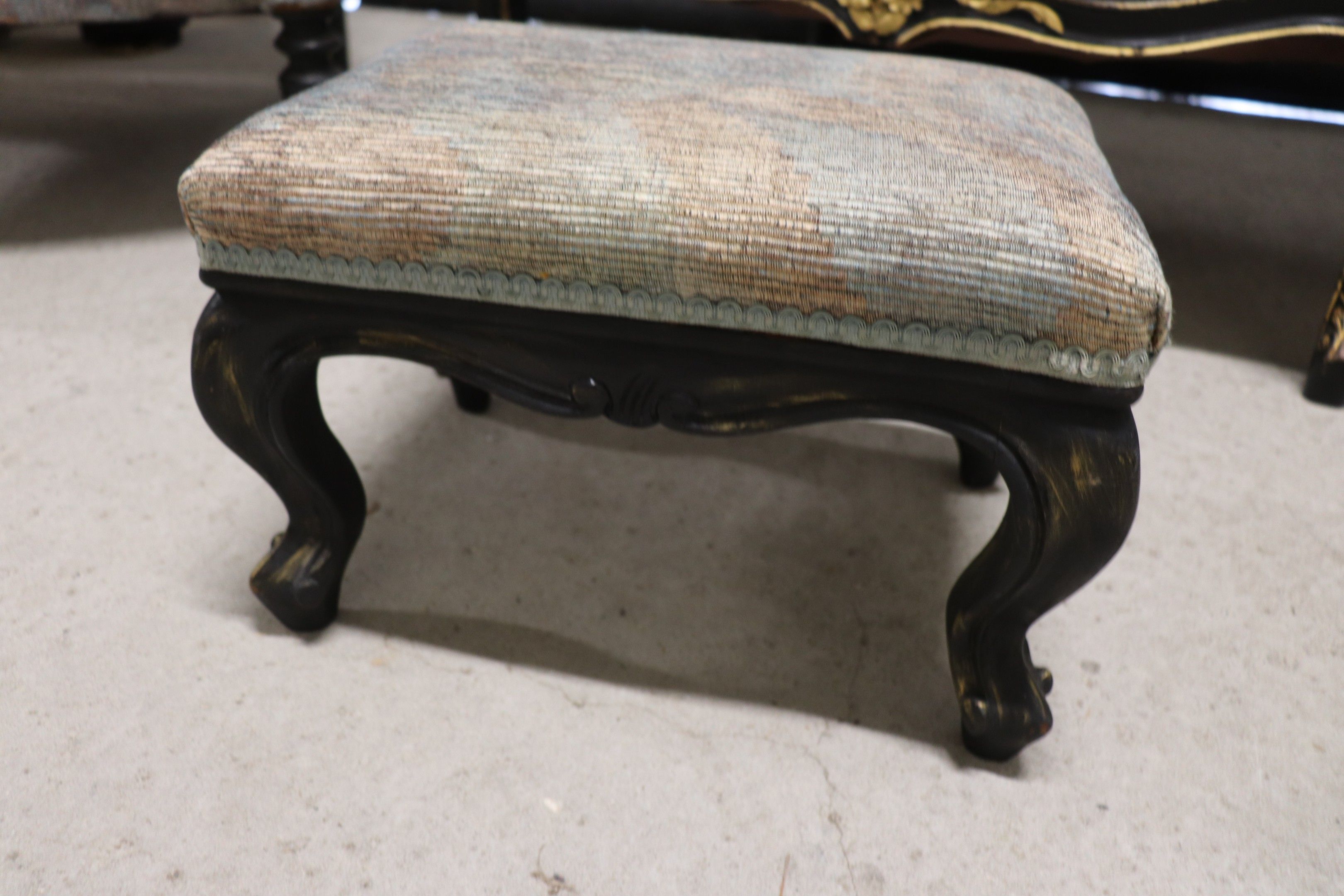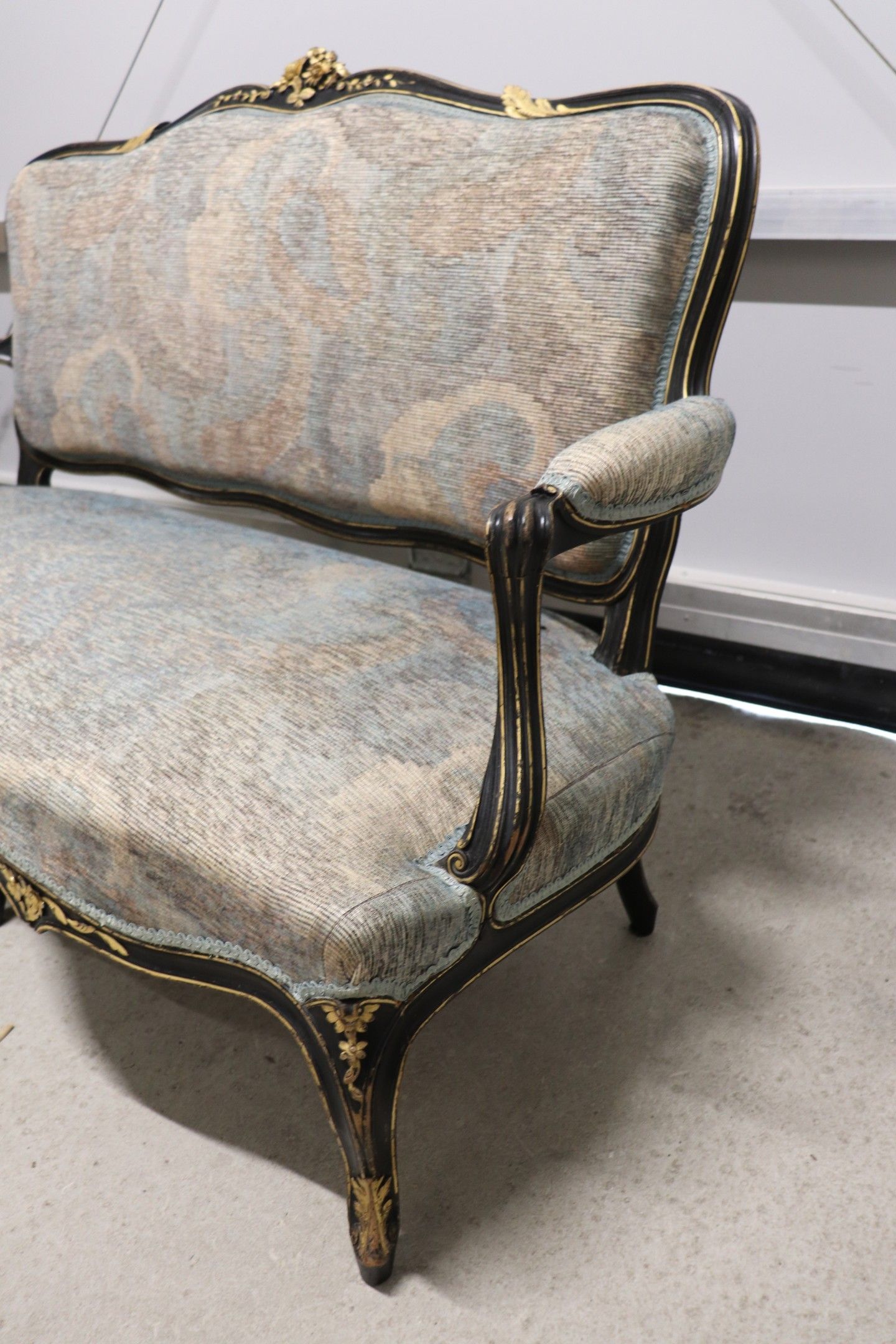 Napoleon III style living room set in blackened and gilded wood, upholstered in modern fabric, comprising a comfortable armchair, a footrest and a bench seat 95 x 140 x 55 cm