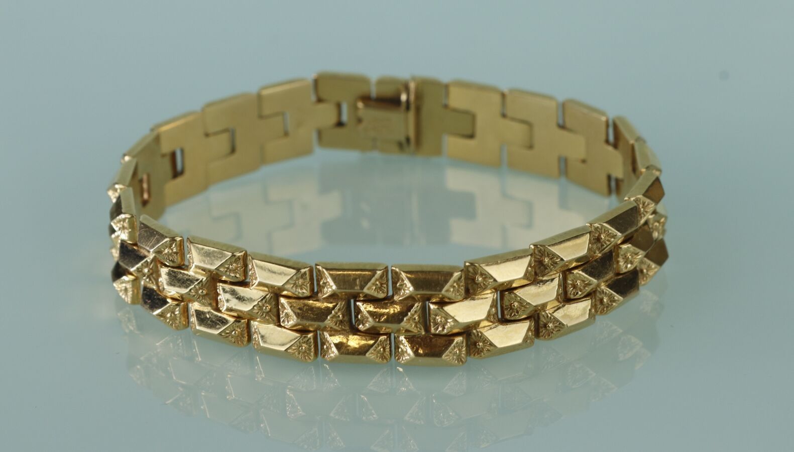 Articulated bracelet in 18 carat yellow gold with partially engine-turned links. Length: 19 cm. Weight 20 g