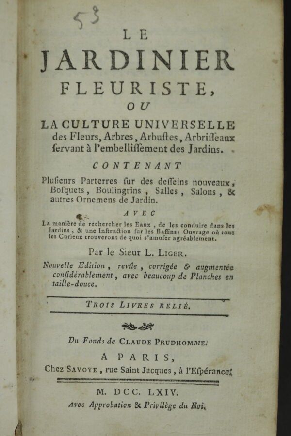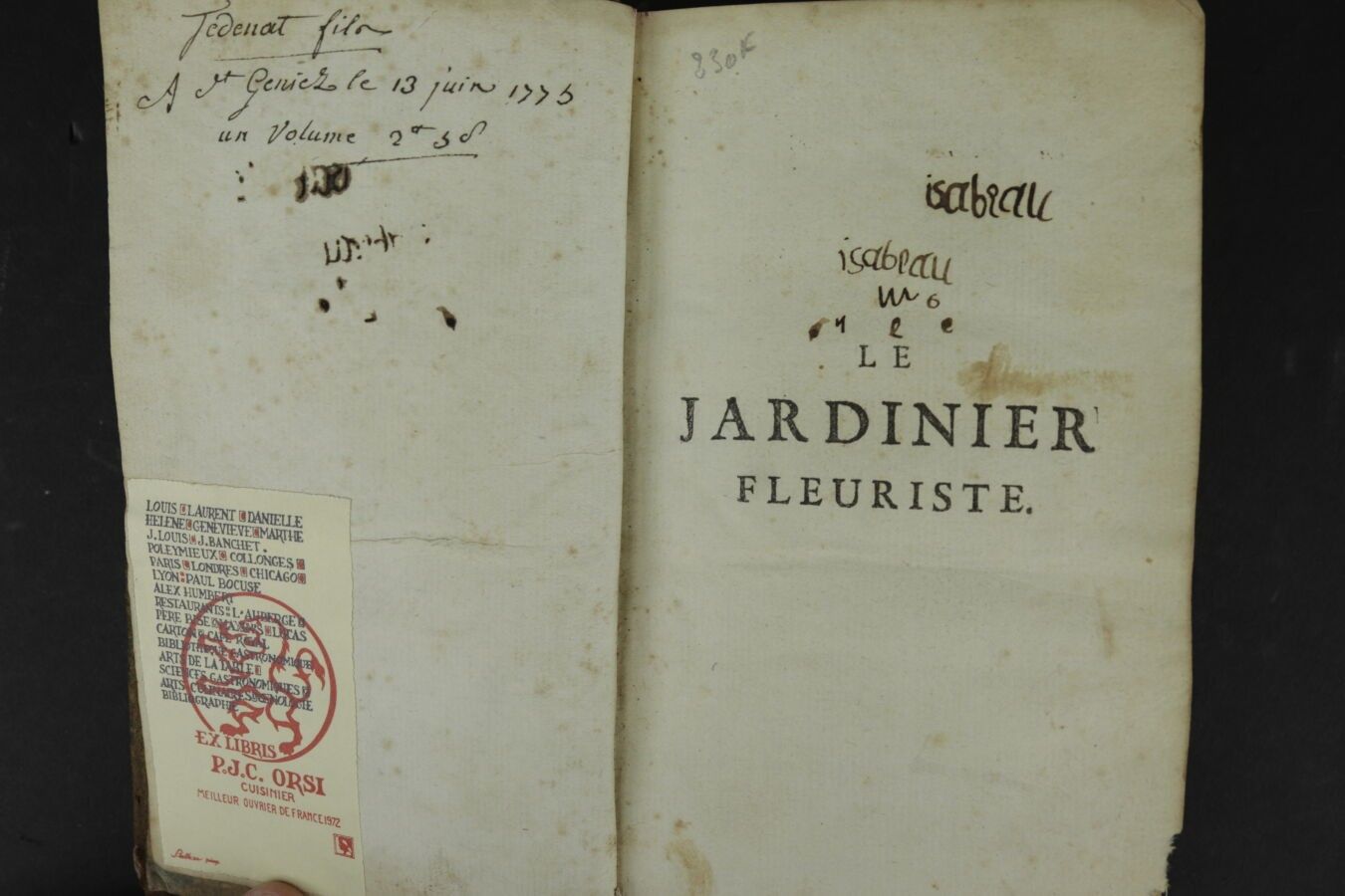LIGER, Louis - Le Jardinier Fleuriste ou la culture universelle des Fleurs, Arbres, Arbustes, Arbrisseaux servant à l'embellissement des jardins. A Paris, chez Savoye. M. DCC. LXIV. 1 vol. in-12 marbled calf spine. Ex libris P.J.C. ORSI - Chef - Meilleur ouvrier de France 1972. Some annotations and accidents, cover damaged and partly repaired.