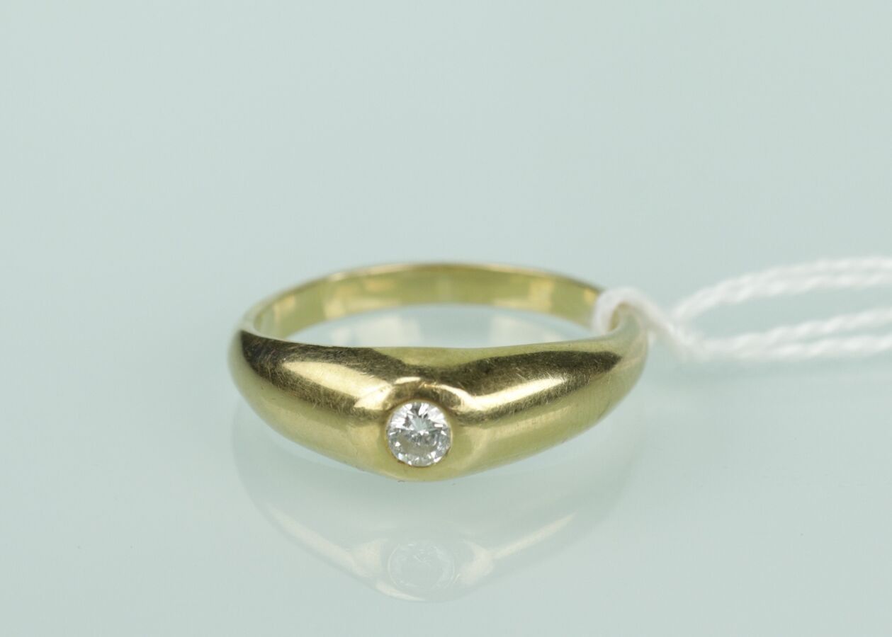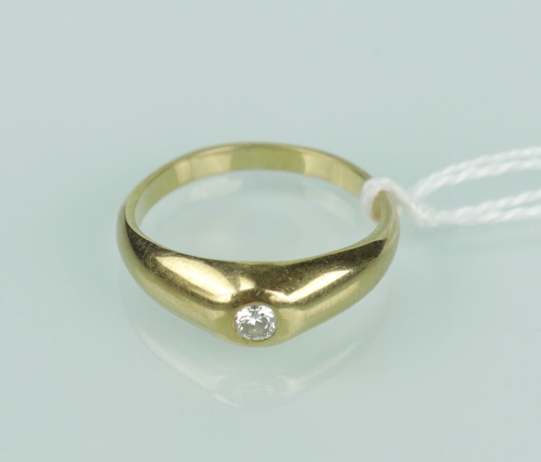 18 carat yellow gold band ring with central diamond. TDD 56. Gross weight 4.2 g