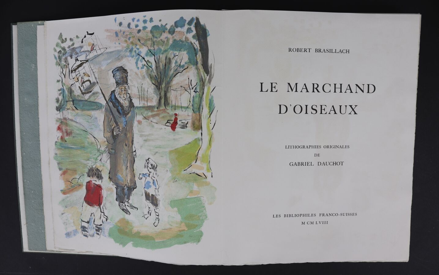 BRASILLACH, Robert (text) and DAUCHOT Gabriel (illustrator) - "Le marchand d'oiseau", Les Bibliophiles franco-suisses, 1958. In-4 in sheets with filled cover and slipcase. Copy n°30 printed for Mr Henri Donon-Maigret. Some foxing and light transfer, cover and slipcase damaged.