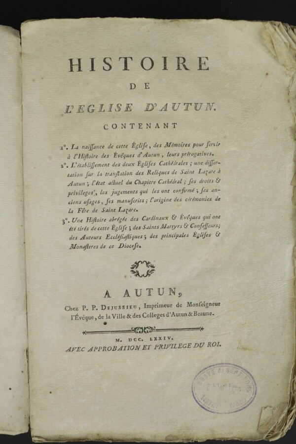 GAGNAIRE (Abbé). Histoire de l'église d'Autun. A Autun, Dejussieu, 1774. 1 vol. in-8 paperback, in paperback covers.