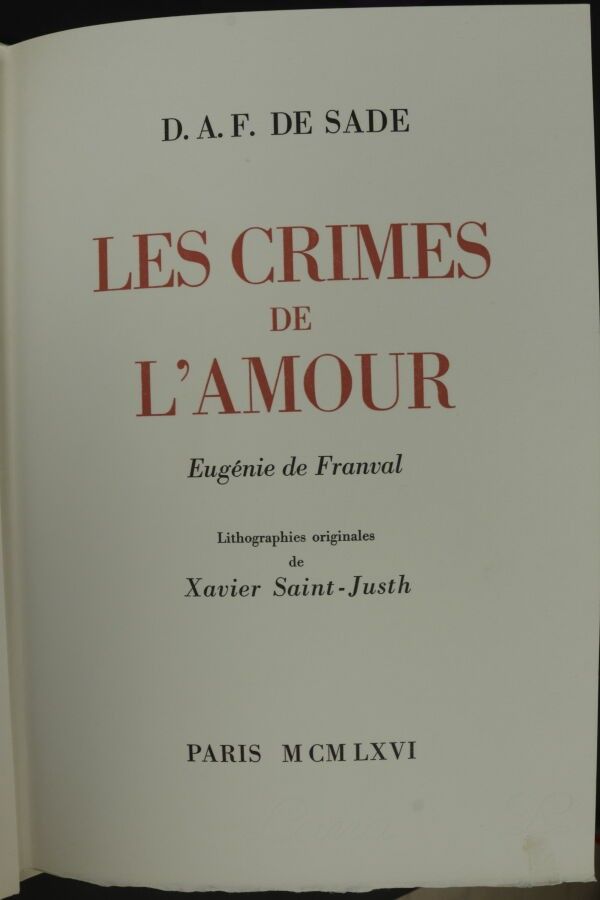 - DE SADE - The crimes of love. Lithographs by X. Saint-Justh. Paris. 1966. Copy n°632 on Lana vellum. Roussures, slightly soiled cover.