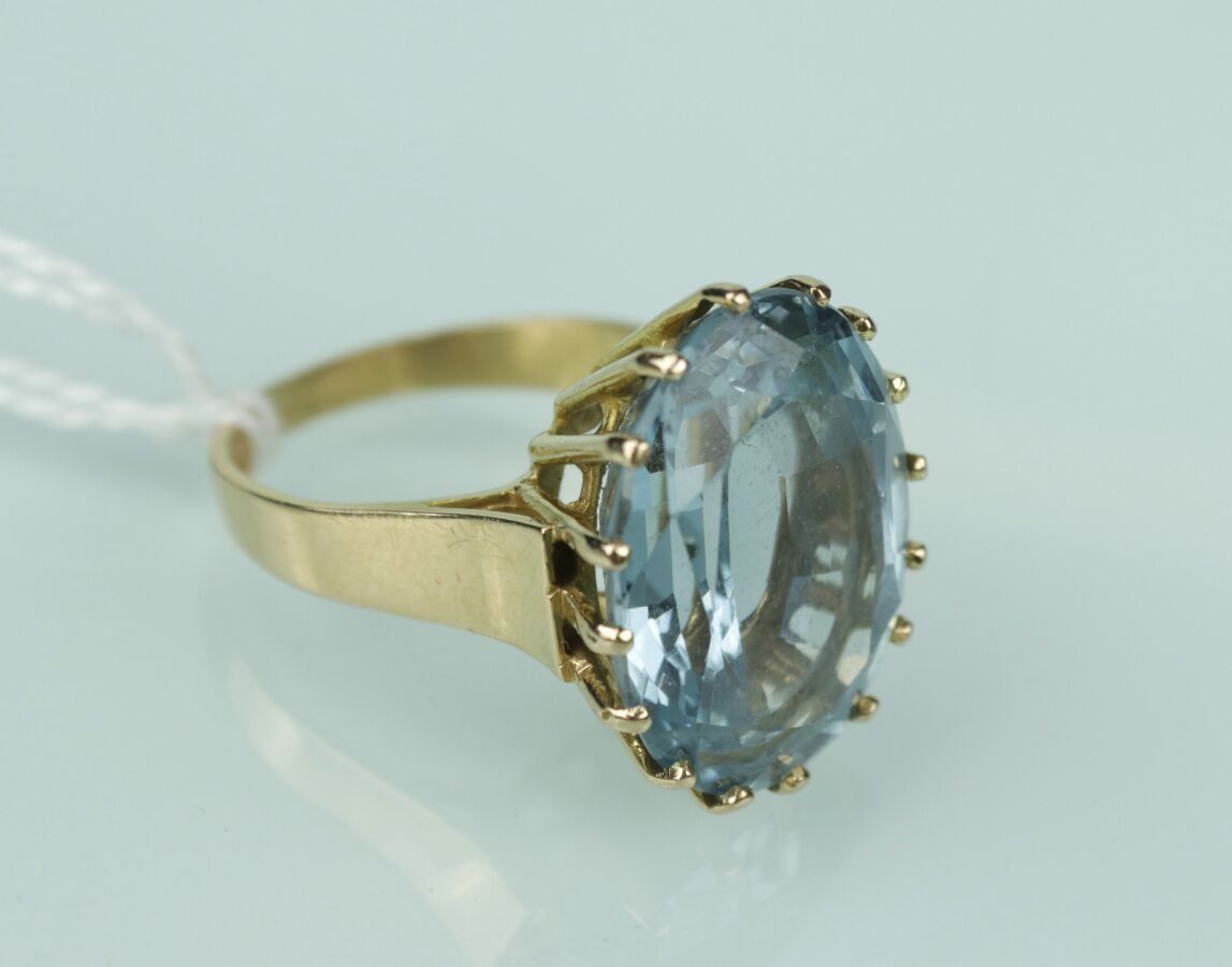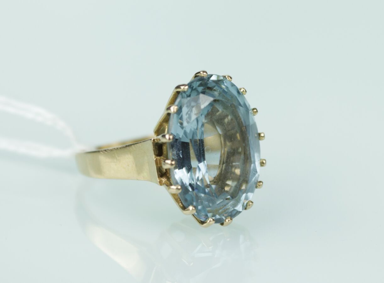 18 carat yellow gold cocktail ring set with a large claw-set pale blue oval stone (approx. 19 x 14 mm). TDD 56 - Gross weight 9.6 g