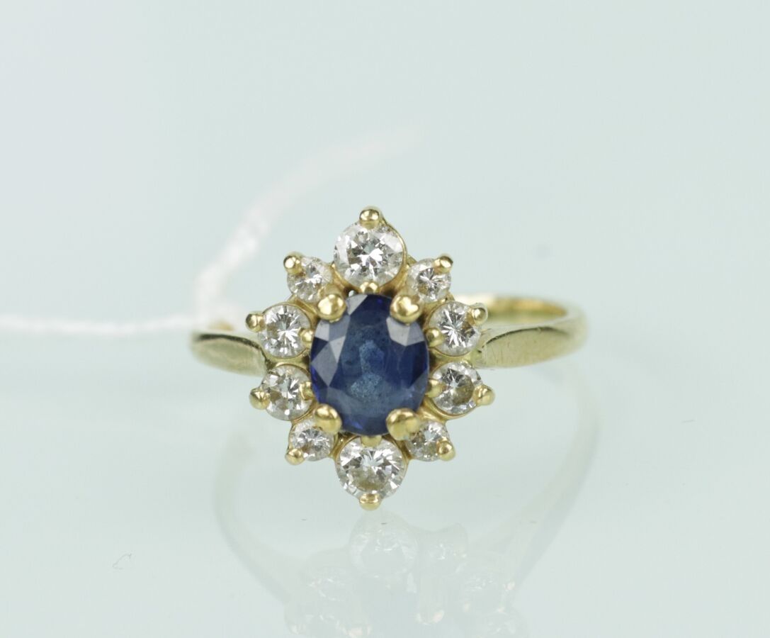 Daisy ring in 18 carat yellow gold set with a sapphire in a diamond setting. TDD 55 - Gross weight 3.5 g