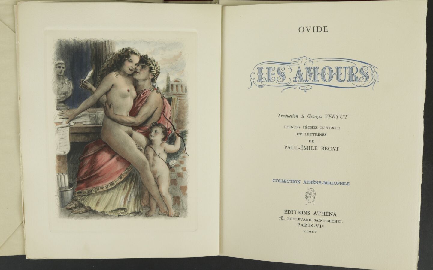 - OVIDE - Les amours. Drypoints and lettering by P.E. Bécat. Éditions Athéna, Paris. 1954. Copy n°7 on vellum pur fil BFK de Rives. With a black suite and a copper plate. Box damaged