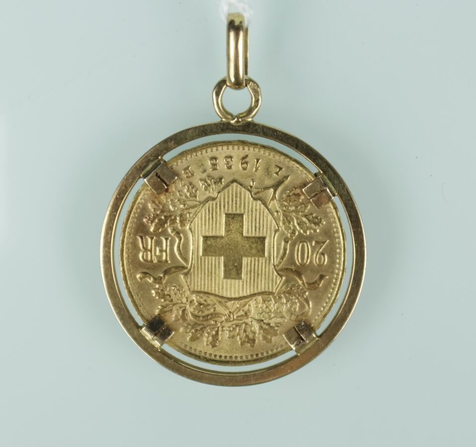 18 carat yellow gold pendant holding a 20 Swiss franc coin.