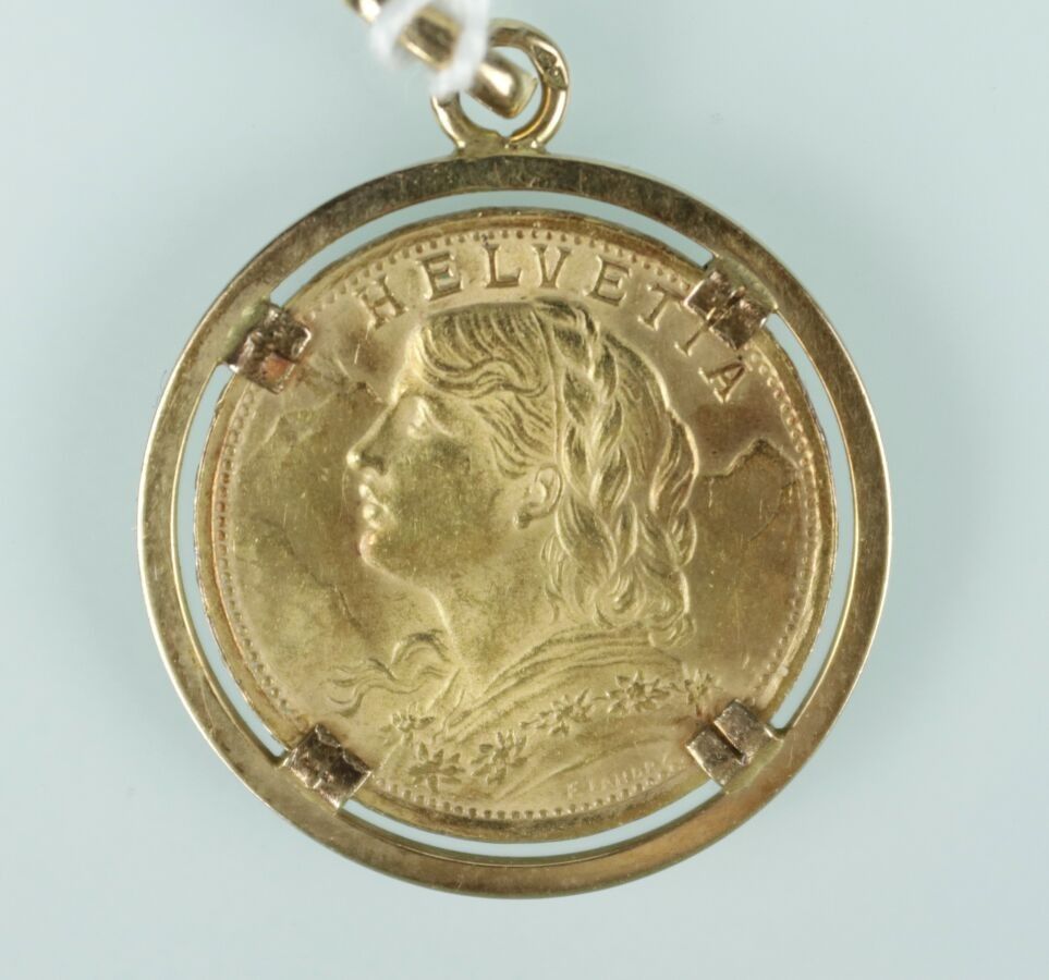 18 carat yellow gold pendant holding a 20 Swiss franc coin. Total weight 8.9 g