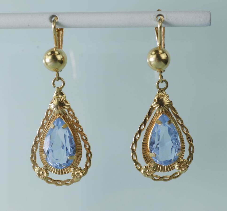 Pair of 18 carat yellow gold earrings set with a pear-shaped pale blue stone. Height 4.2 cm - Total gross weight 7 g