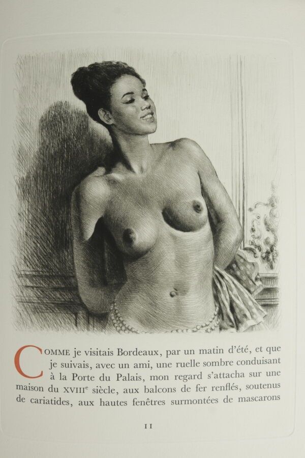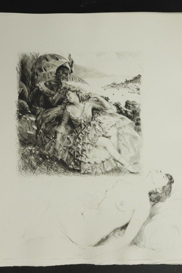 - REBELL, Hugues - Les nuits chaudes du Cap Français. Engravings by P.E. Bécat. Editions Germaine Raoult, Paris, 1953. Copy n°6 on Rives vellum, with a suite in black, a copper printing plate, a silk print, a sketch and a refused plate in 3 states. Rust, a few folds, wrapper damaged and roughly repaired with scotch tape.