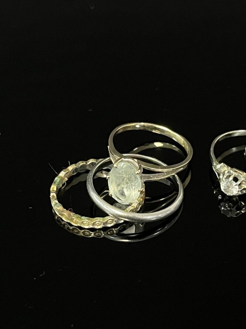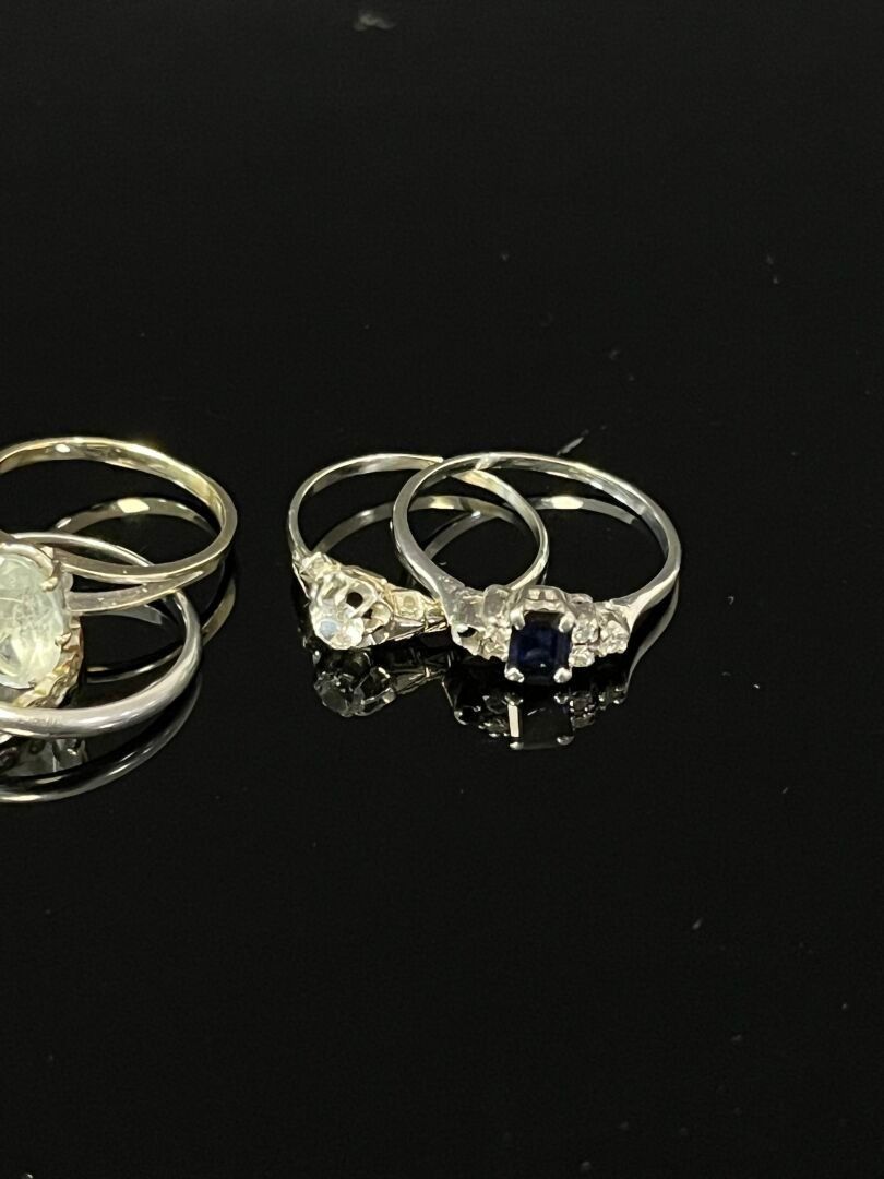 LOT in 750/°°° 18K yellow and white gold comprising two wedding rings, one of which is worked, and three small rings set with fantasy stones.