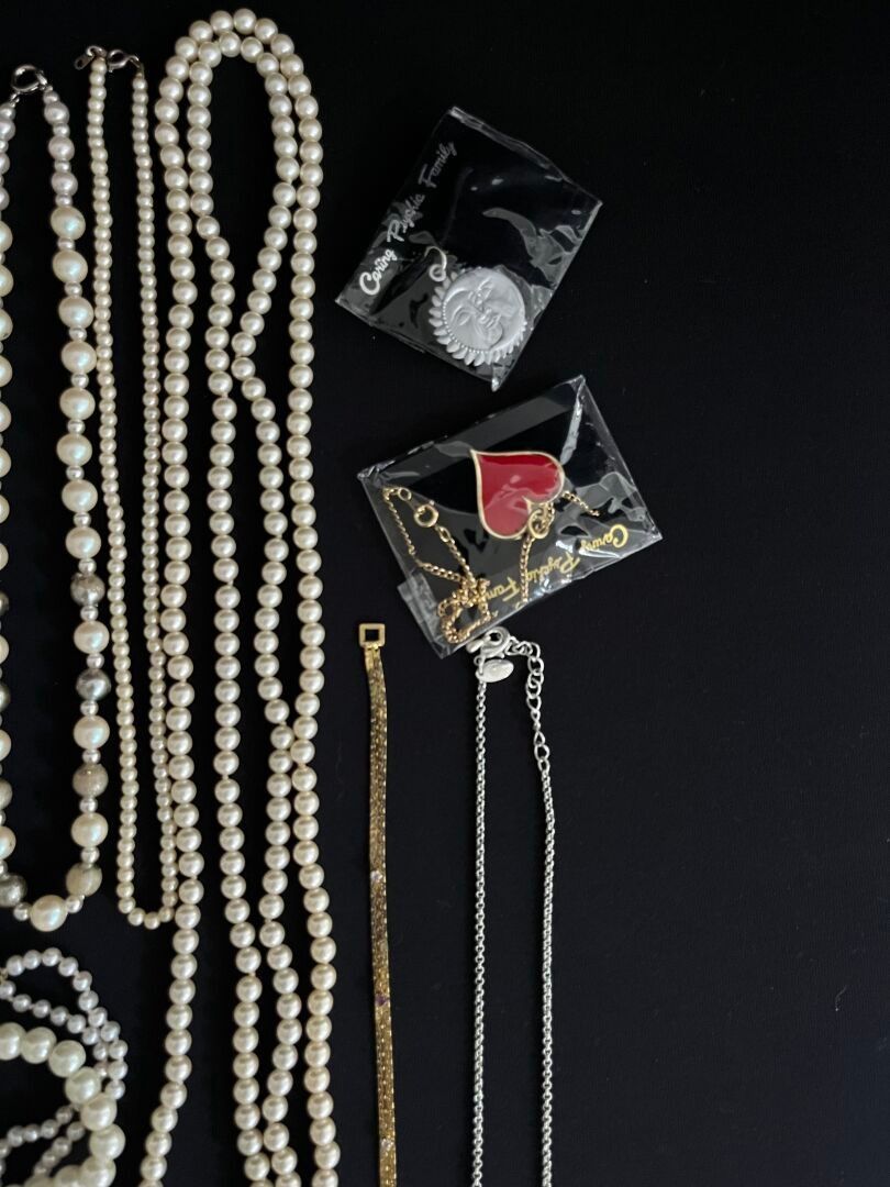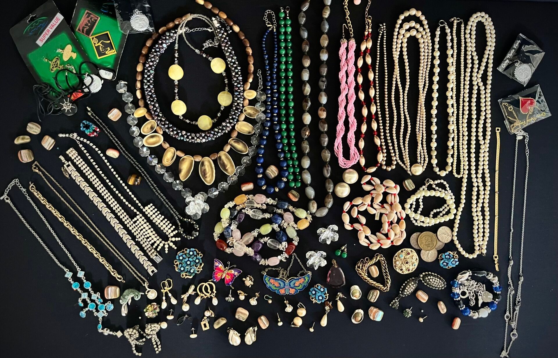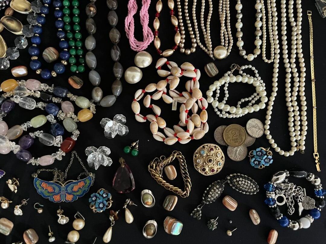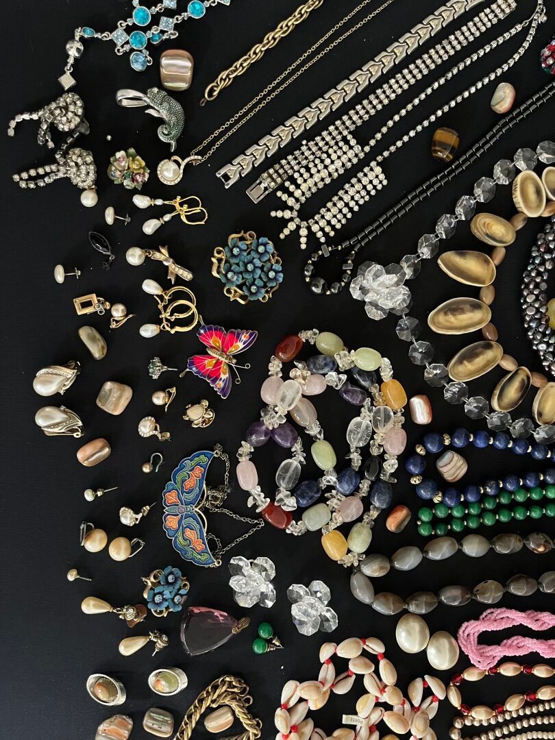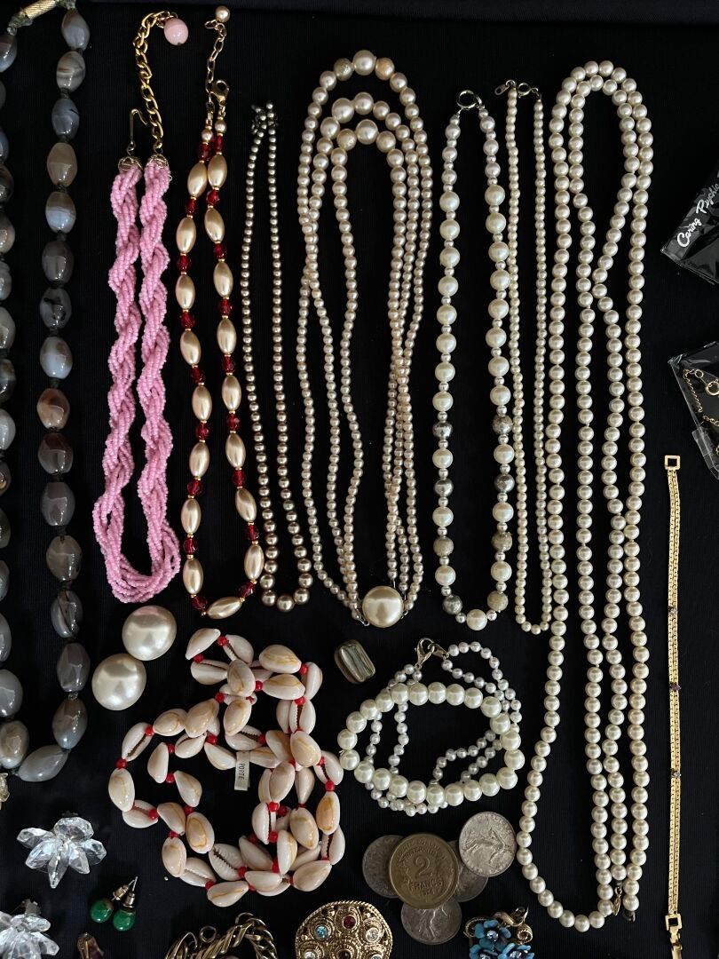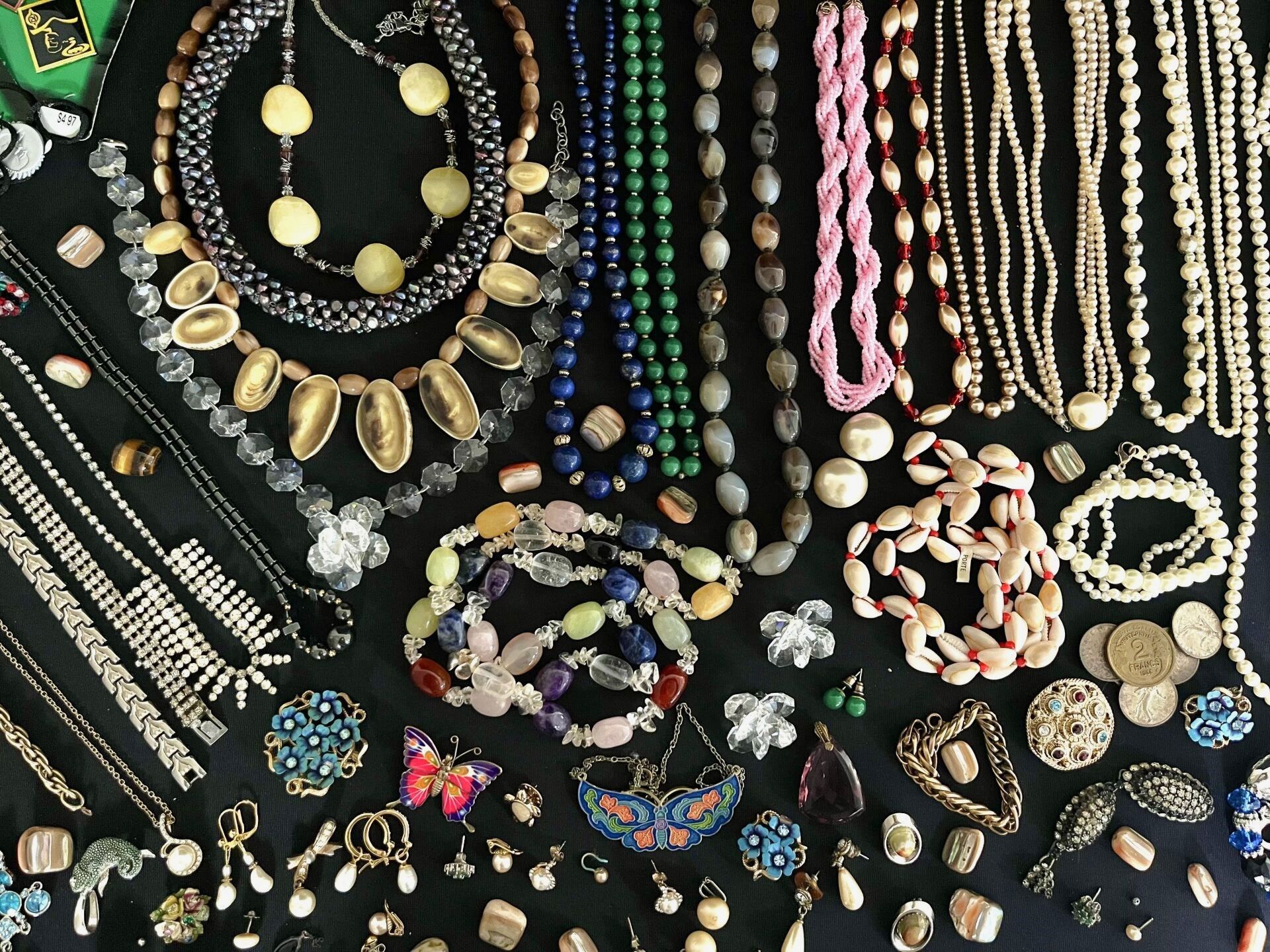 [Fancy jewellery]. LOT of costume jewellery in gilded metal including necklaces, pendants, long necklaces, bracelets and miscellaneous in costume pearls, costume stones and miscellaneous.