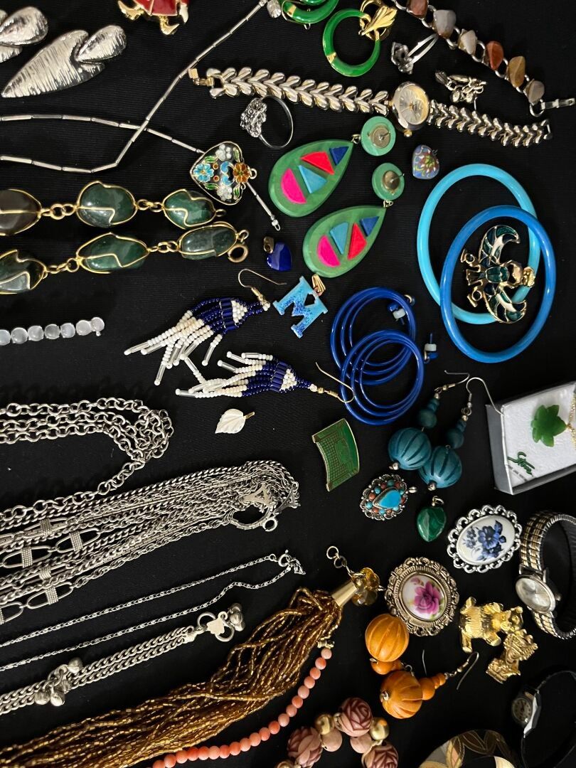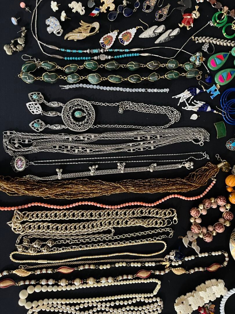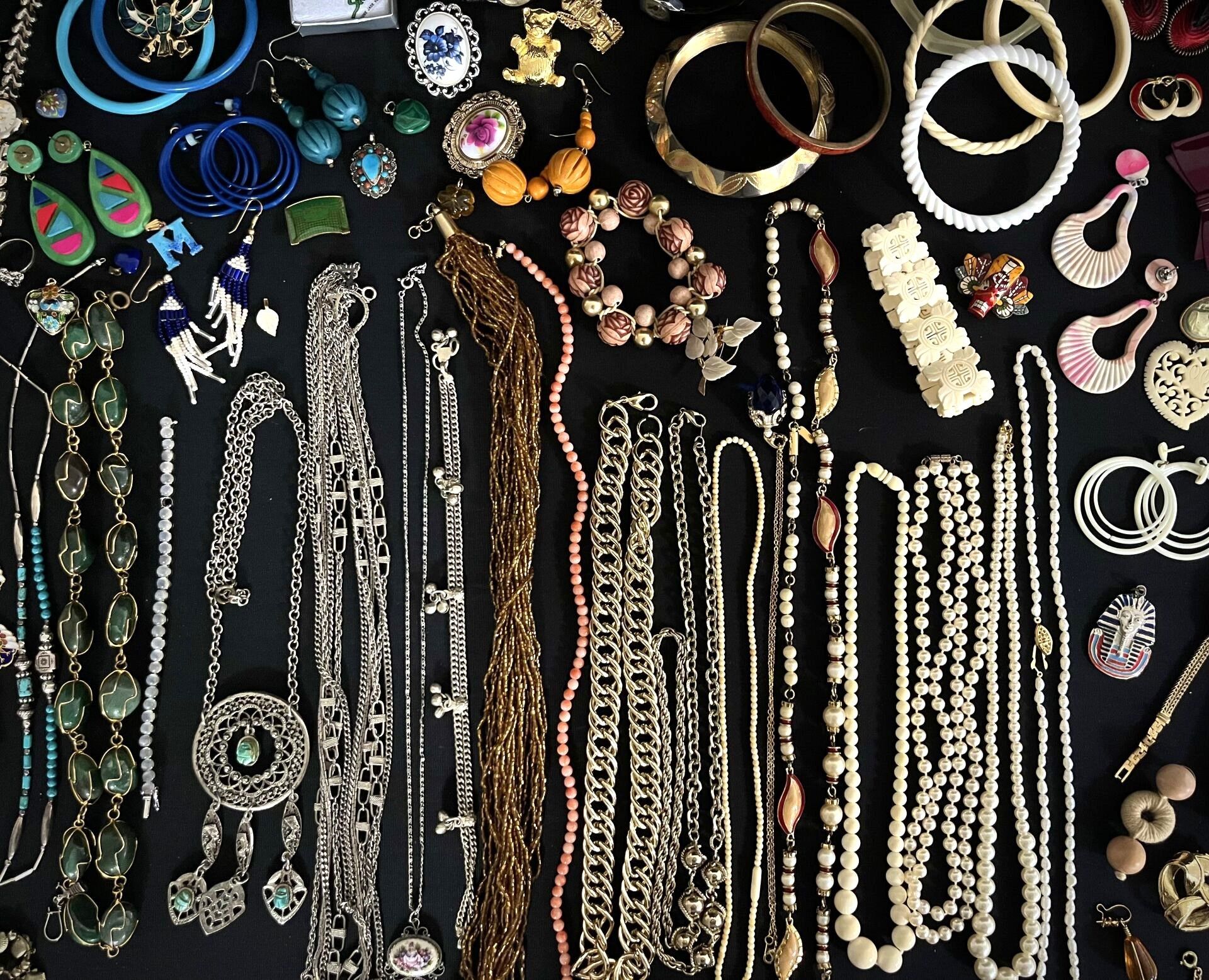 [Fantasy]. LOT of costume jewellery in gold and silver plated metal, bakelite, costume stones, resin and miscellaneous including earrings, pendants, chains, necklaces, bracelets and miscellaneous.