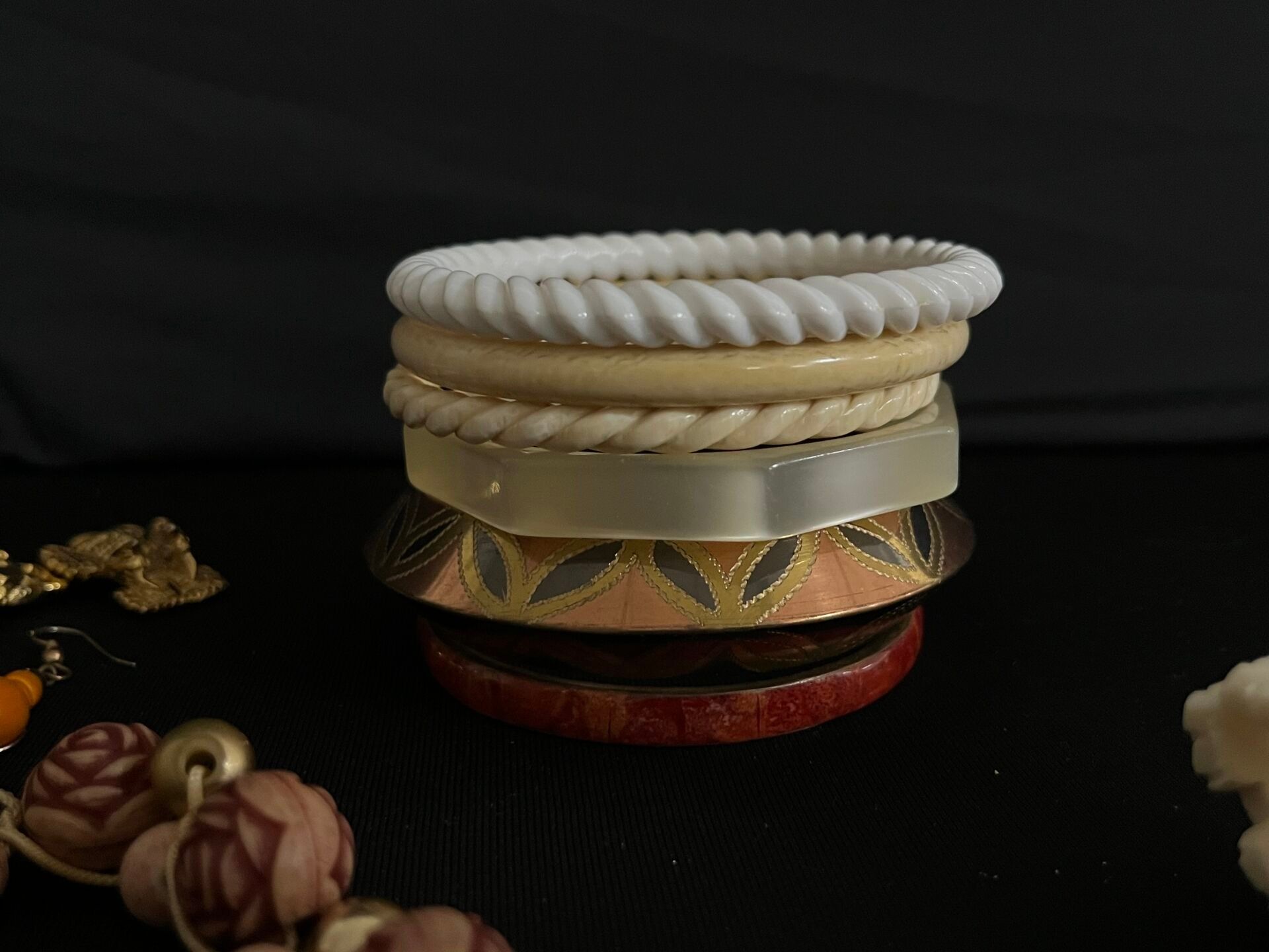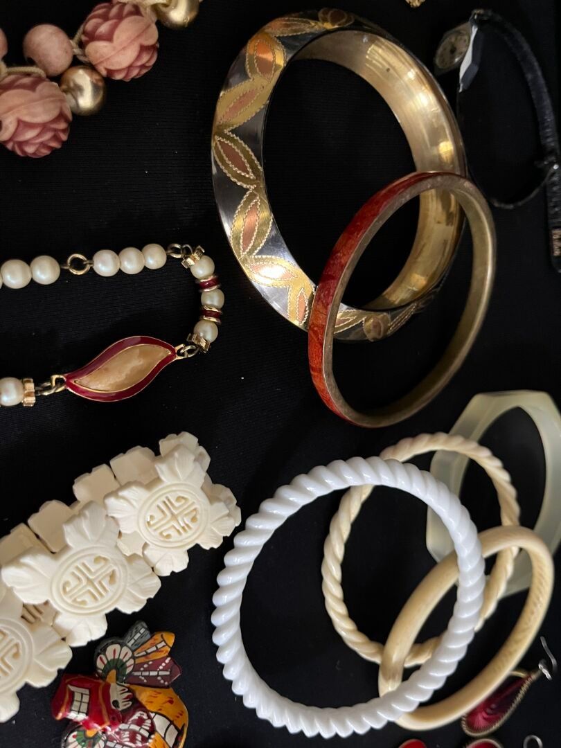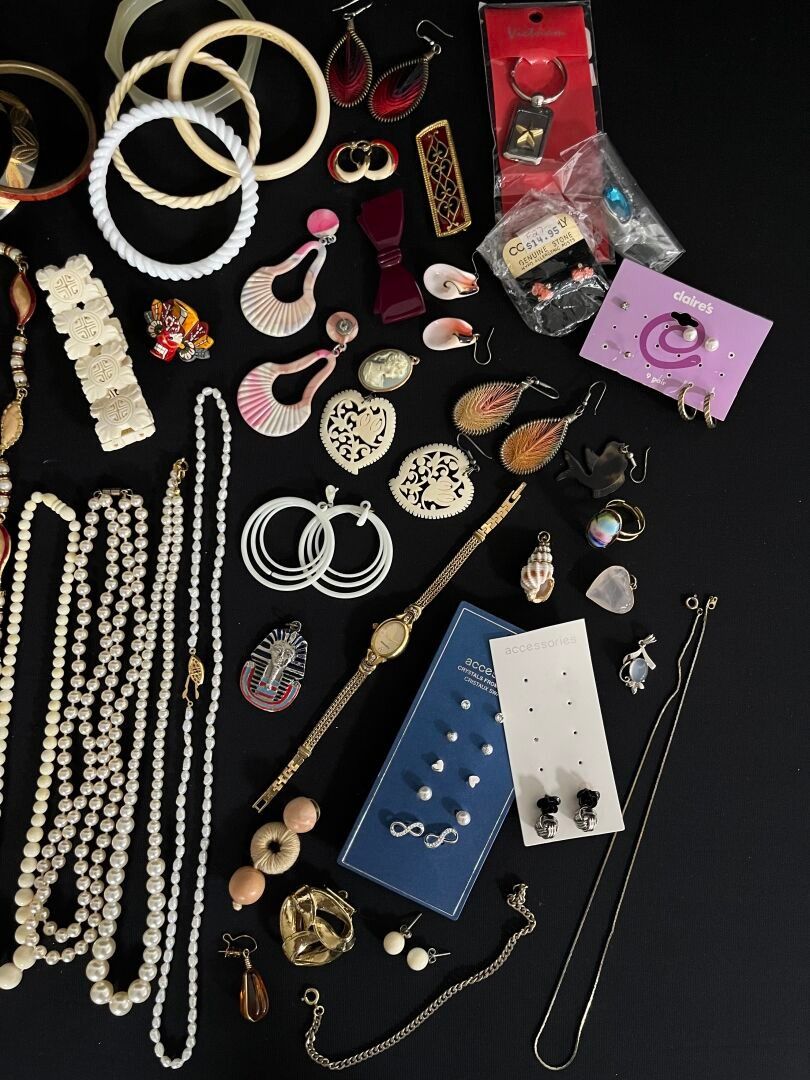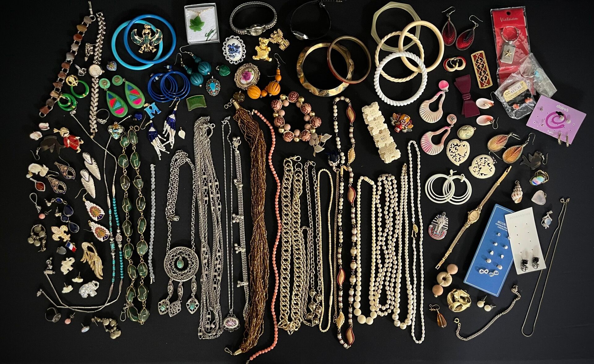 [Fantasy]. LOT of costume jewellery in gold and silver plated metal, bakelite, costume stones, resin and miscellaneous including earrings, pendants, chains, necklaces, bracelets and miscellaneous.
