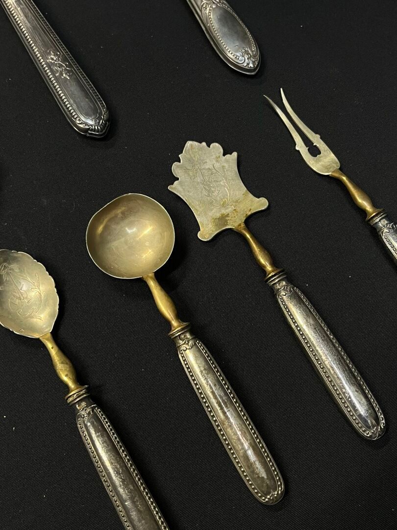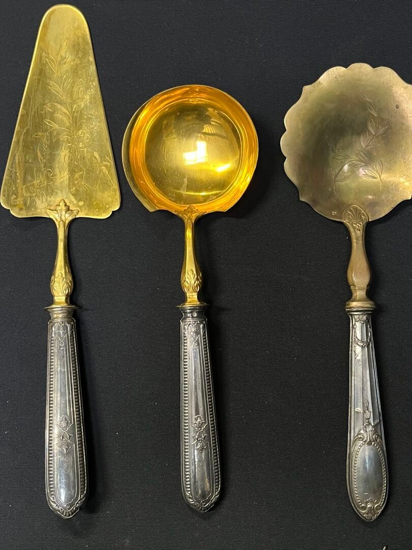 SET of four serving pieces with silver handles decorated with a frieze of pearls.