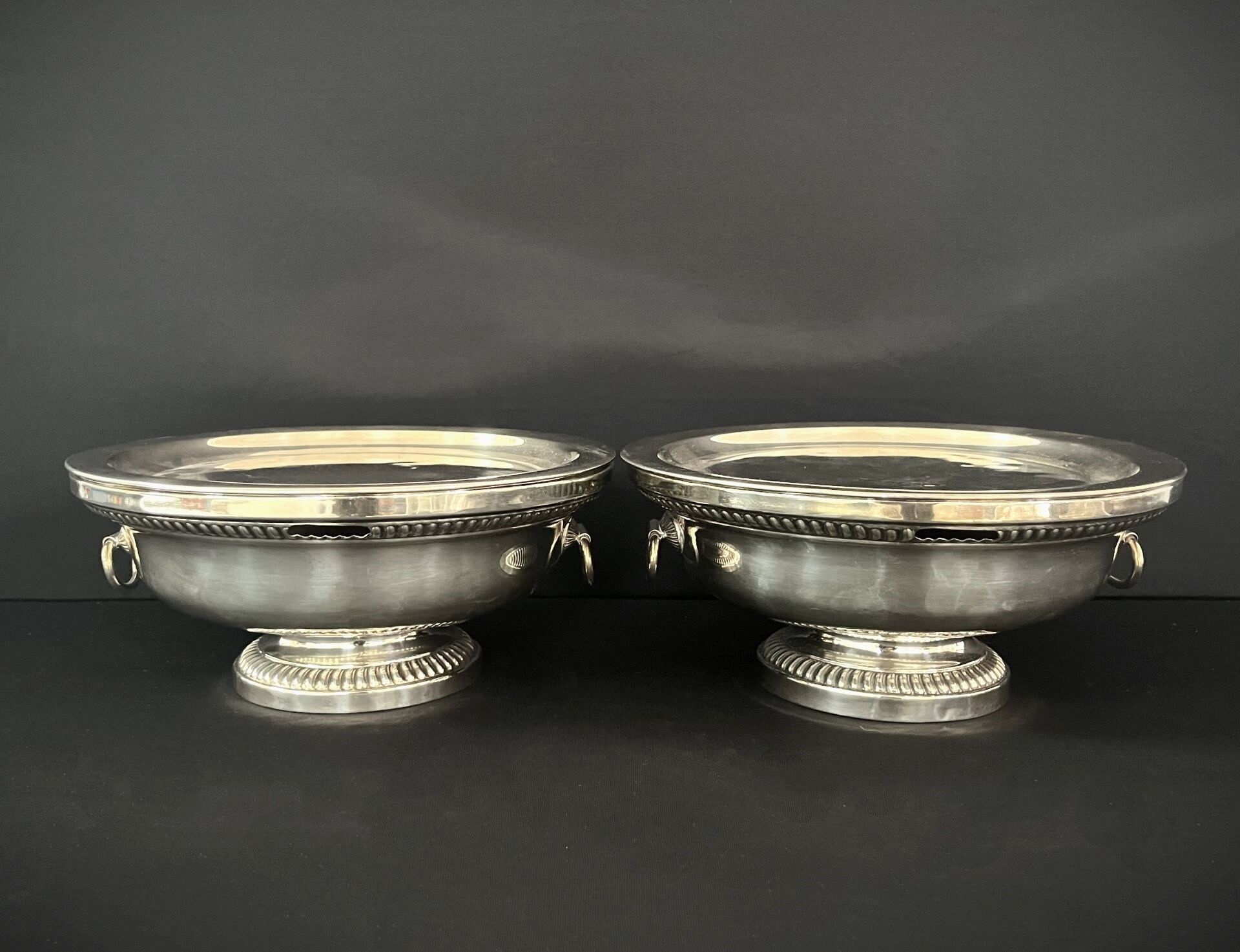 Pair of silver-plated chafing dishes with gadroon repoussé d…