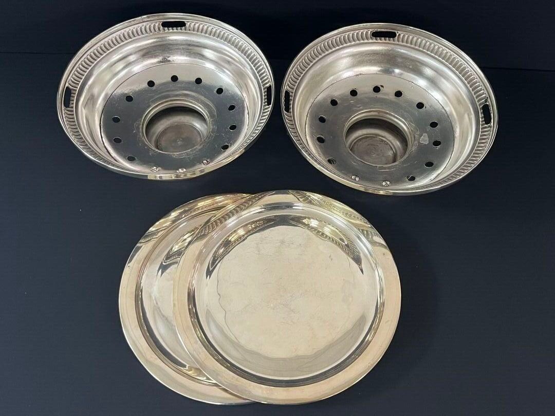 Pair of silver-plated chafing dishes with gadroon repoussé decoration, each with two side handles, standing on a pedestal.