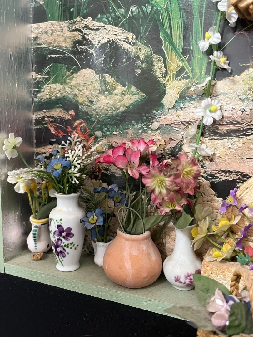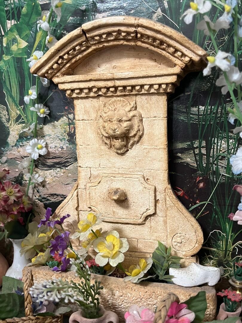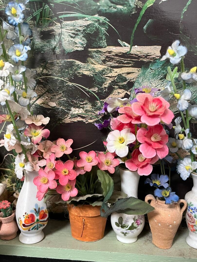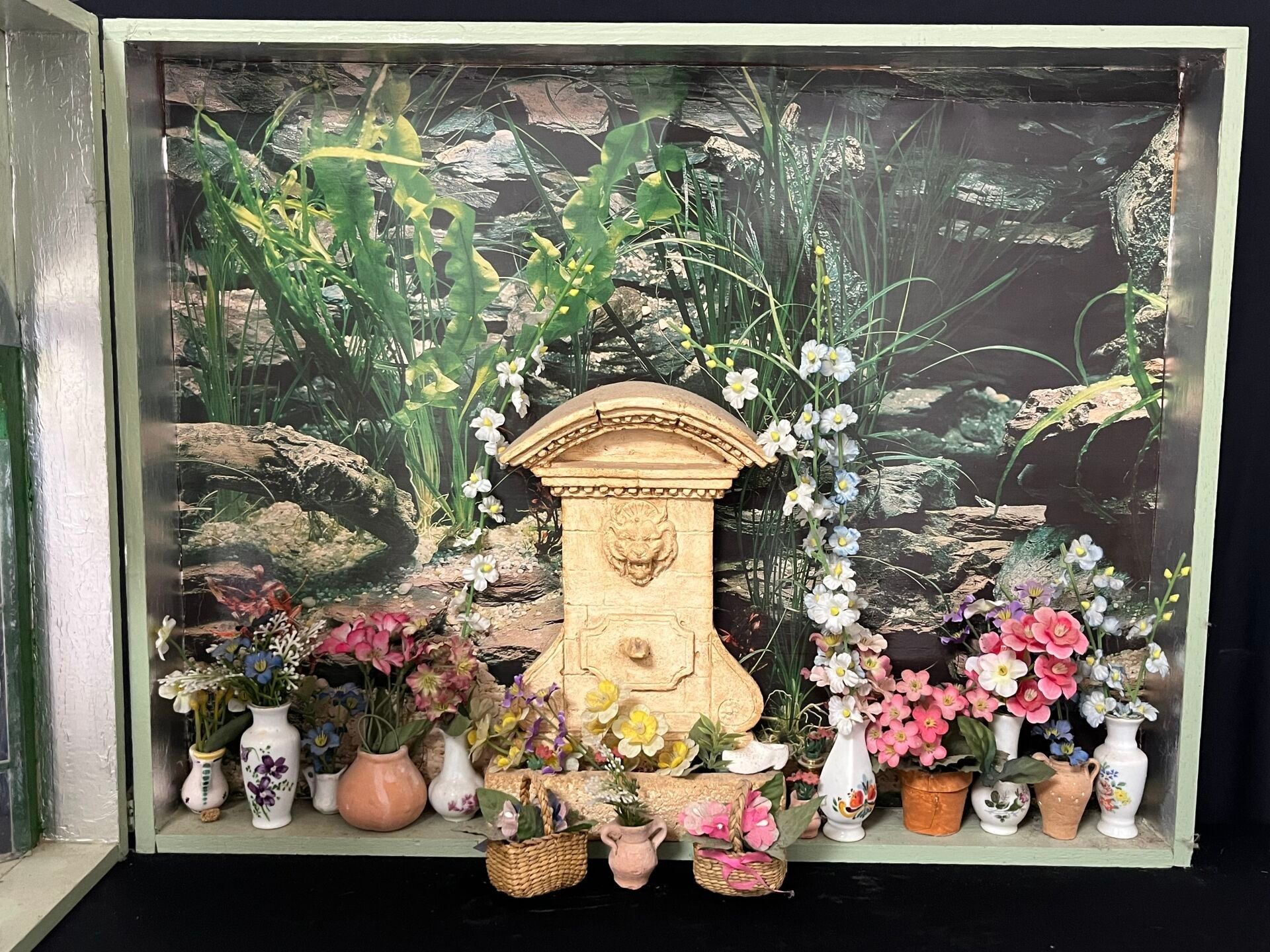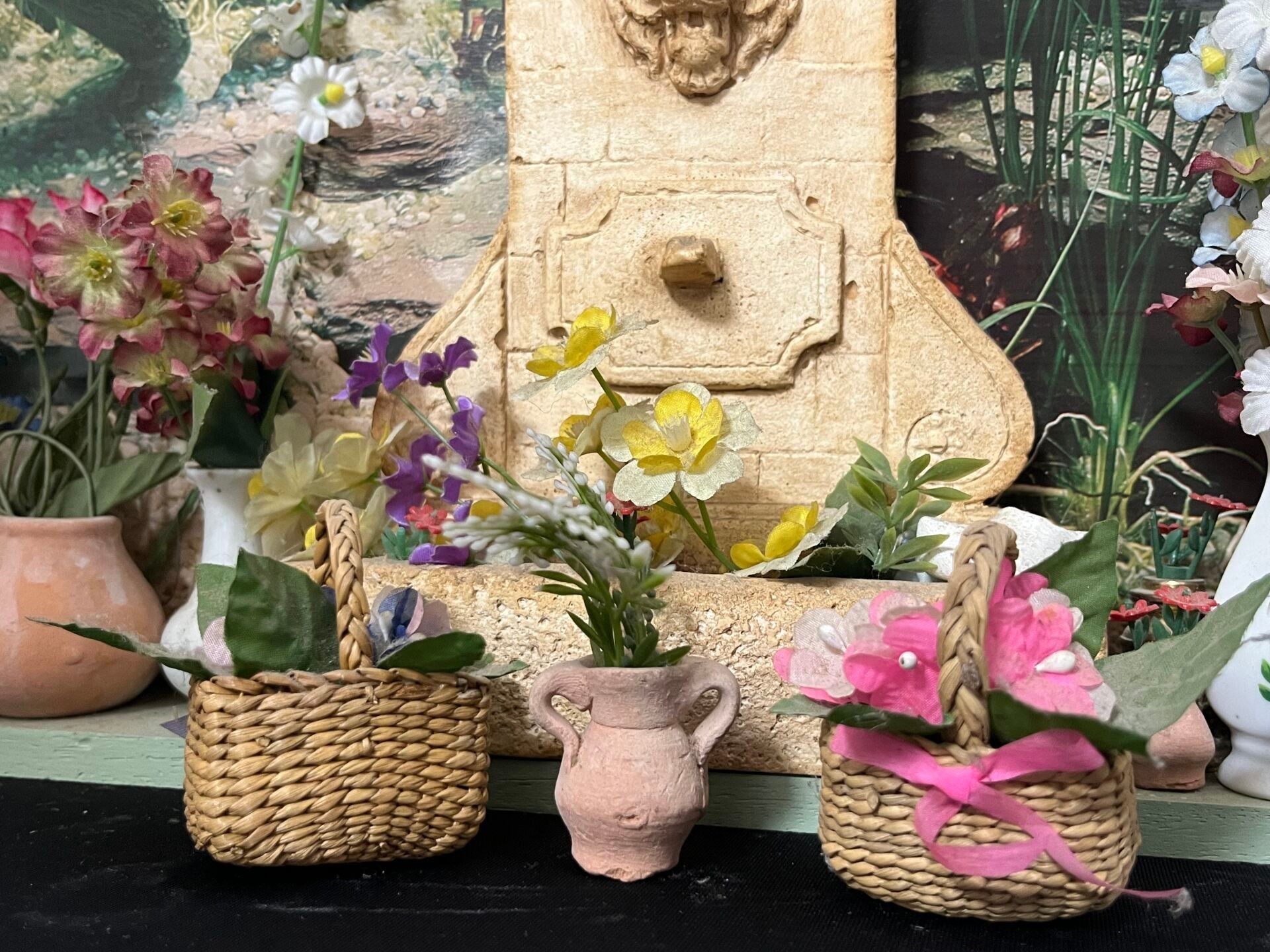 One fountain, various miniature ceramic flower pots and goblets, bouquets of fake flowers and miniature flower baskets are included.