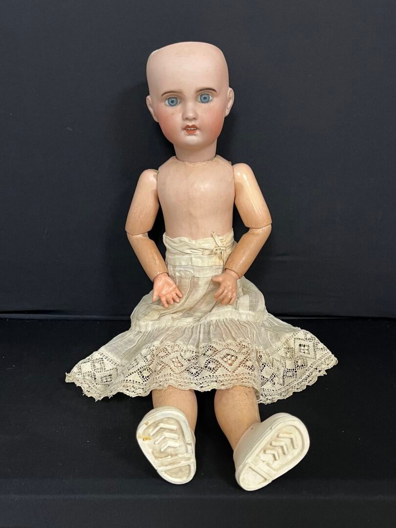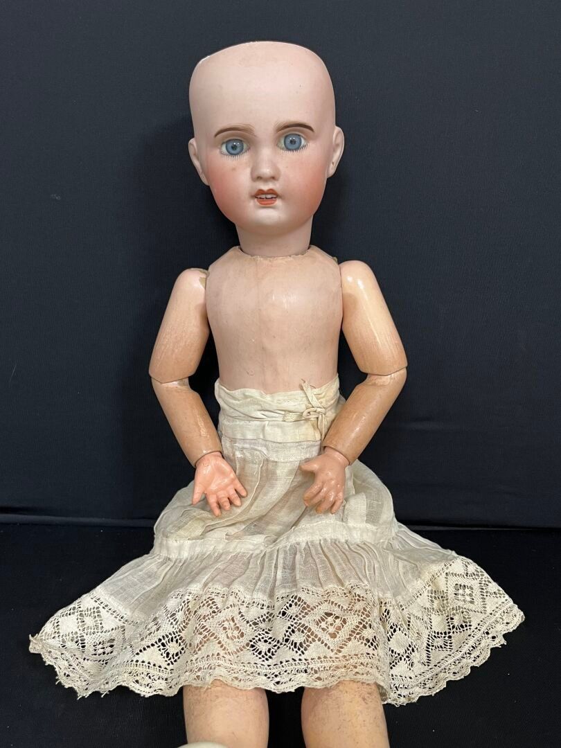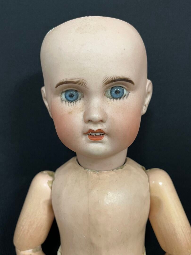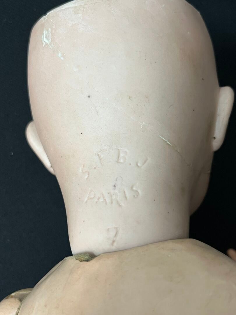 Doll with porcelain head and boiled cardboard body, fixed blue eyes, pierced ears and half-open mouth. Embossed "SFBJ paris 7" on the nape of the neck.