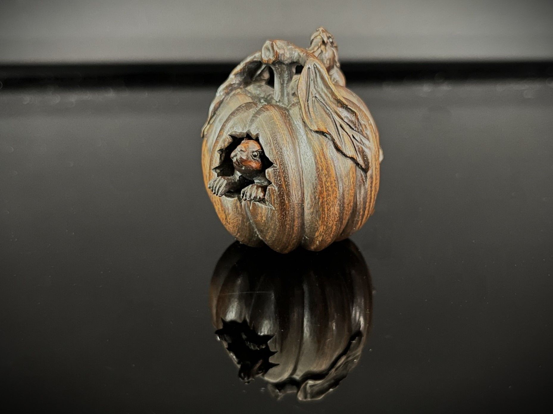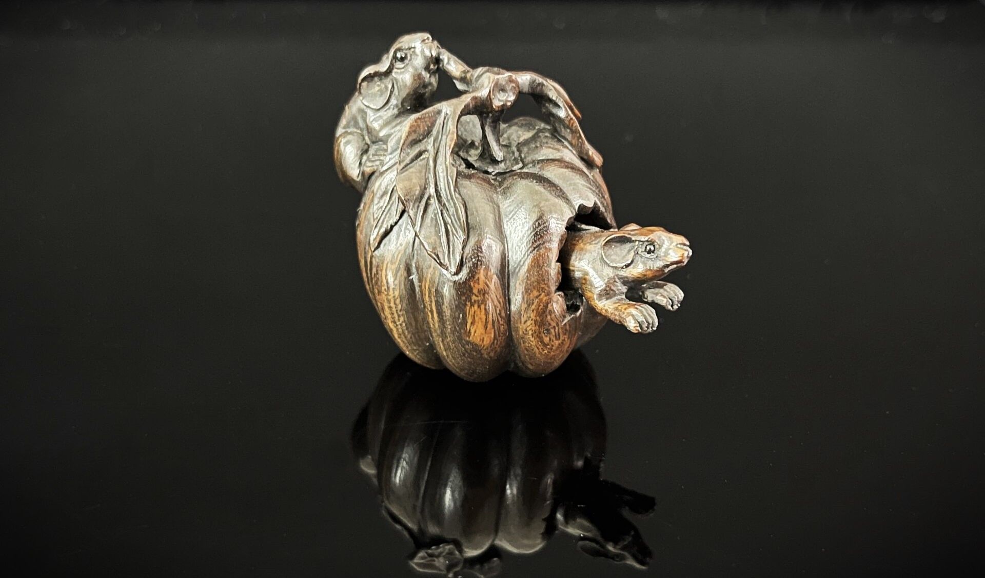 NETSUKE in carved wood decorated with rats on a gourd, including a mobile rat inside. The eyes are made of glass beads.
