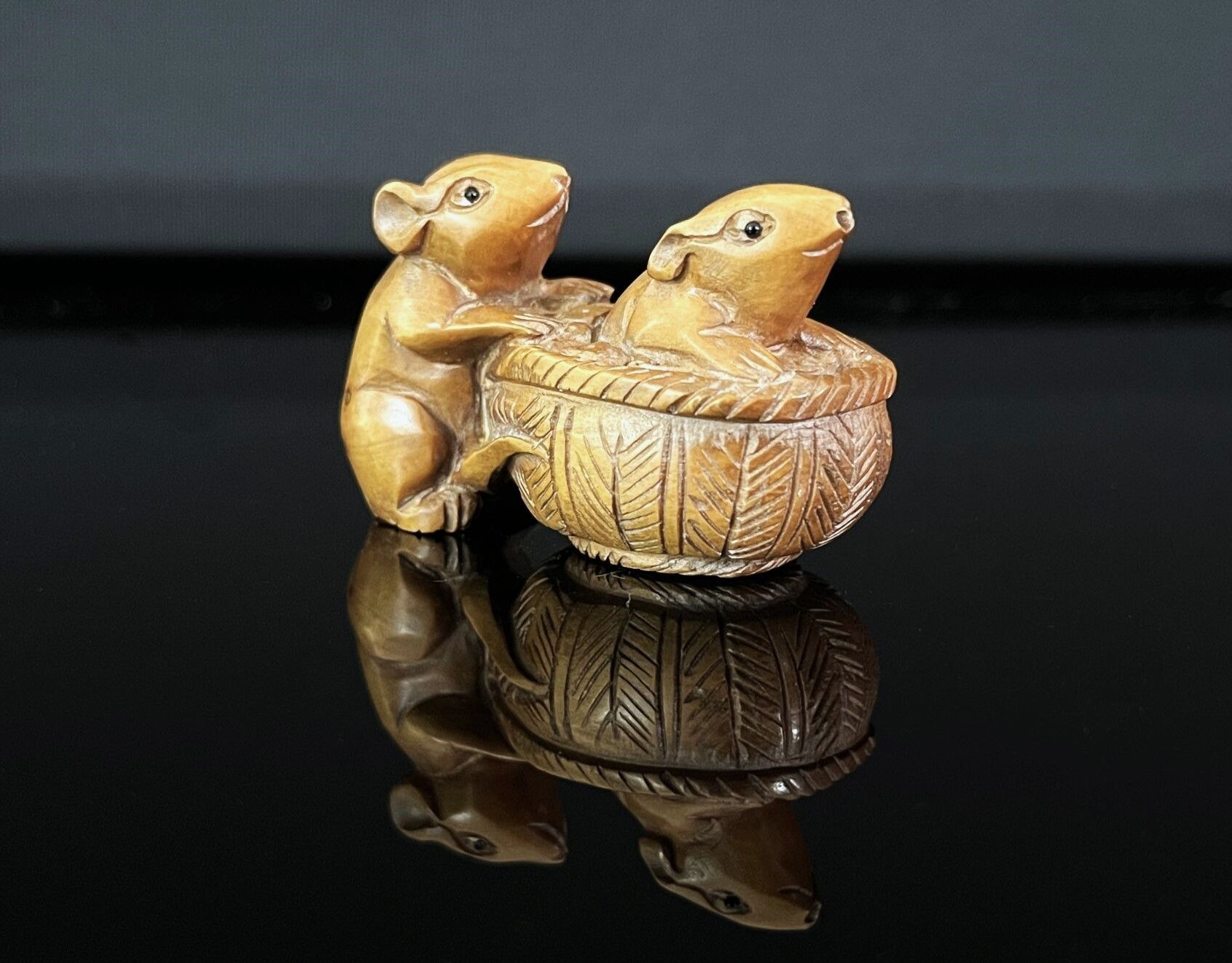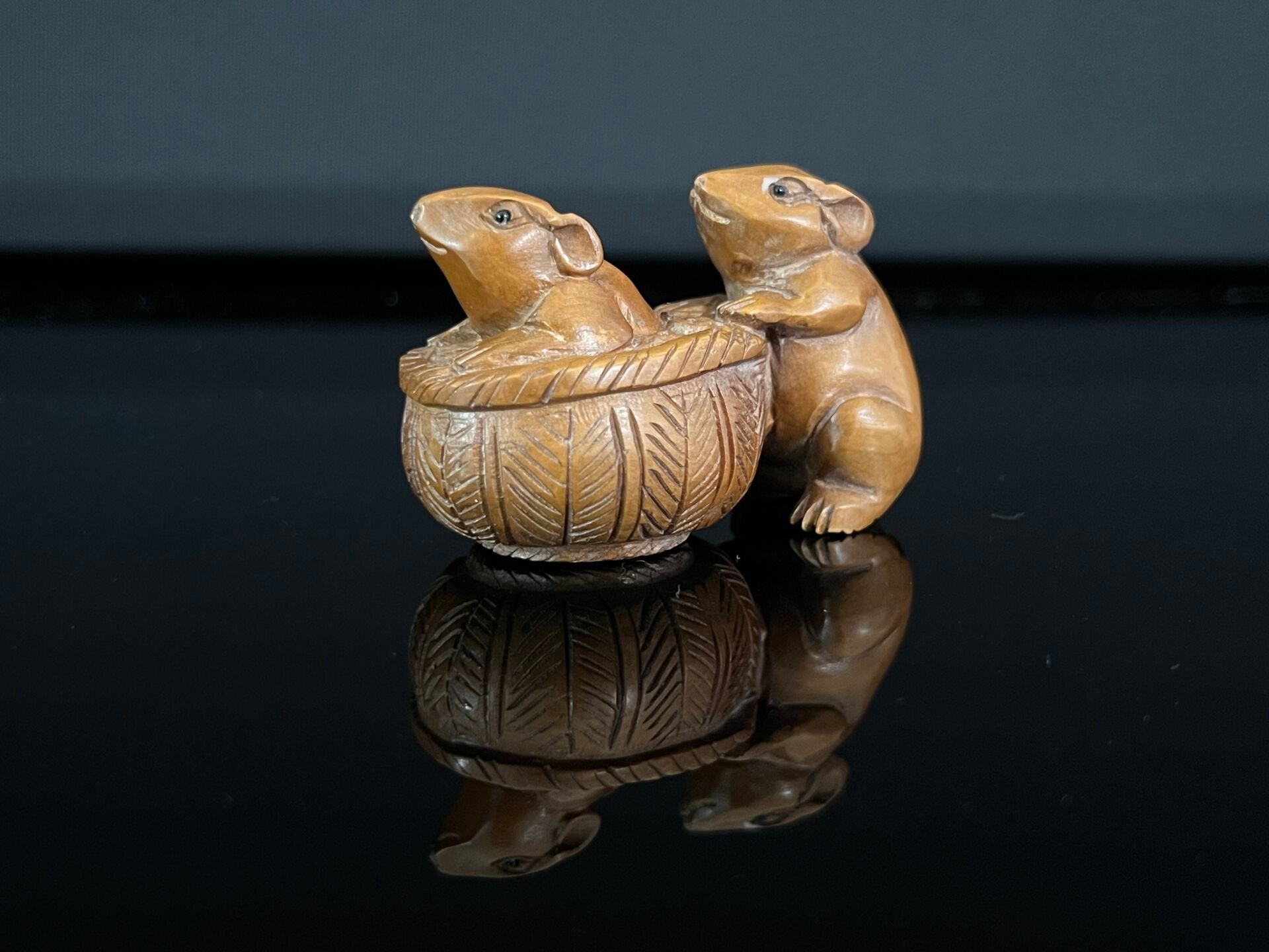 NETSUKE in carved wood decorated with two mice, one in a basket. The eyes are made of glass beads.