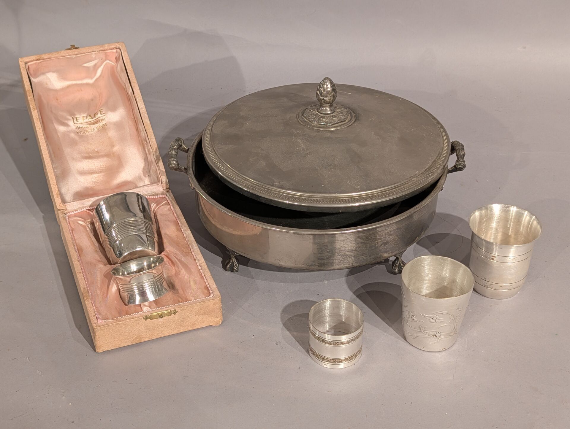 Comprising a dish on four legs and a lid, three kettledrums and two napkin rings