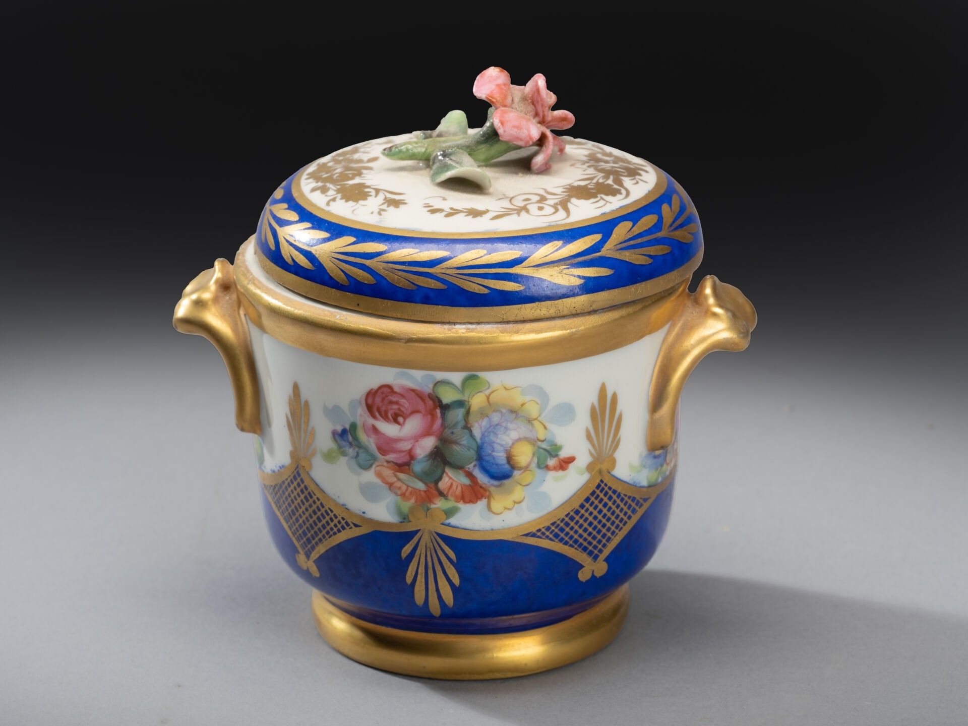 Porcelain covered pot with polychrome decoration of flowers on a blue reserve background, the handle in the shape of flowers