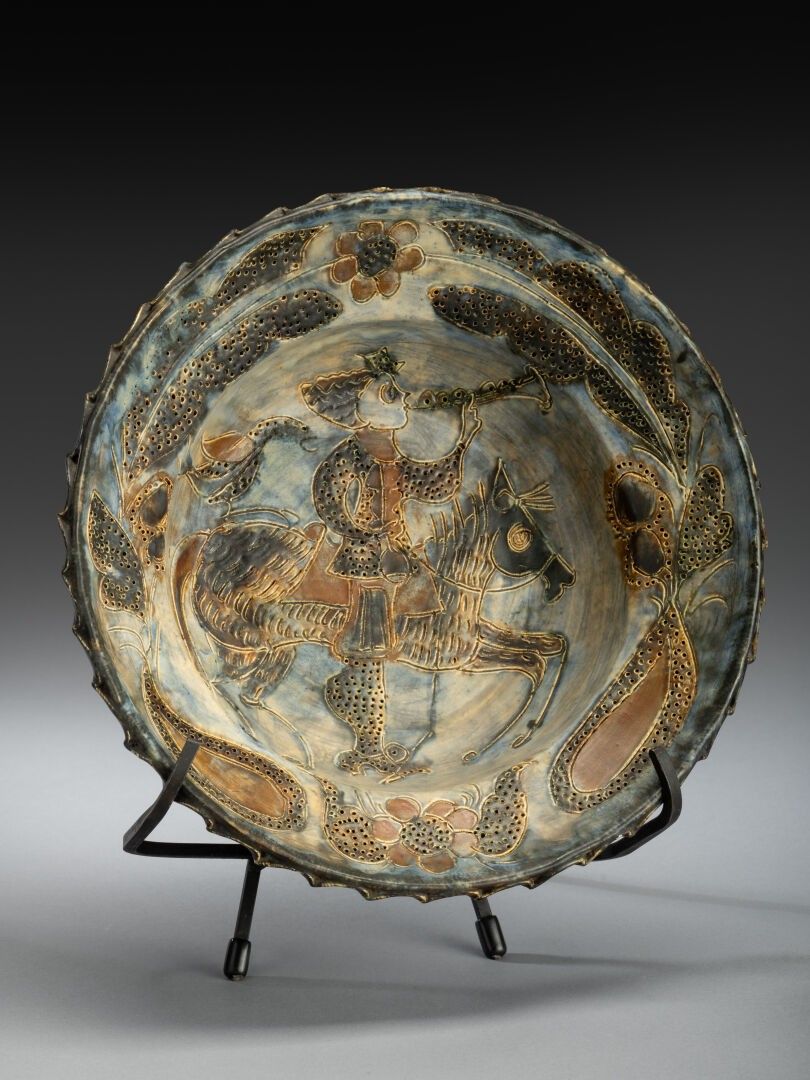 Enamelled stoneware dish decorated with a horseman playing a trumpet