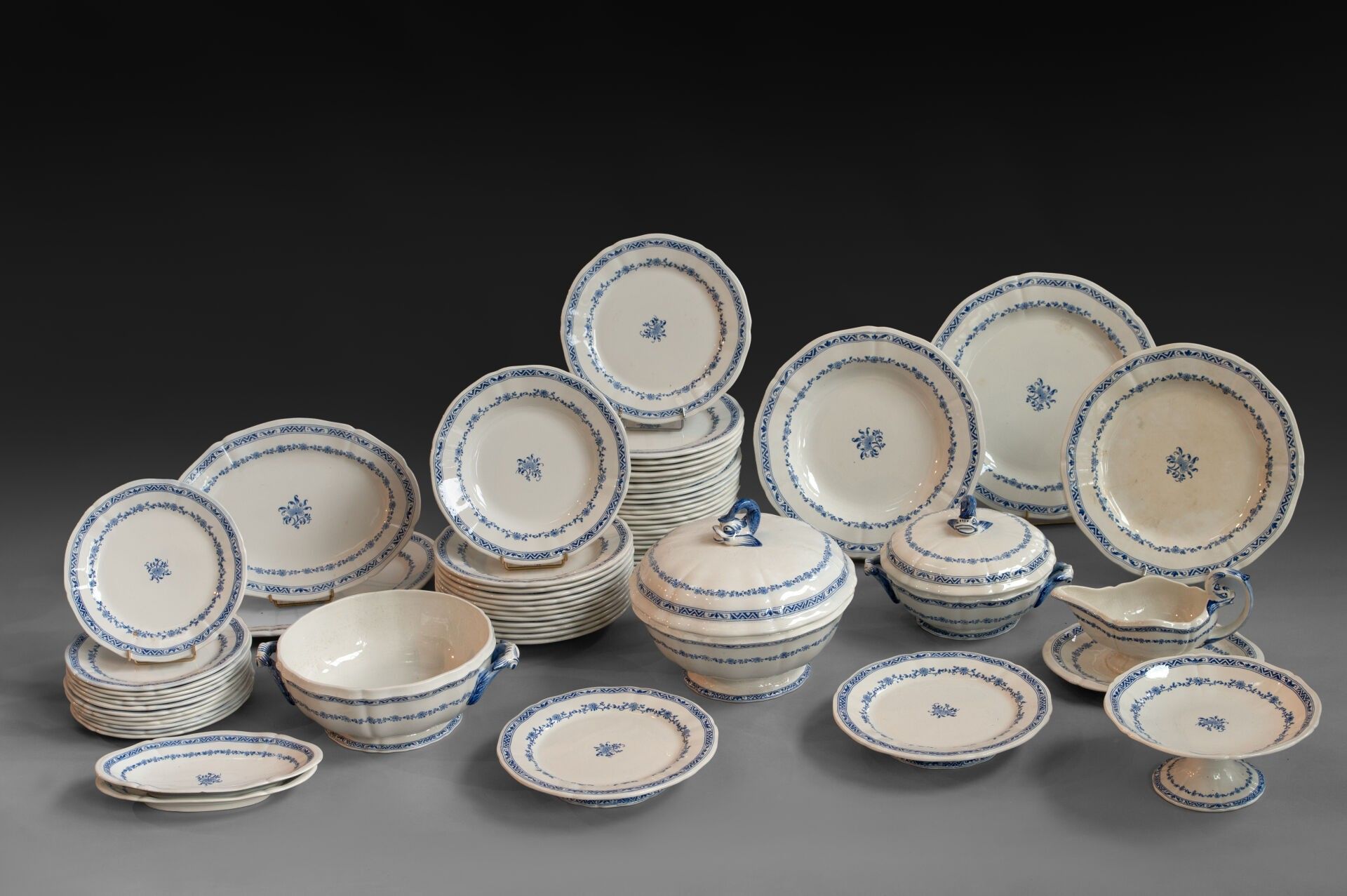 Earthenware dinner service decorated in blue cameo with garlands of flowers