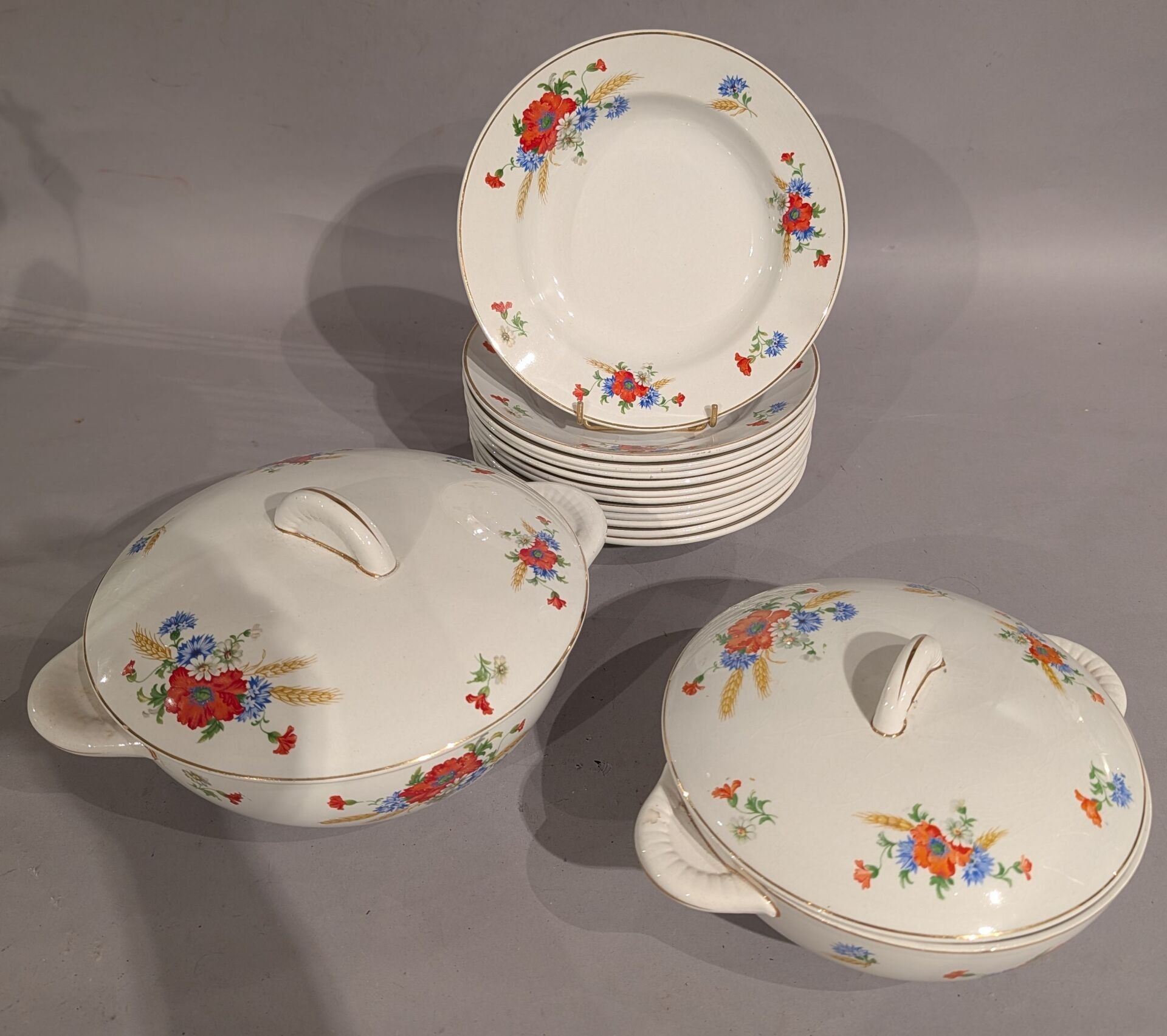 Earthenware soup service decorated with cornflowers, poppies and ears of wheat, gold edging
