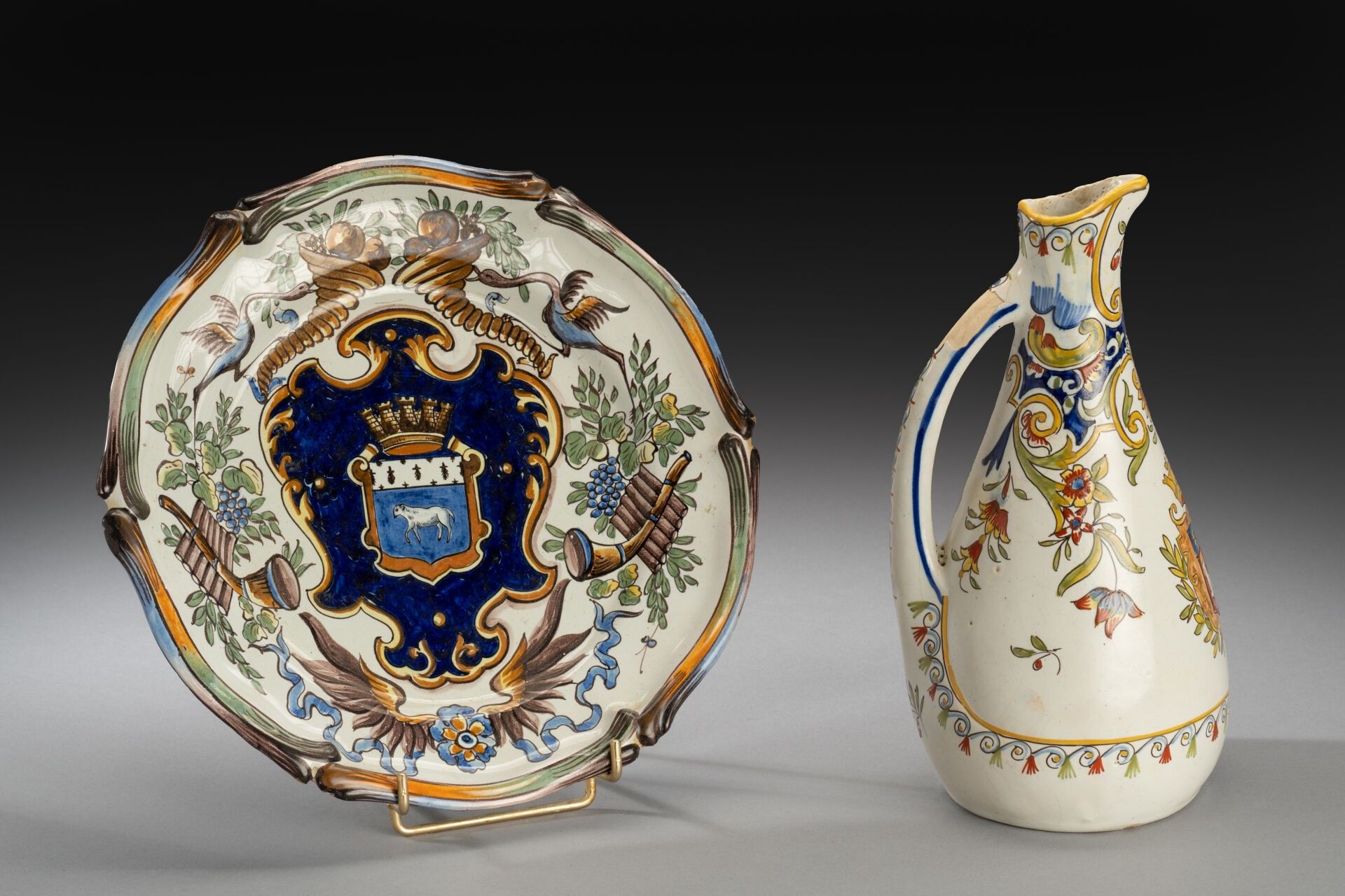 A Rouen earthenware jug decorated with a coat of arms of the town of Quimper.